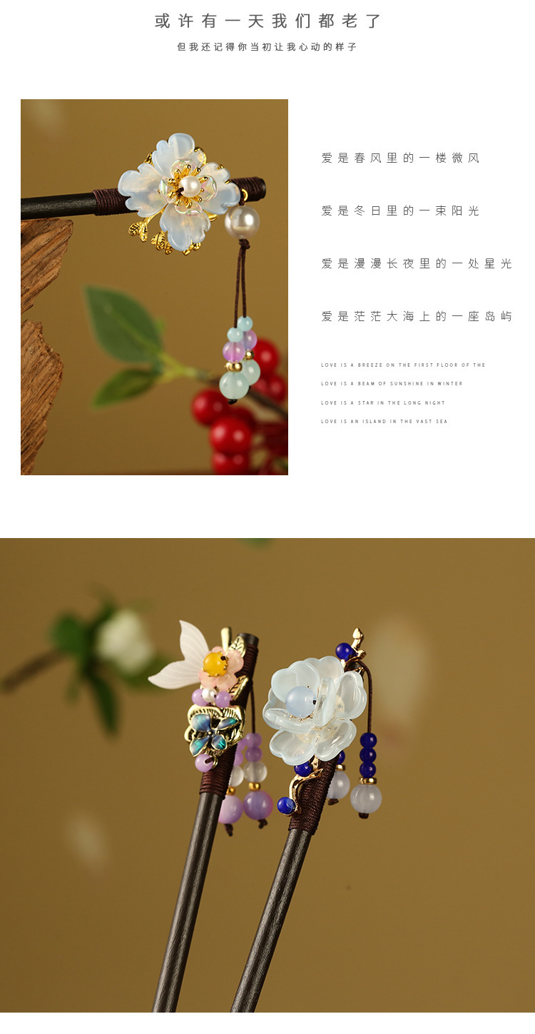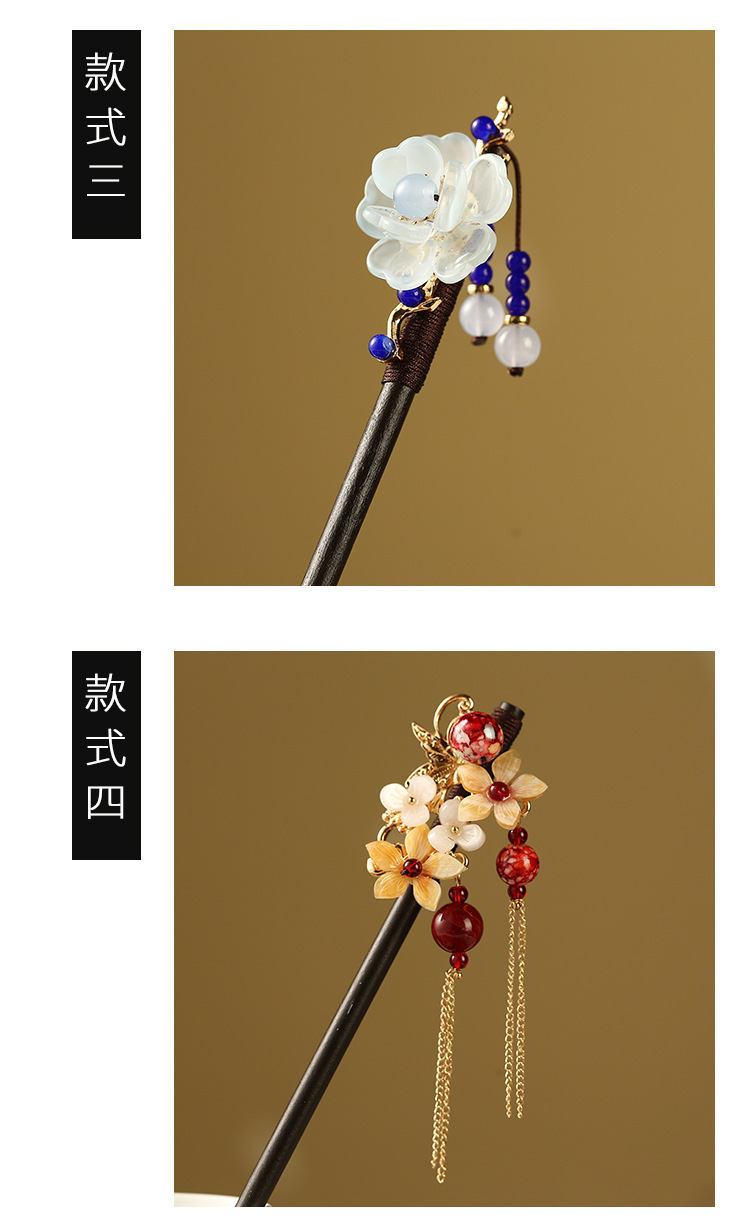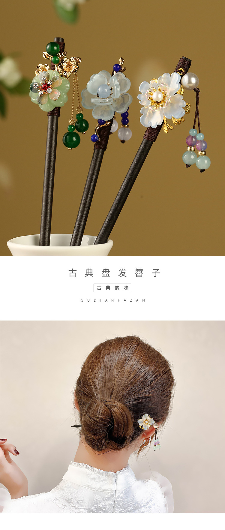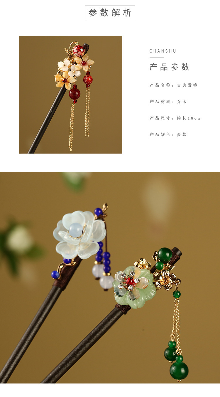 古风流苏步摇发簪仿玉质山茶花黑檀木发钗汉服旗袍盘发配饰簪子女