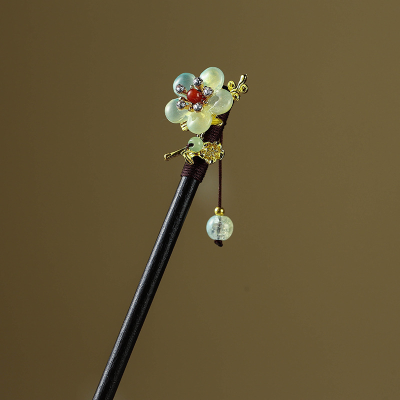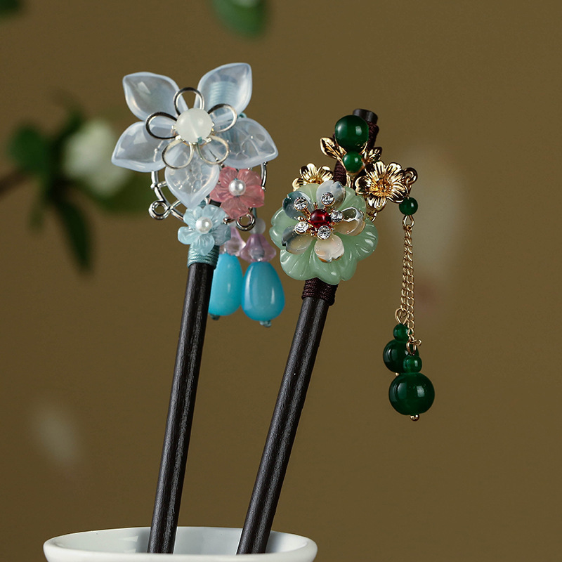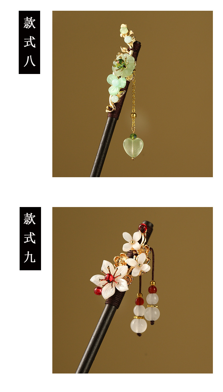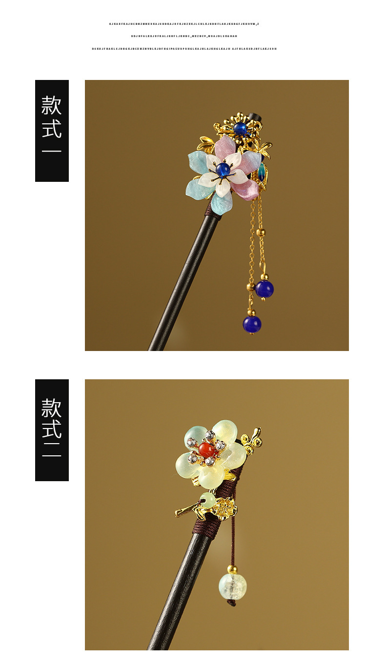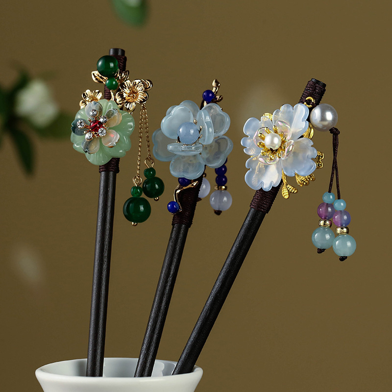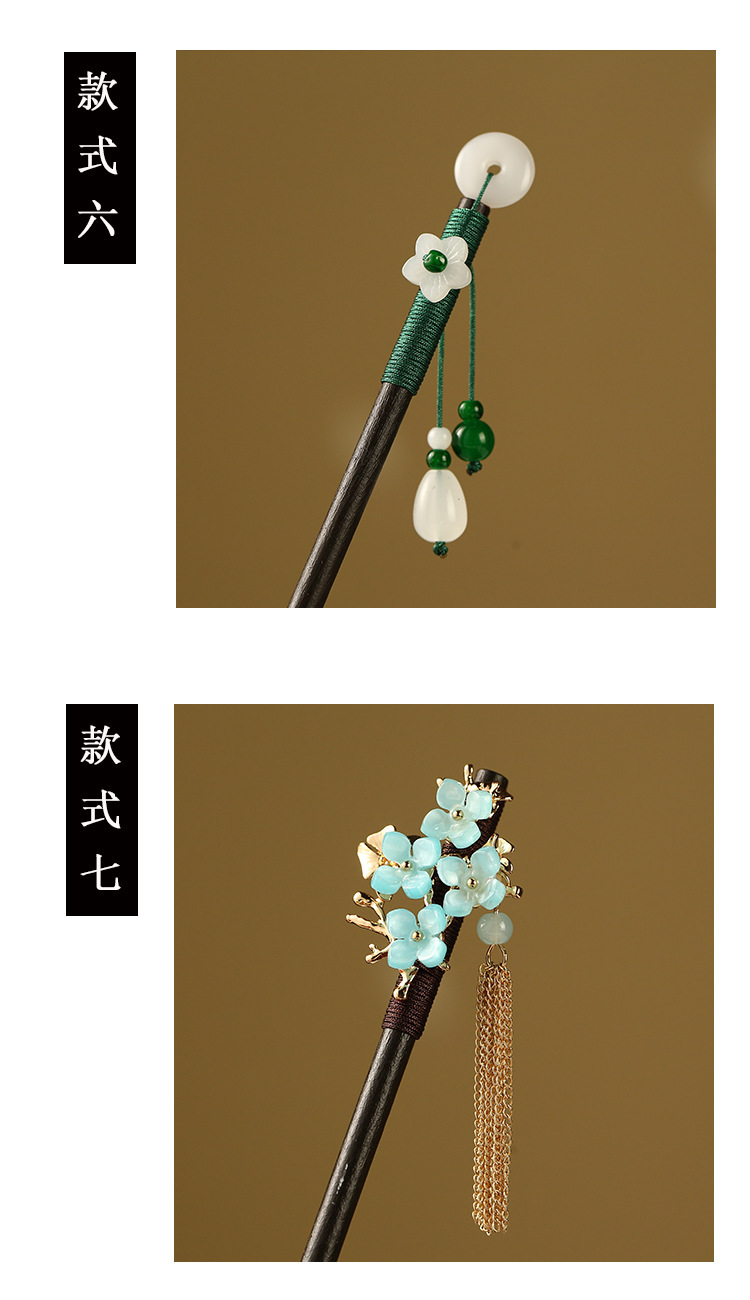古风流苏步摇发簪仿玉质山茶花黑檀木发钗汉服旗袍盘发配饰簪子女