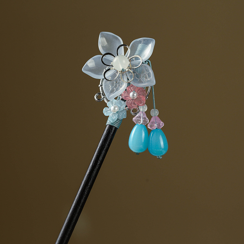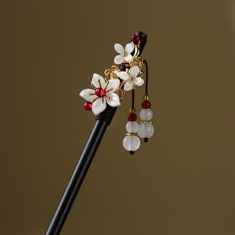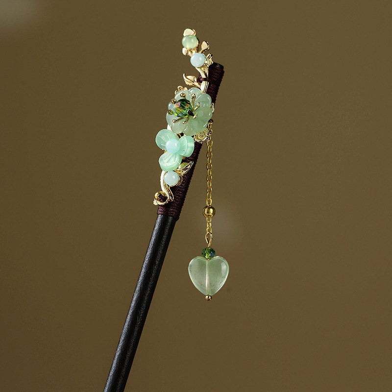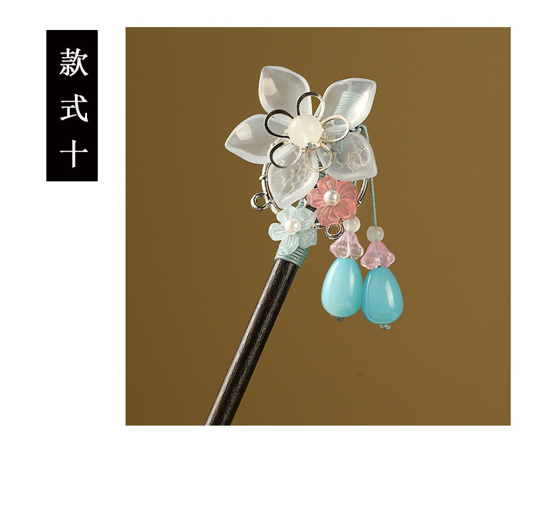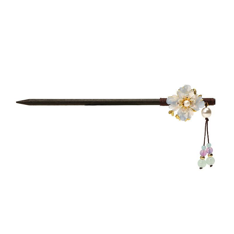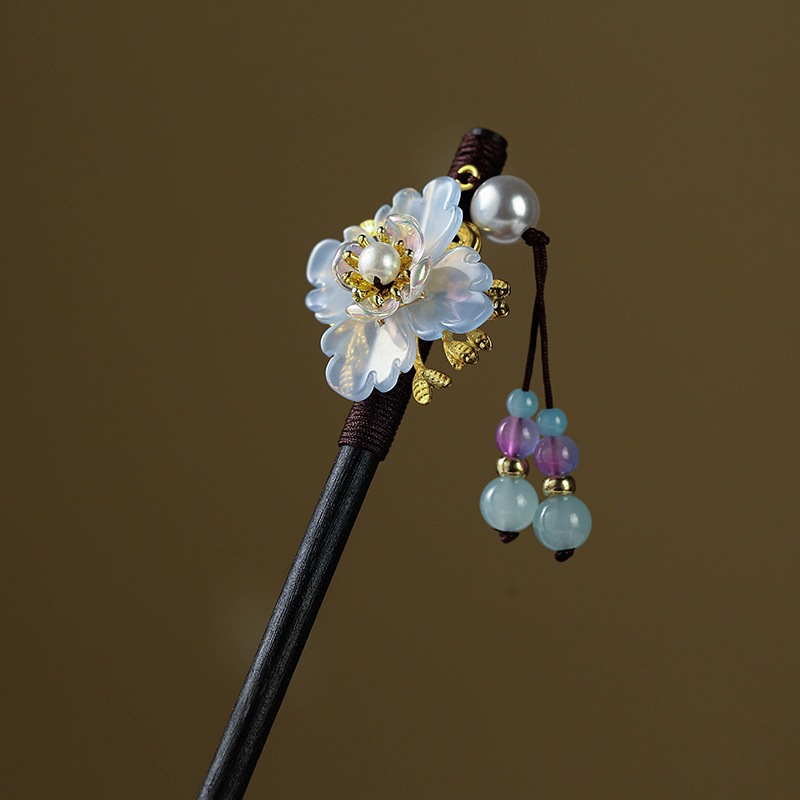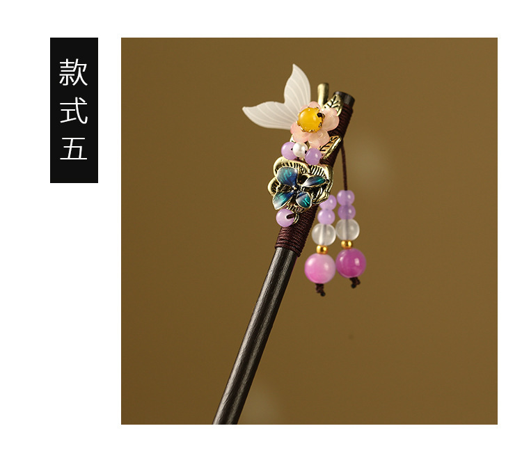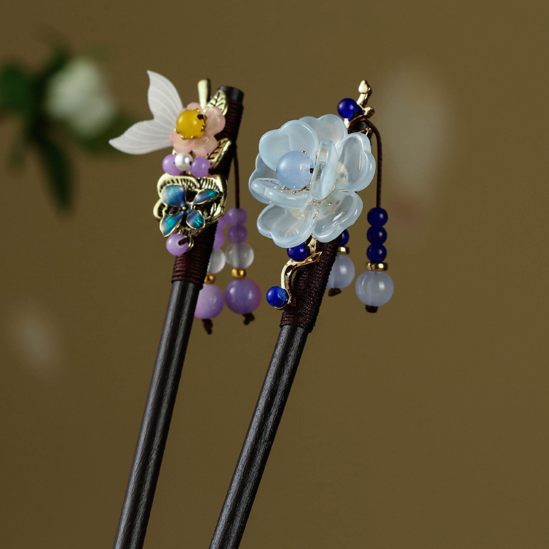 古风流苏步摇发簪仿玉质山茶花黑檀木发钗汉服旗袍盘发配饰簪子女