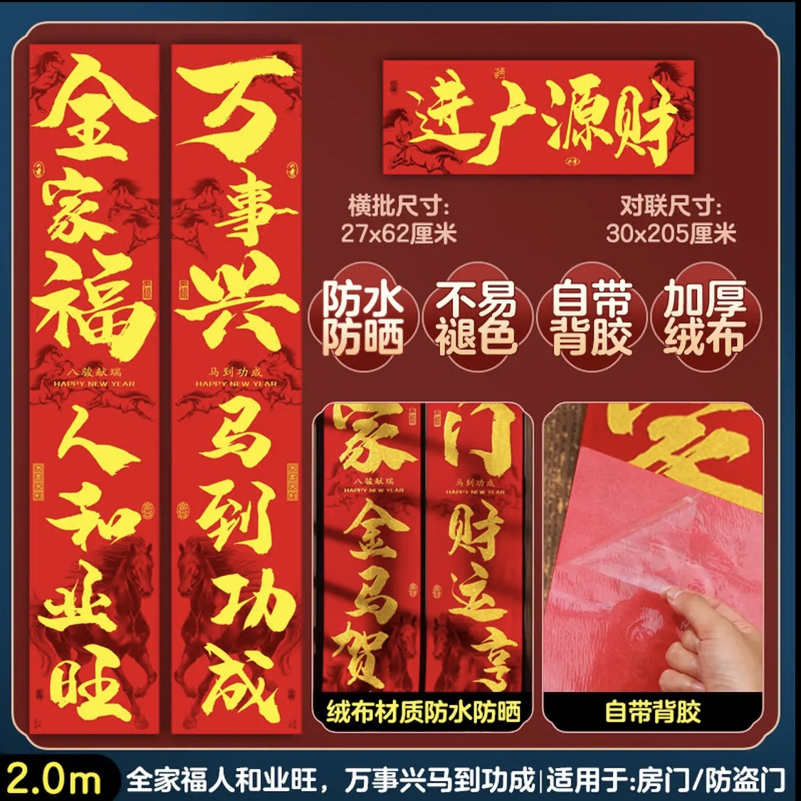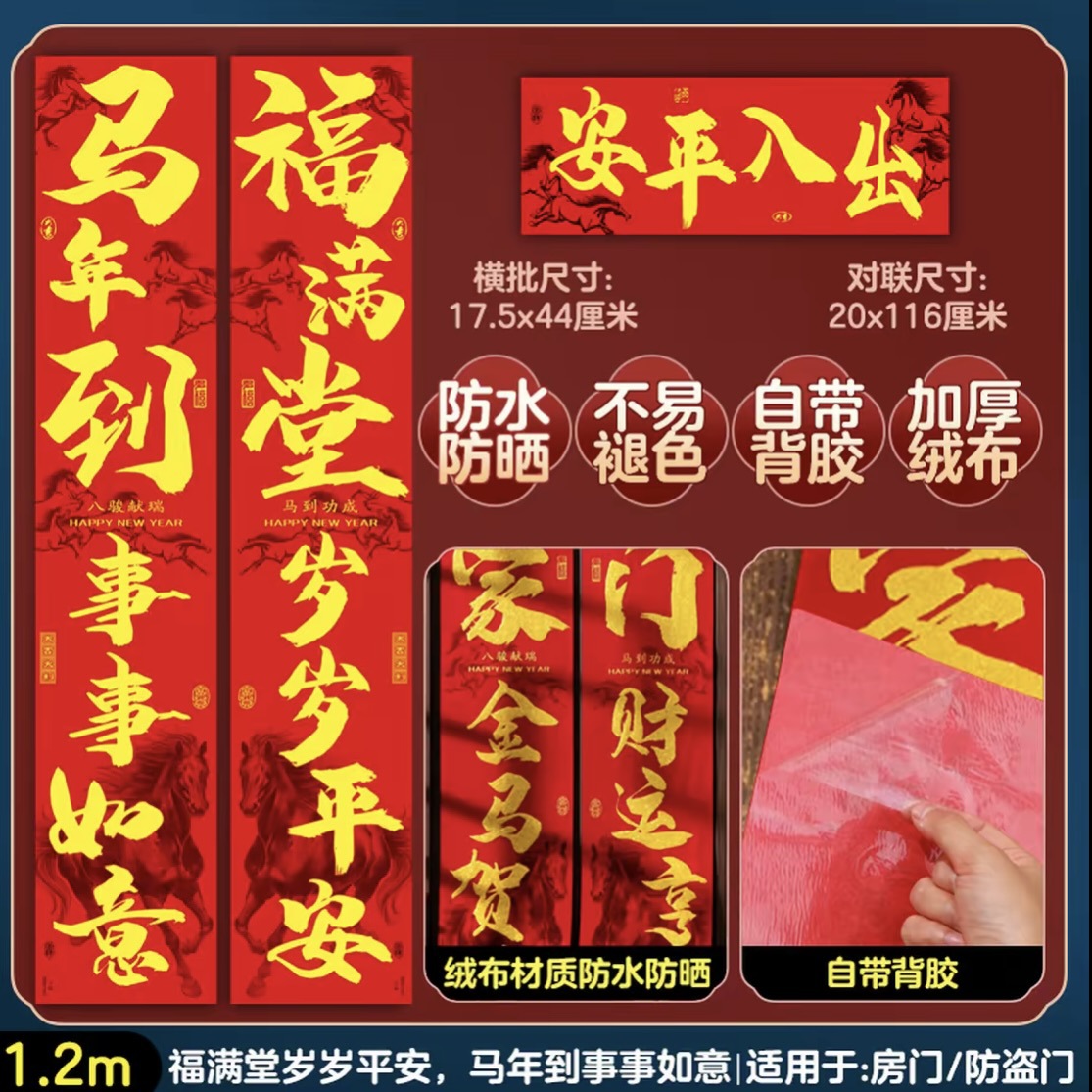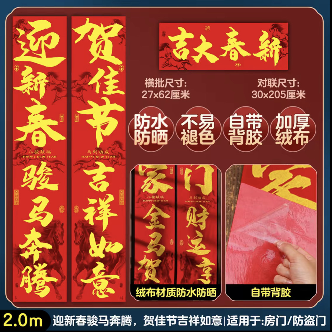 2026马年布对联春节春联自粘绒布生肖对联全背胶书法植绒福字对联
