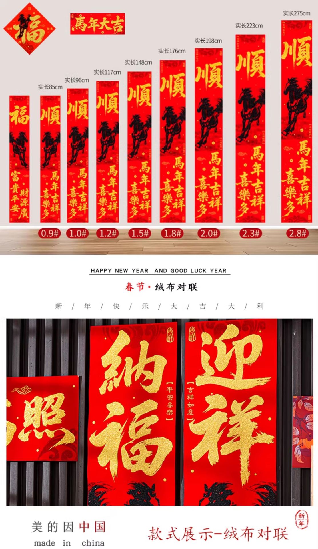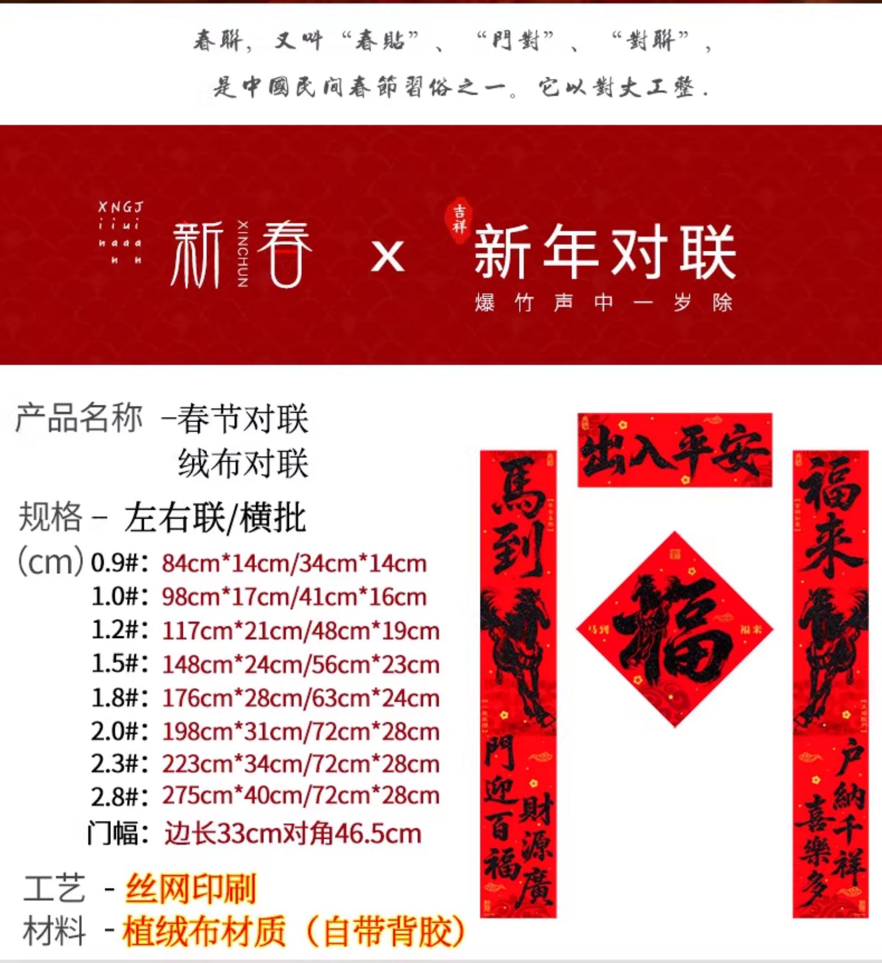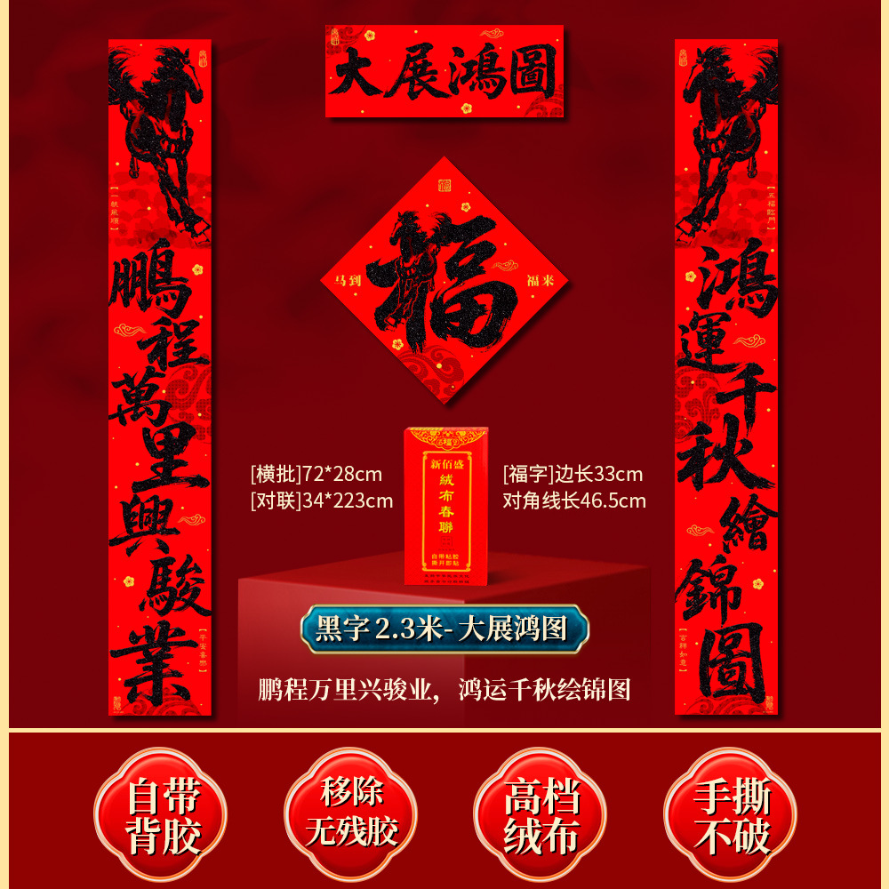 | 马到福来绒布对联(不带福字) | USD $3.7 | 28 piece available |