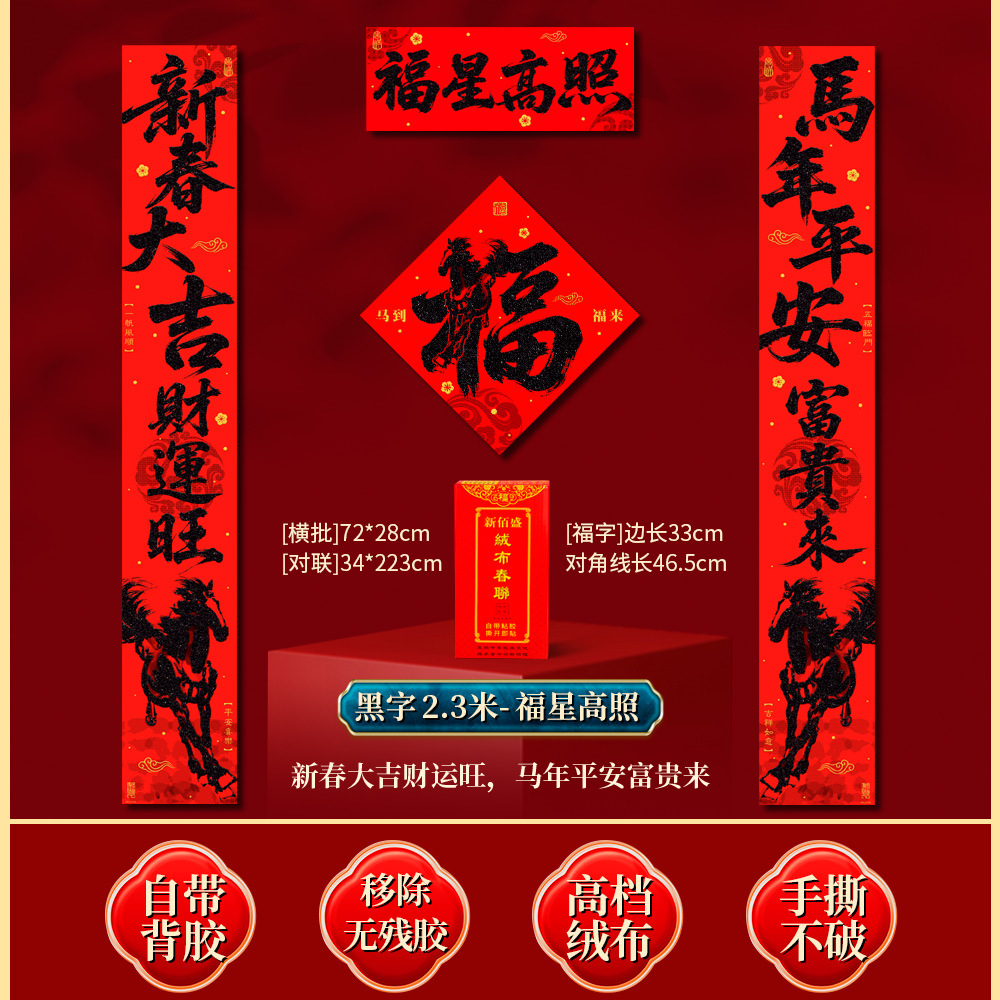 | 马到福来绒布对联(带一张福字) | USD $2.45 | 33 piece available |