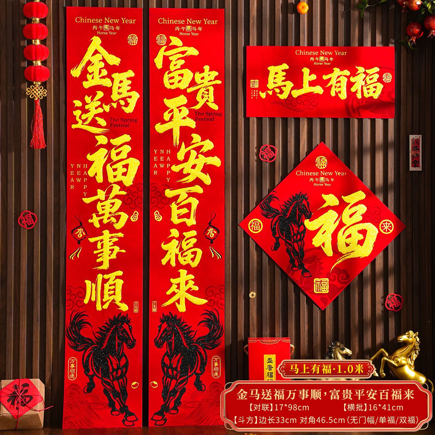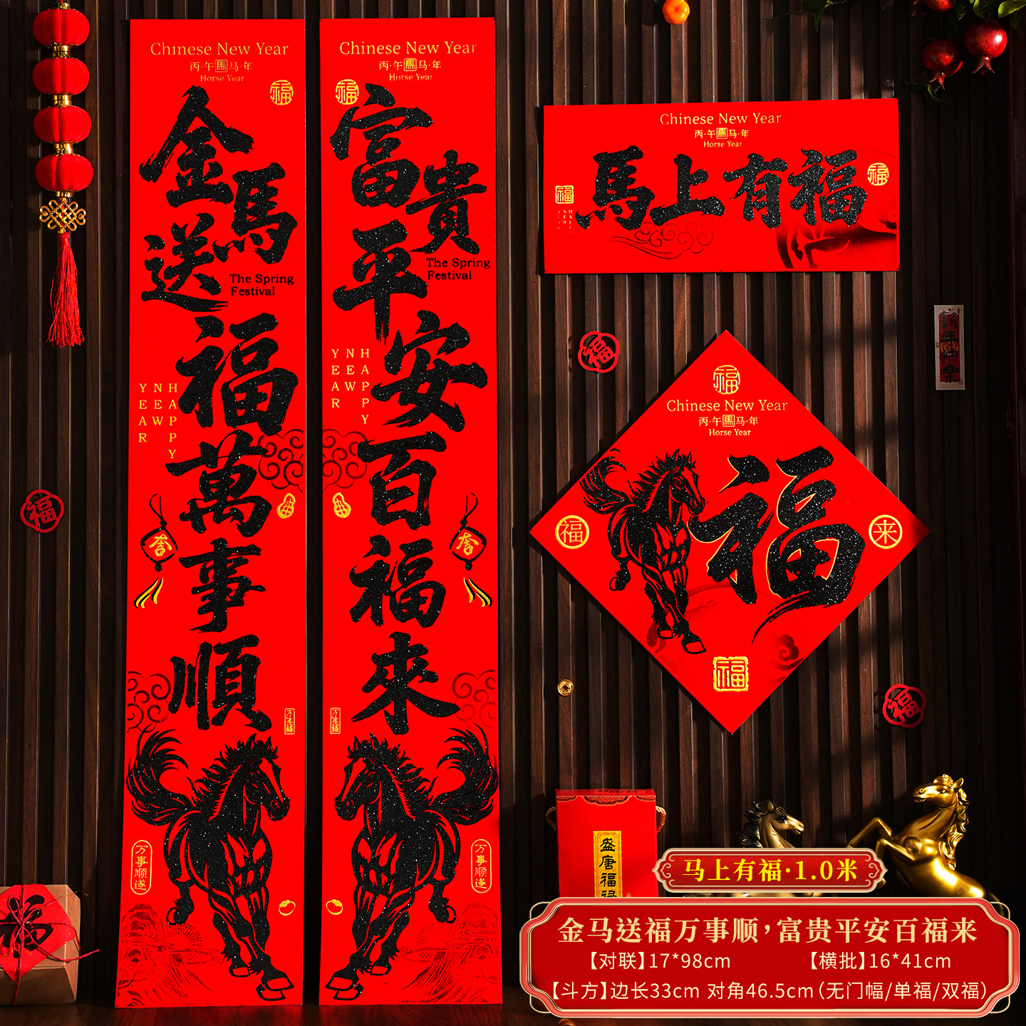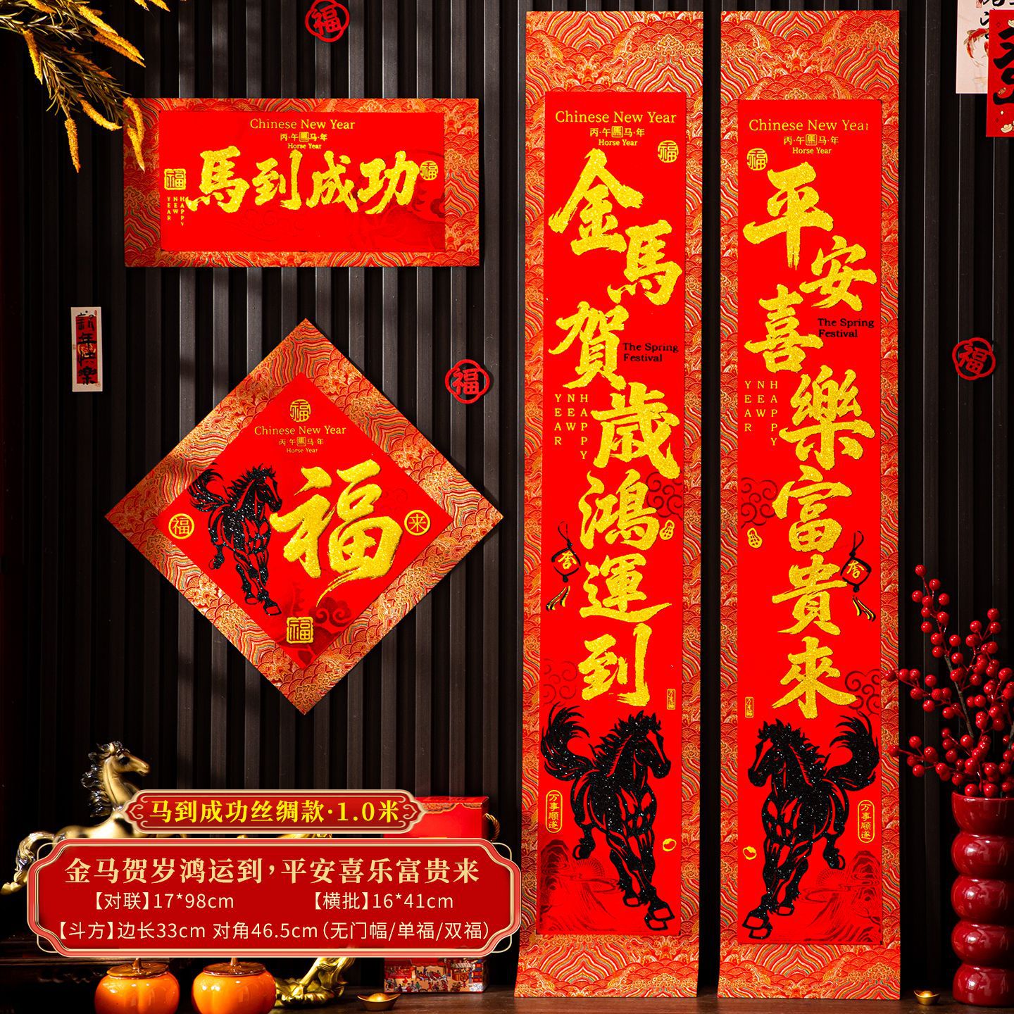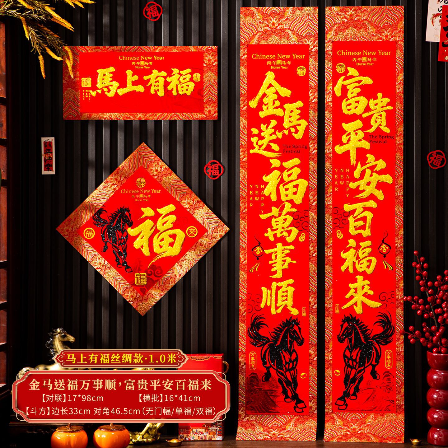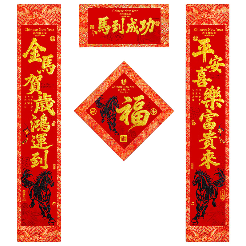 | 【一马当先/宝马奔腾】金粉/黑粉:绒布对联(不带门幅) | USD $2.08 | 2 piece available |