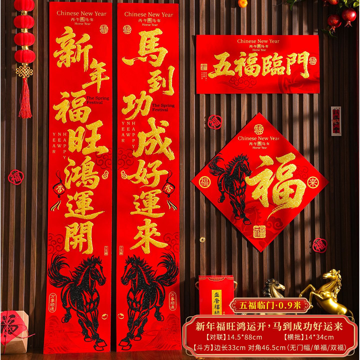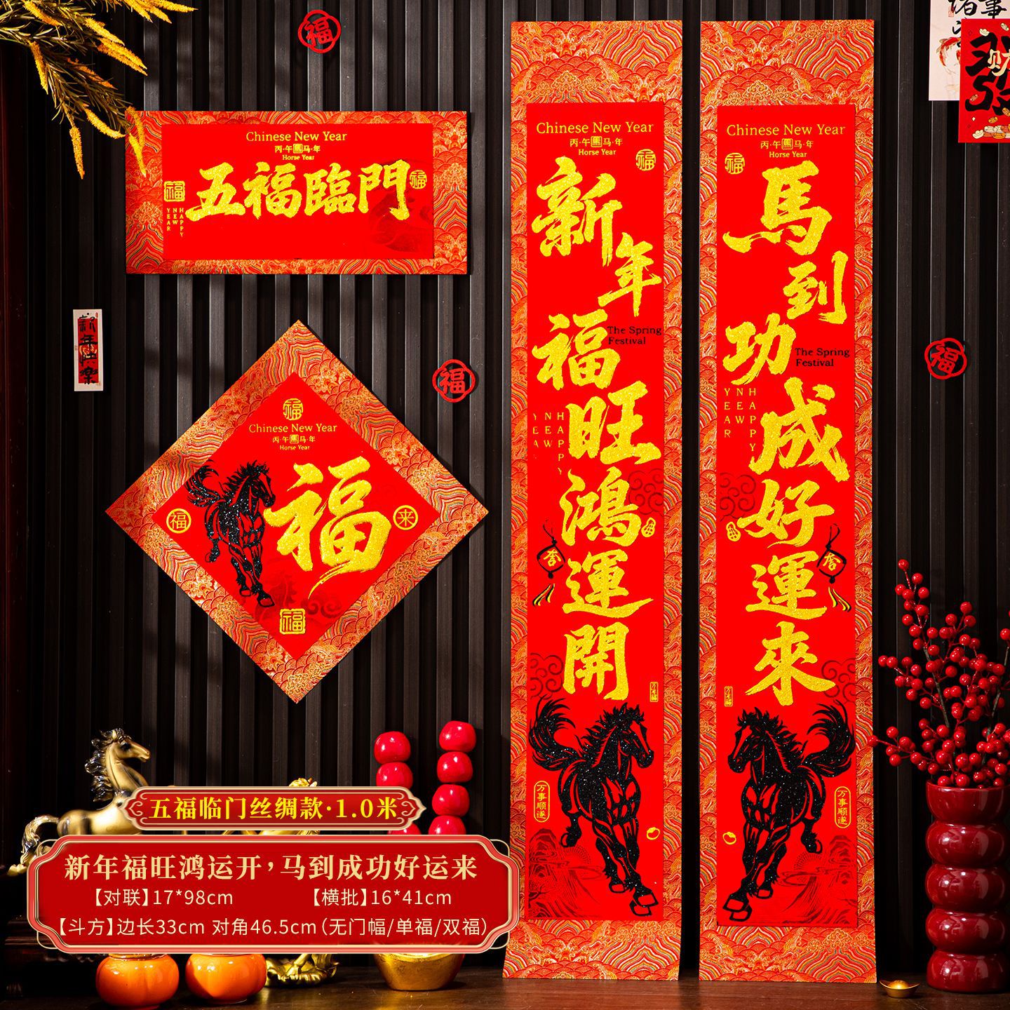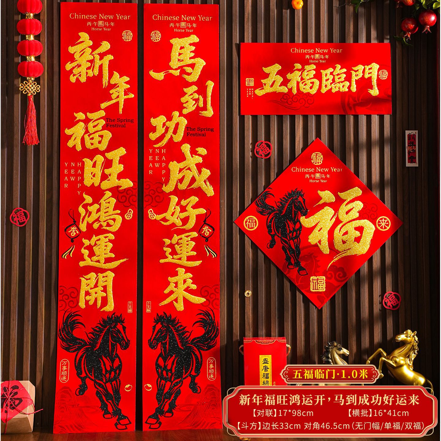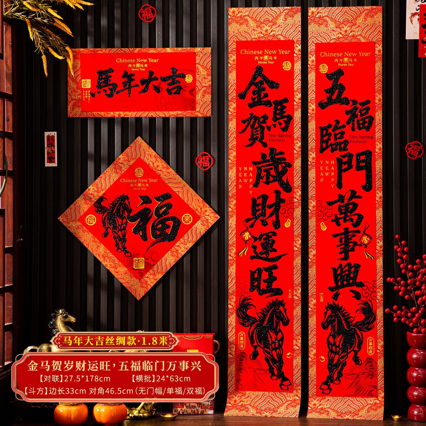 | 【一马当先/宝马奔腾】金粉/黑粉:绒布对联(不带门幅) | USD $2.08 | 2 piece available |