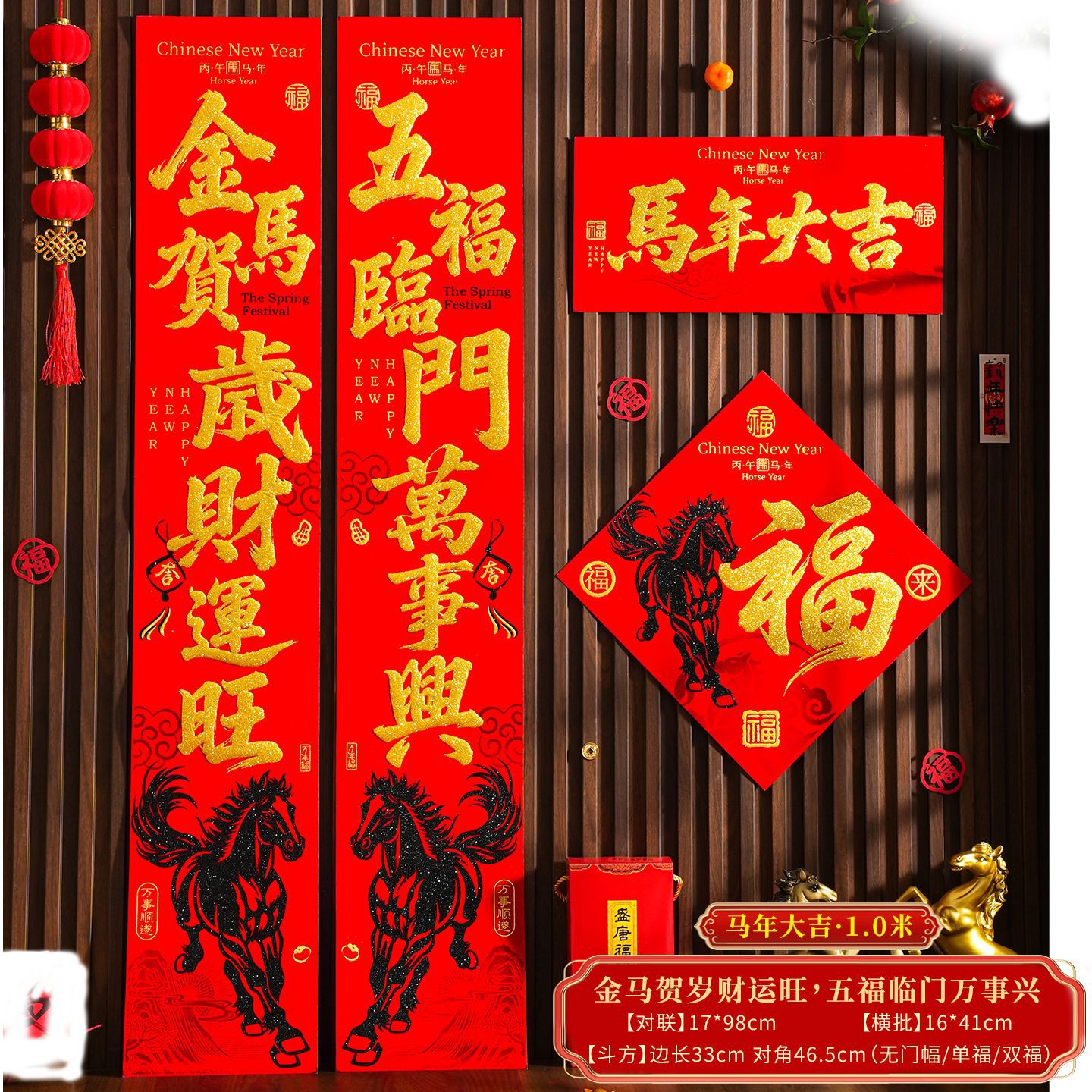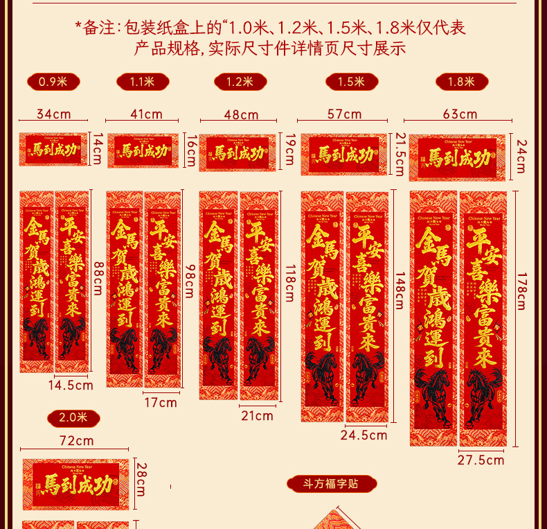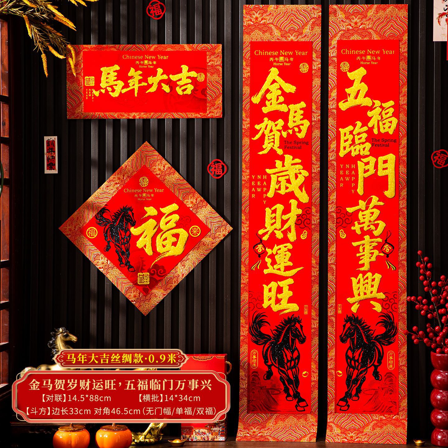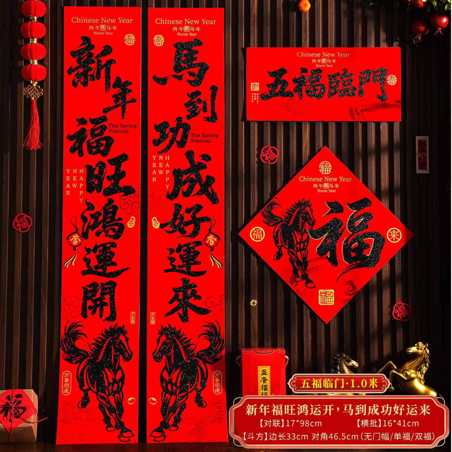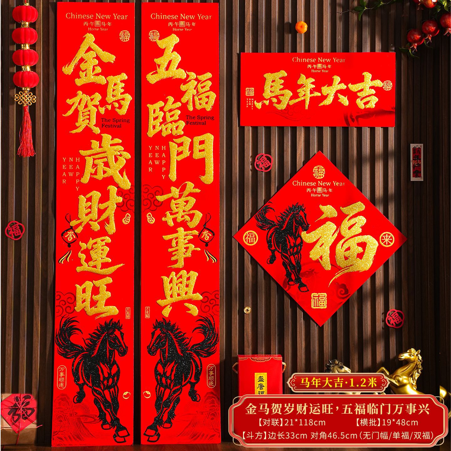 | 【一马当先/宝马奔腾】金粉/黑粉:绒布对联(不带门幅) | USD $2.08 | 2 piece available |