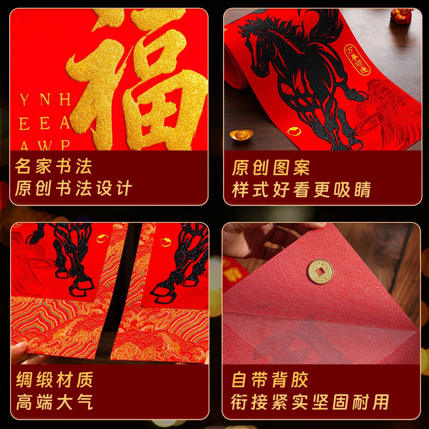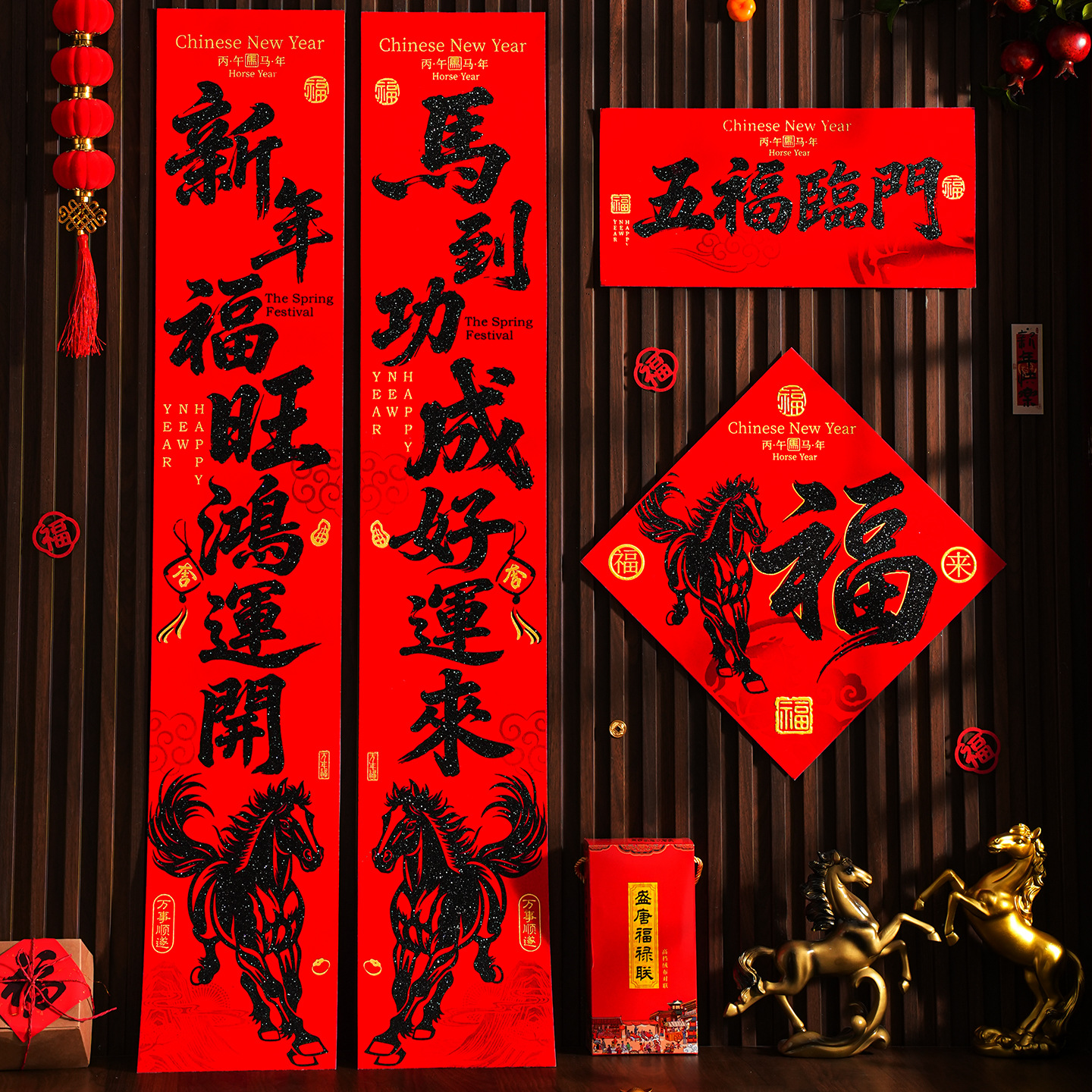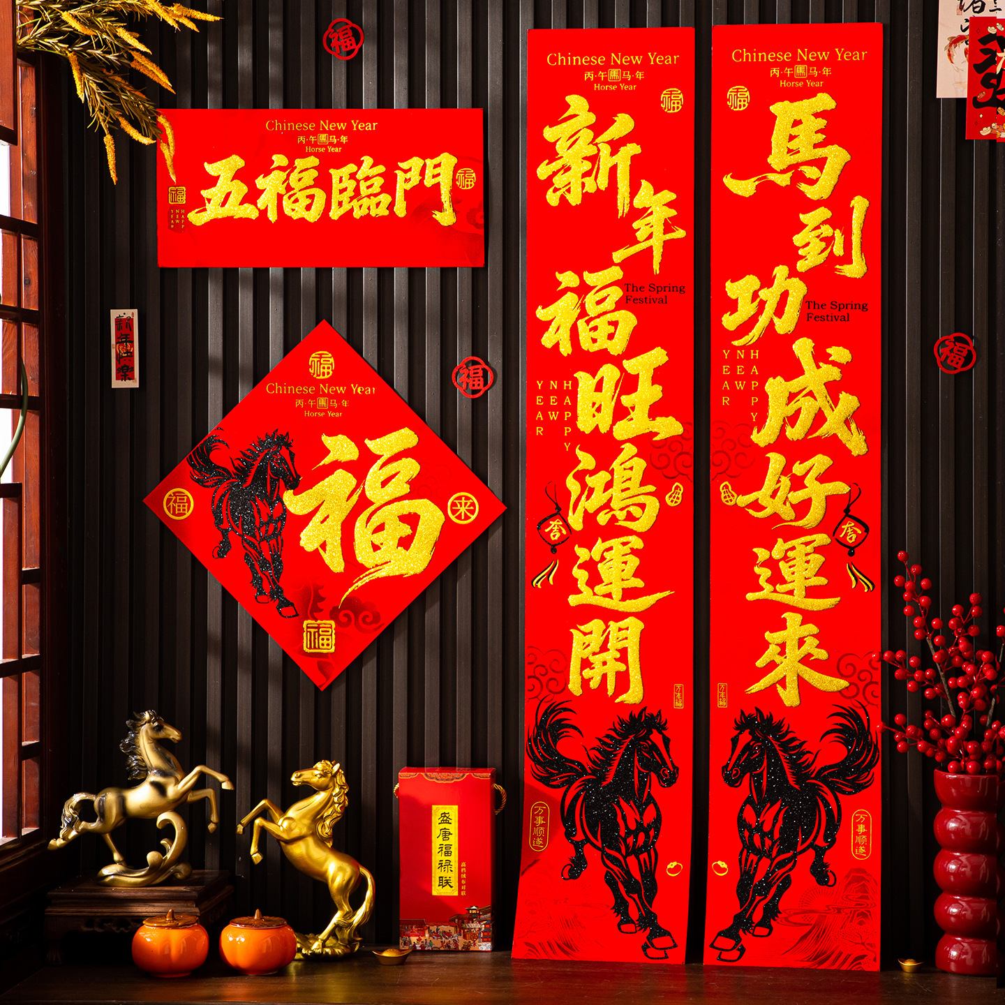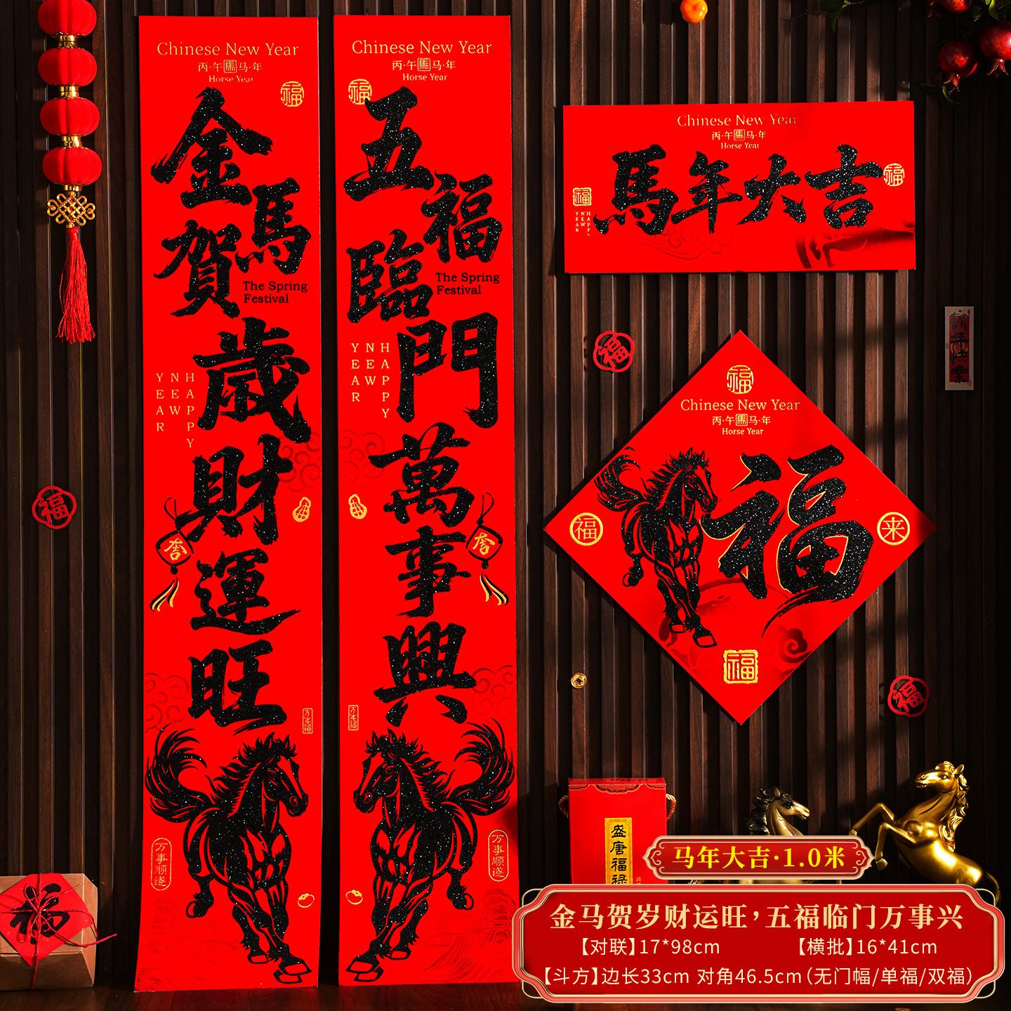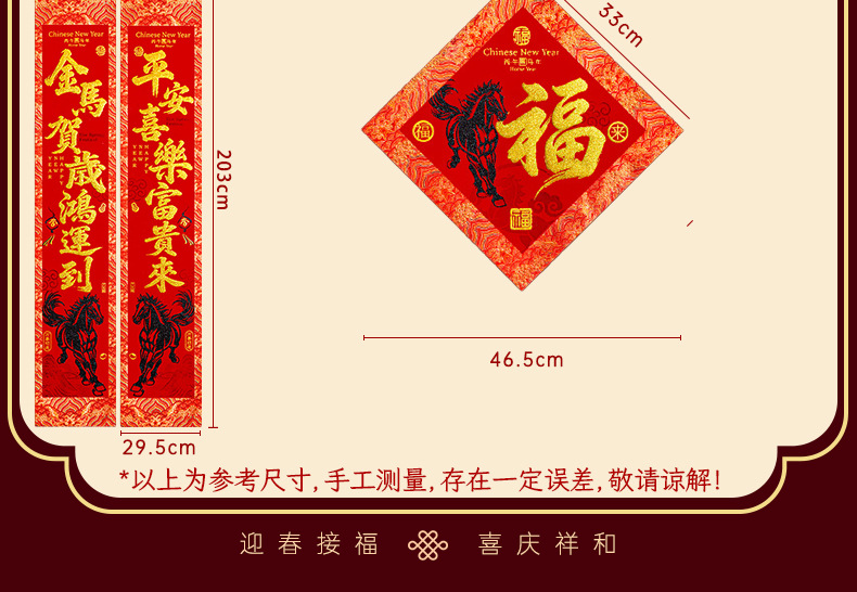 | 【一马当先/宝马奔腾】金粉/黑粉:绒布对联(不带门幅) | USD $2.08 | 2 piece available |