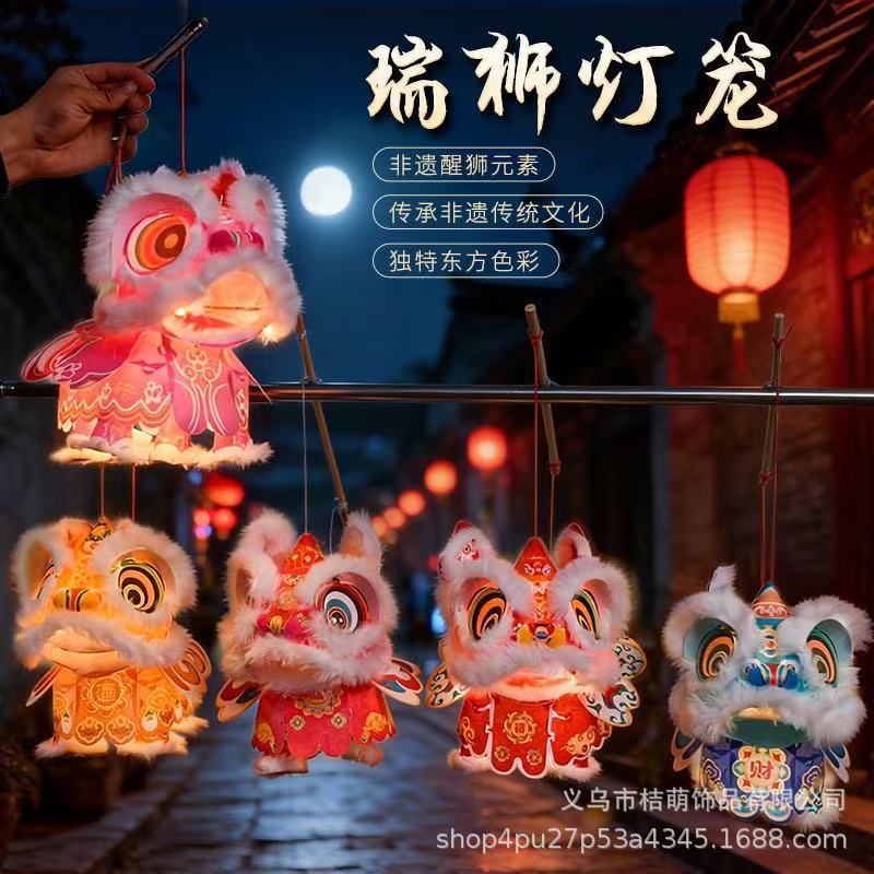 2026新年款醒狮灯笼儿童手提灯笼 手工diy材料包制作古风花灯批发