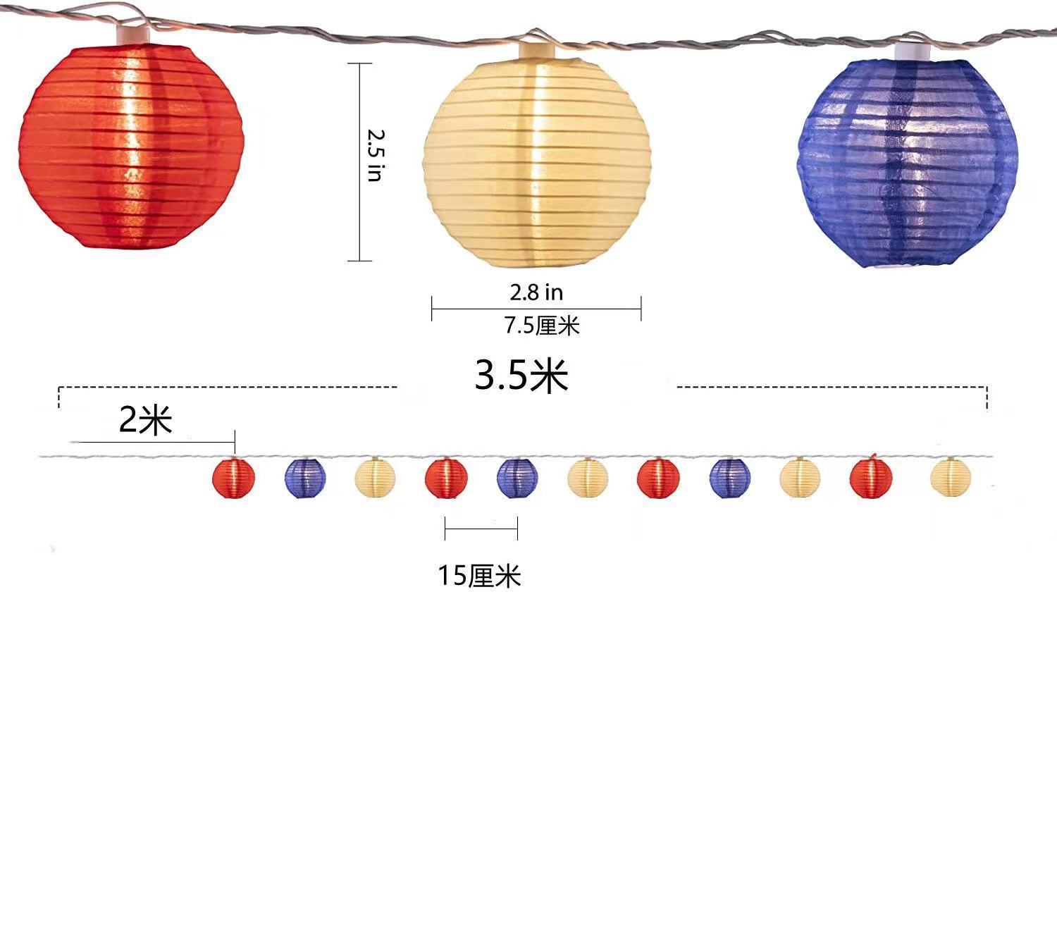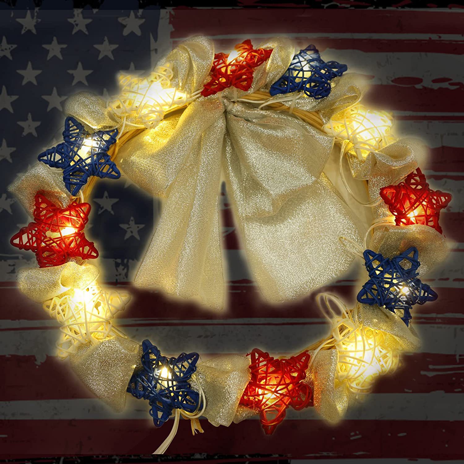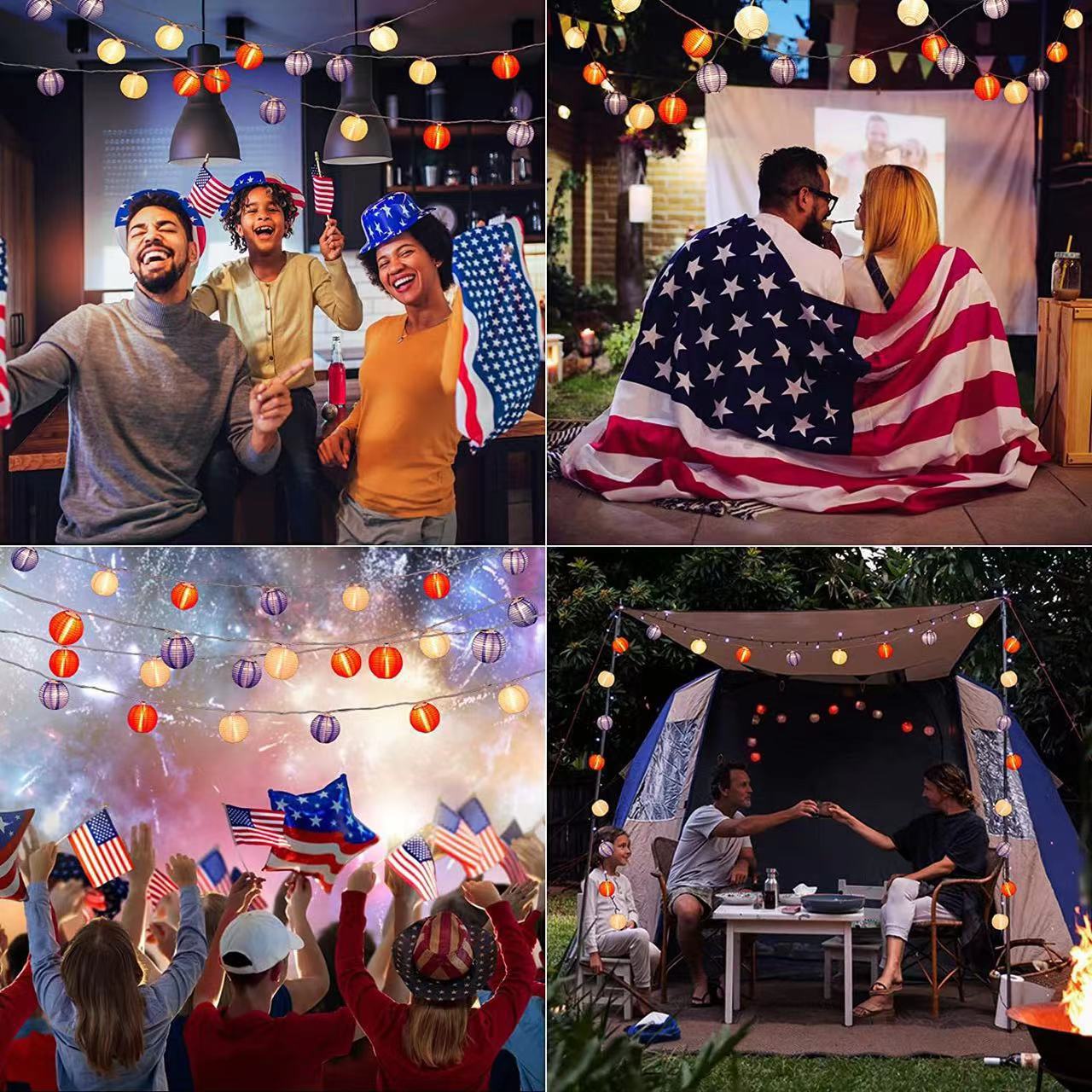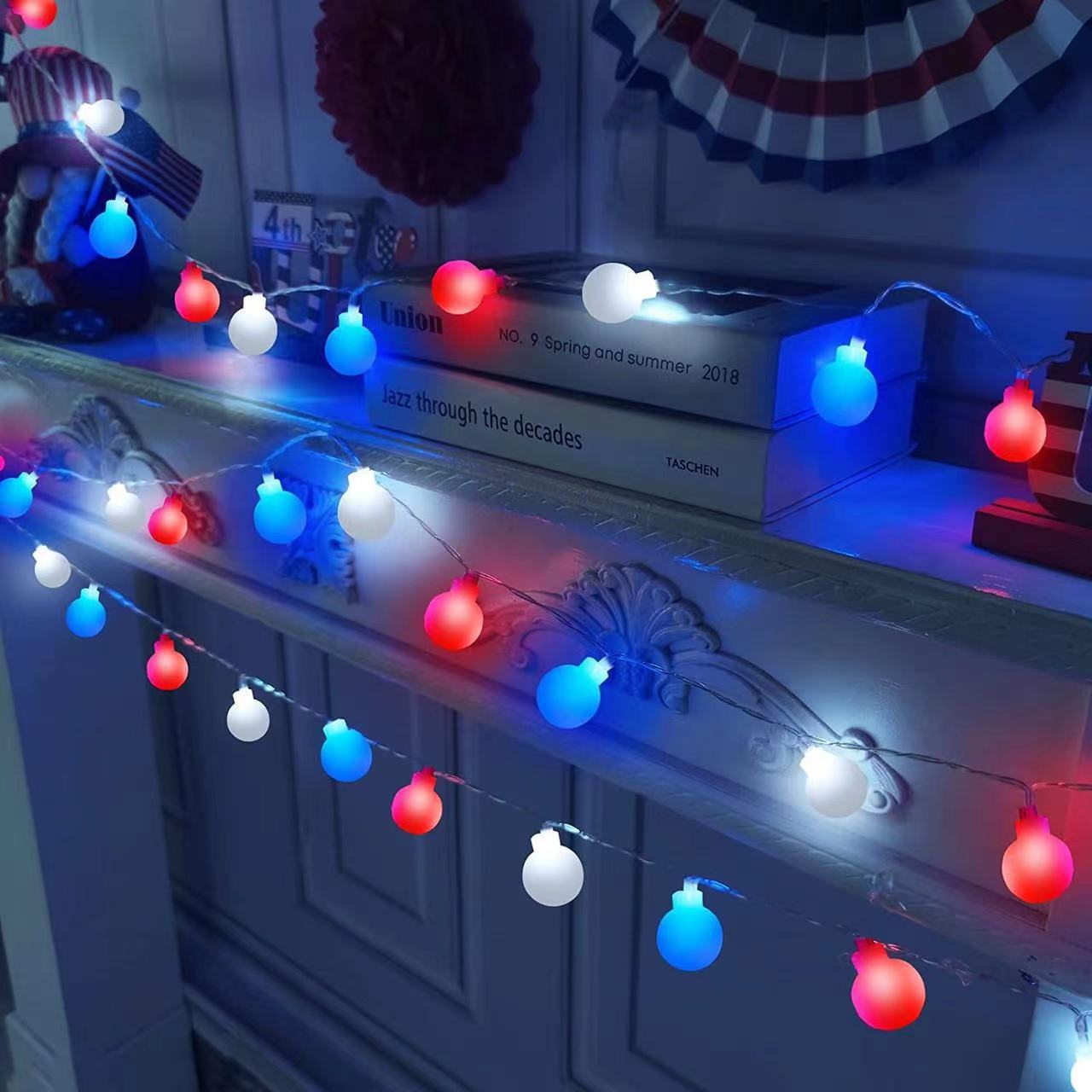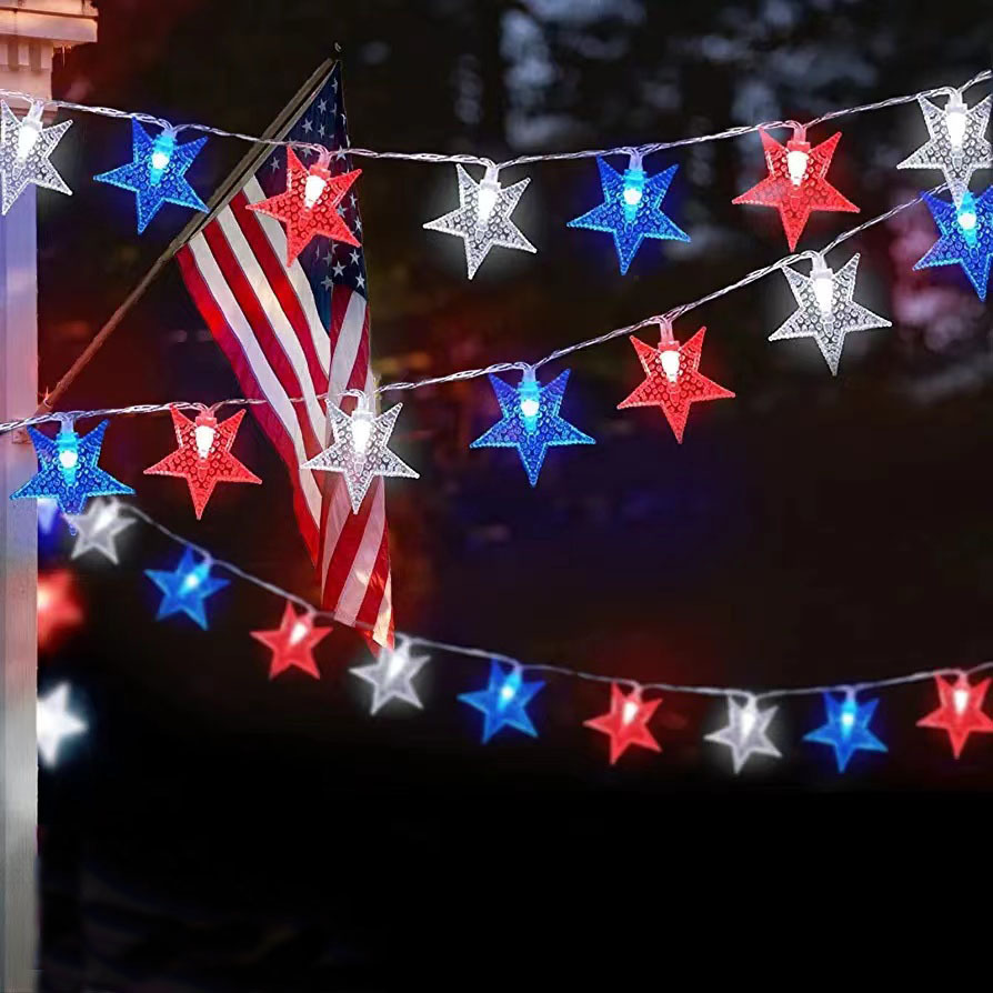 美国独立日红白蓝星星灯定制藤条五角星led灯笼圆珠串灯装饰灯串