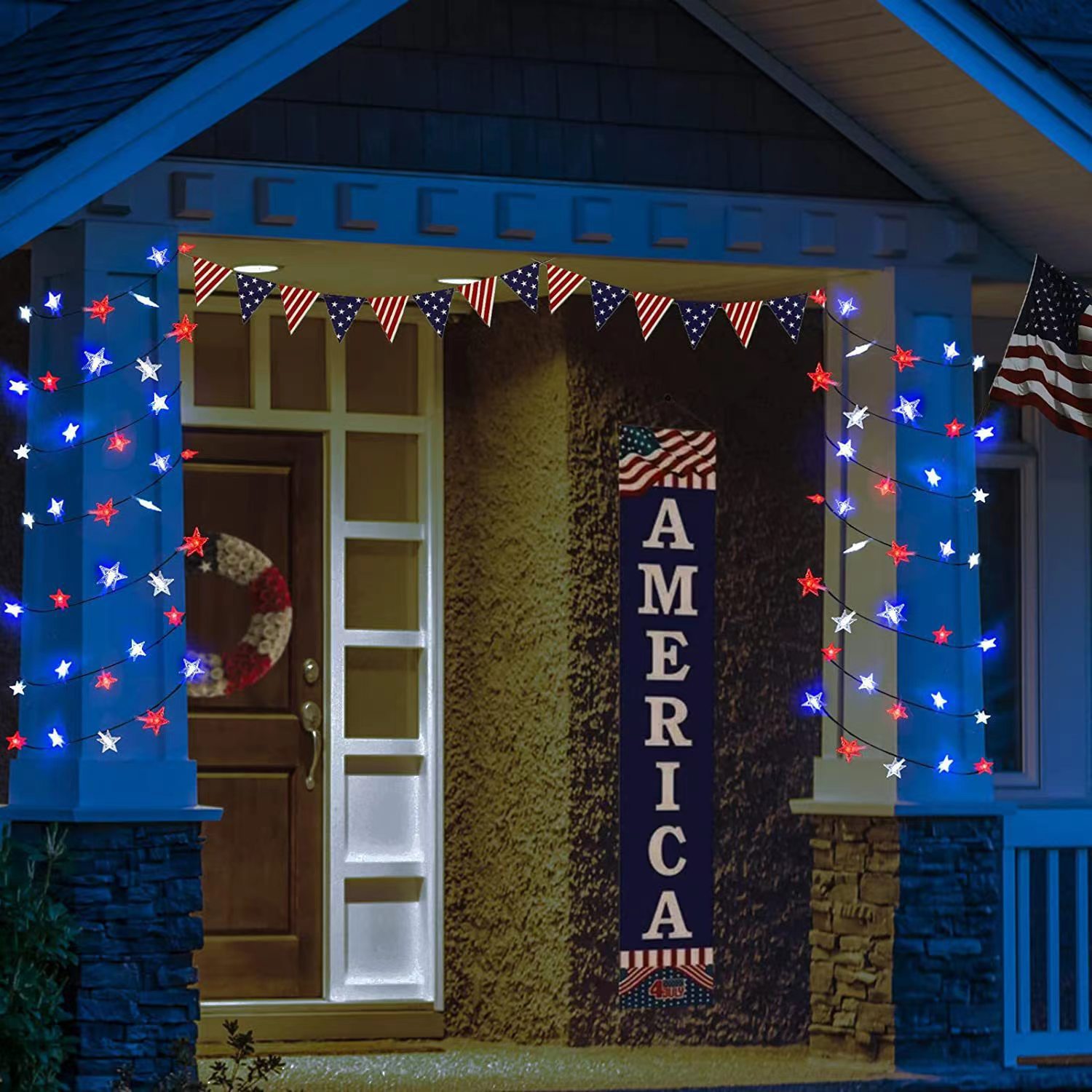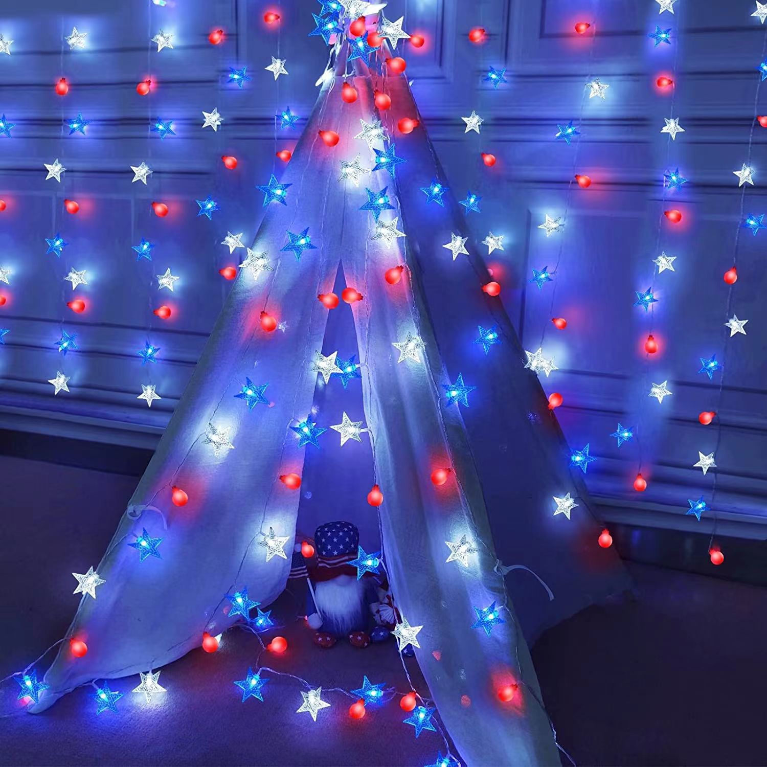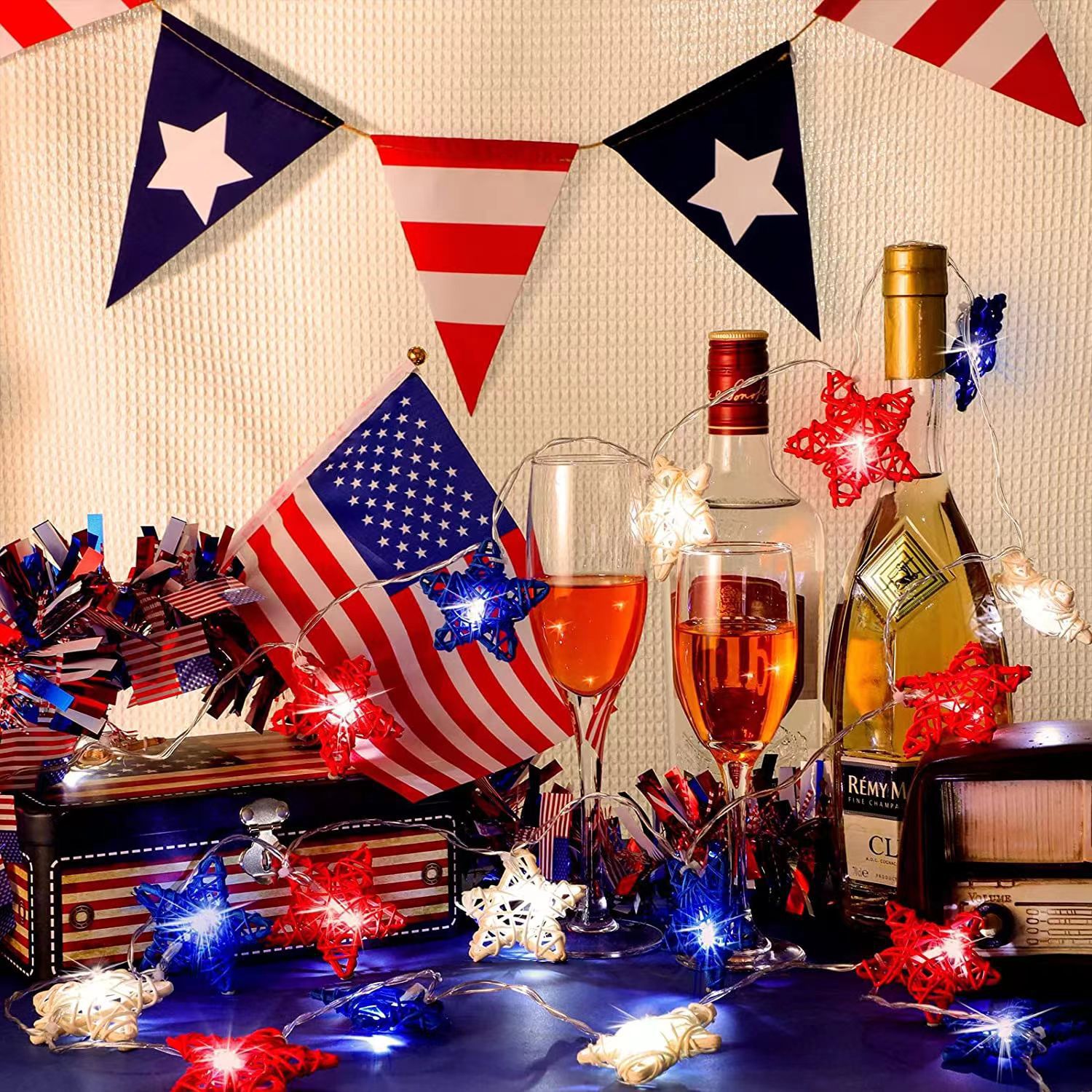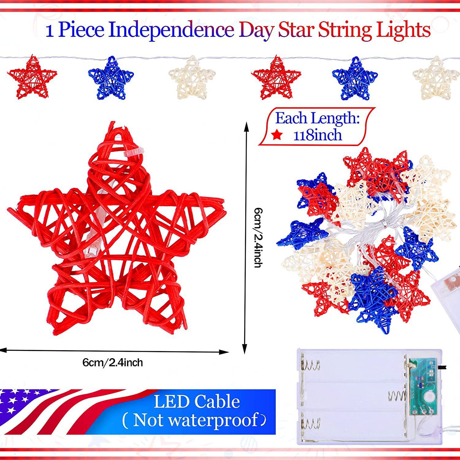 美国独立日红白蓝星星灯定制藤条五角星led灯笼圆珠串灯装饰灯串