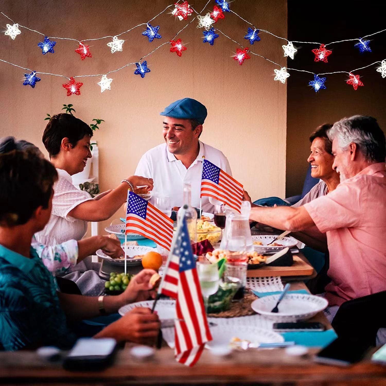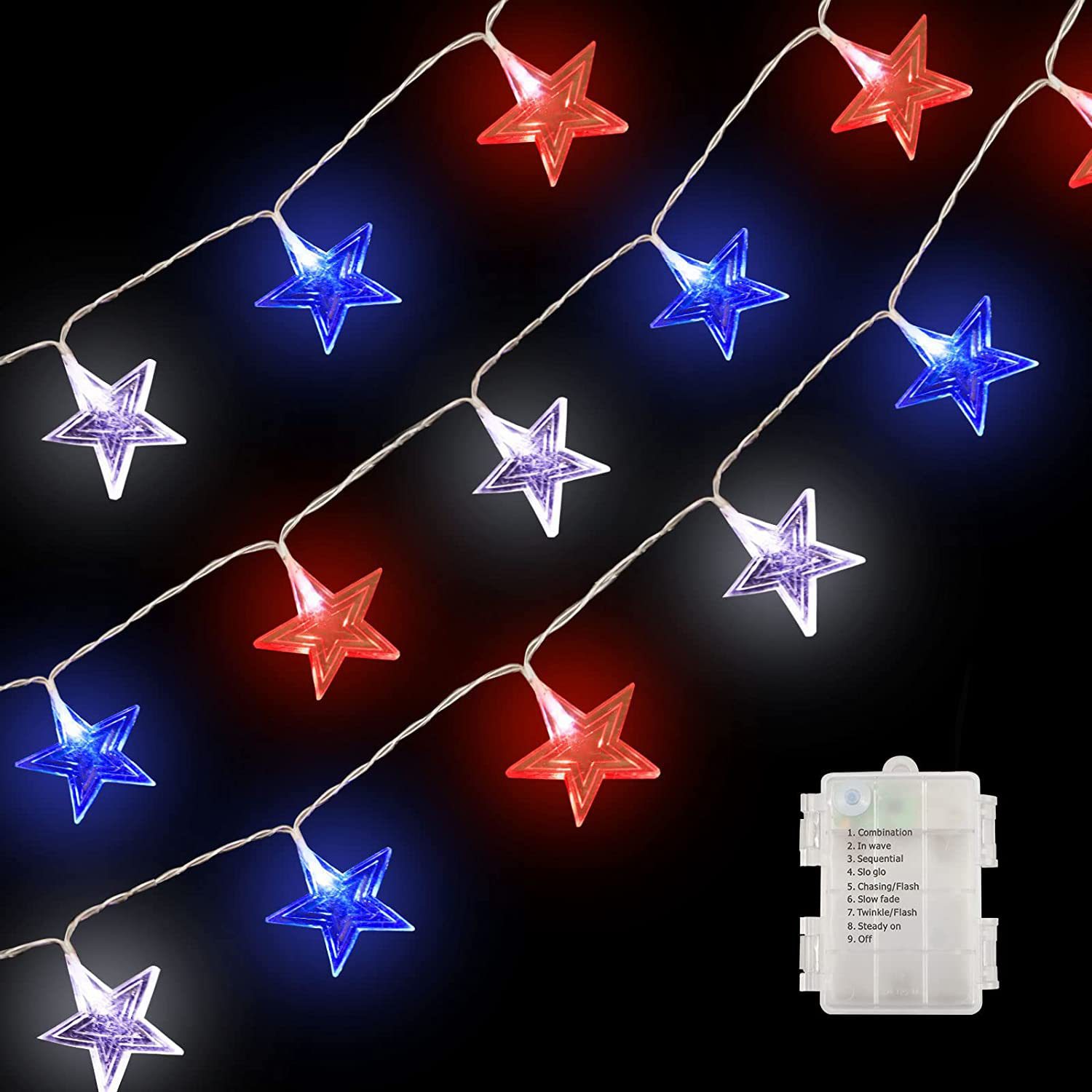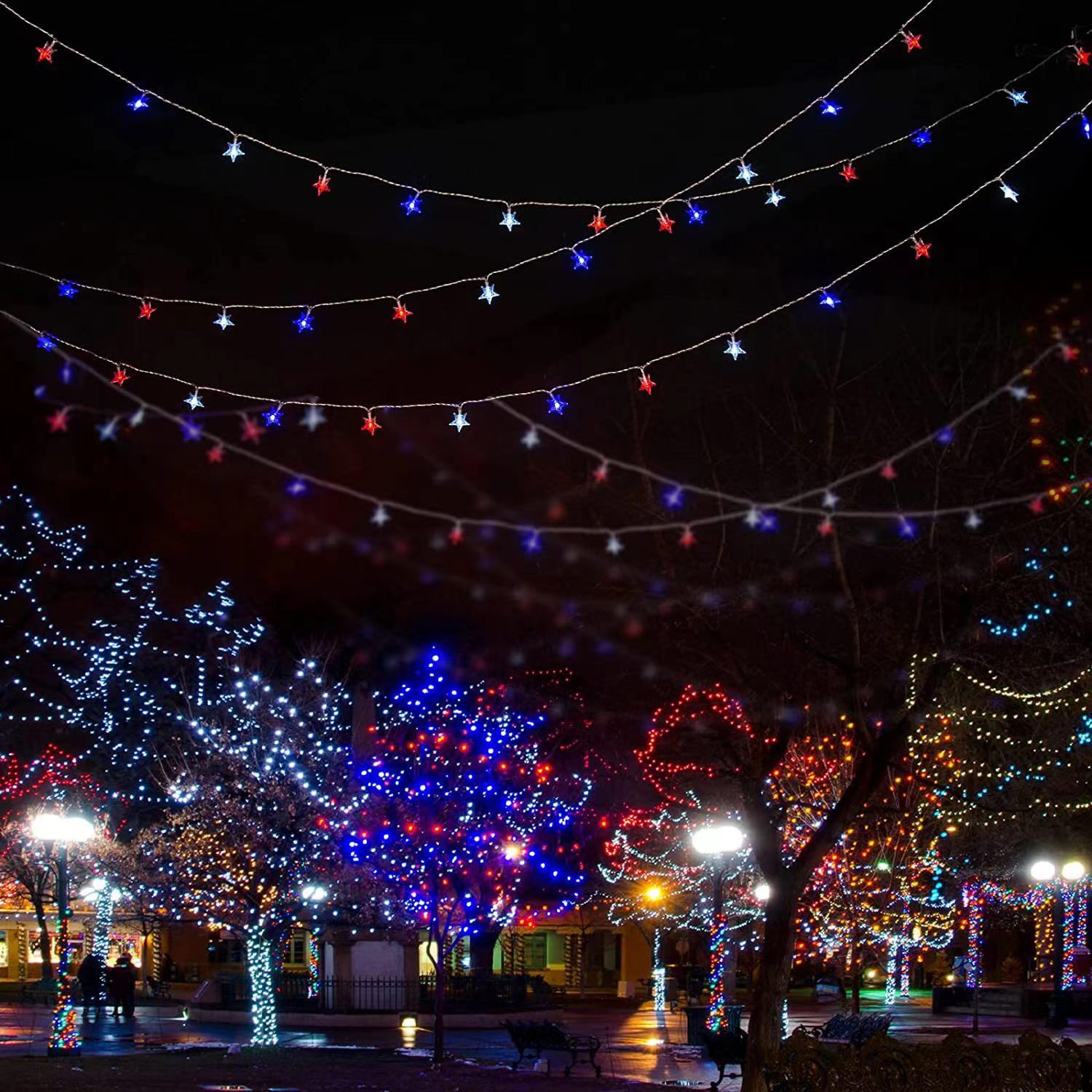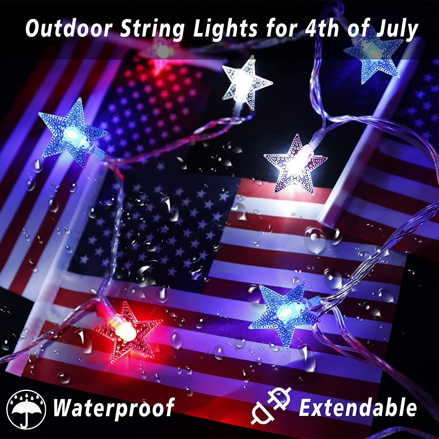 美国独立日红白蓝星星灯定制藤条五角星led灯笼圆珠串灯装饰灯串