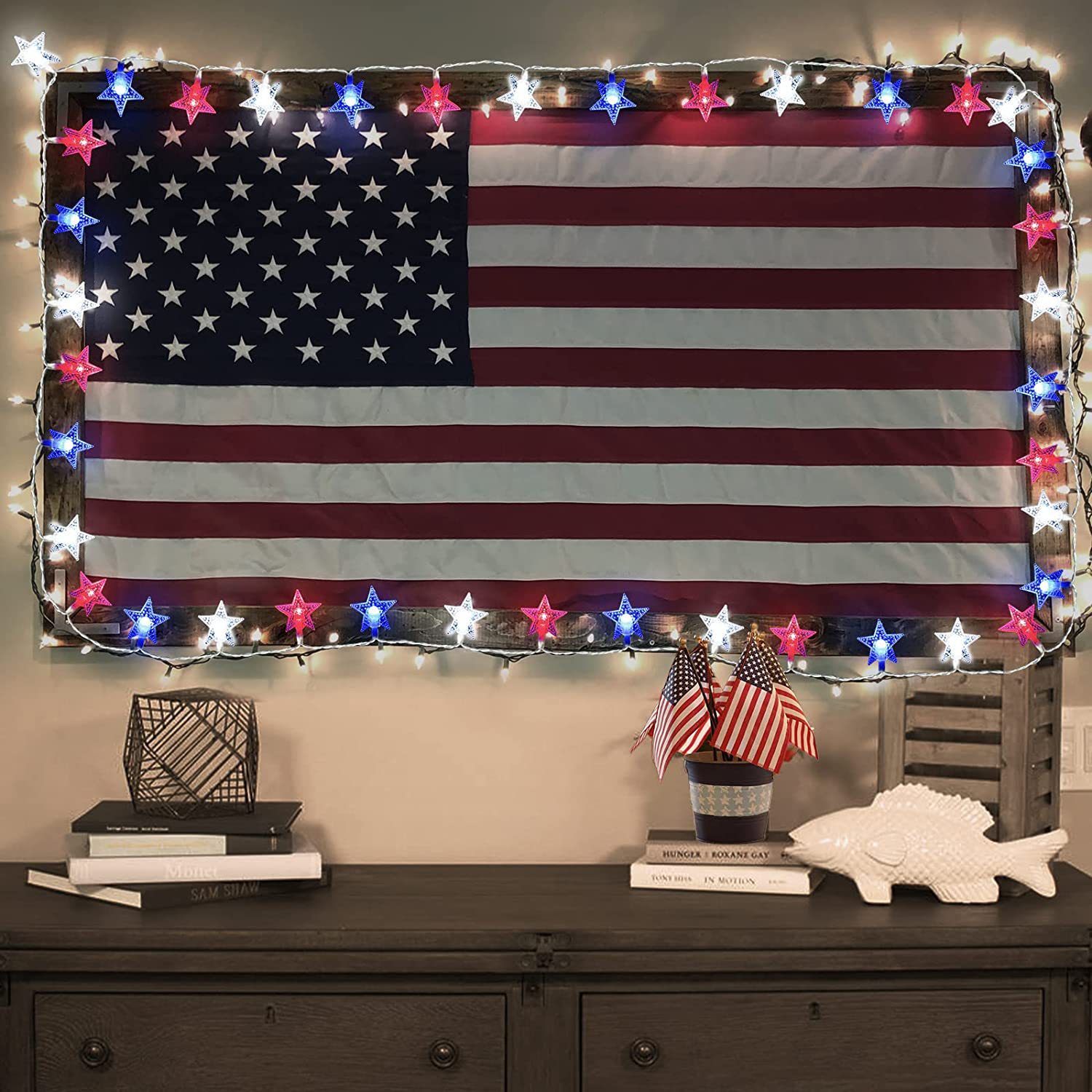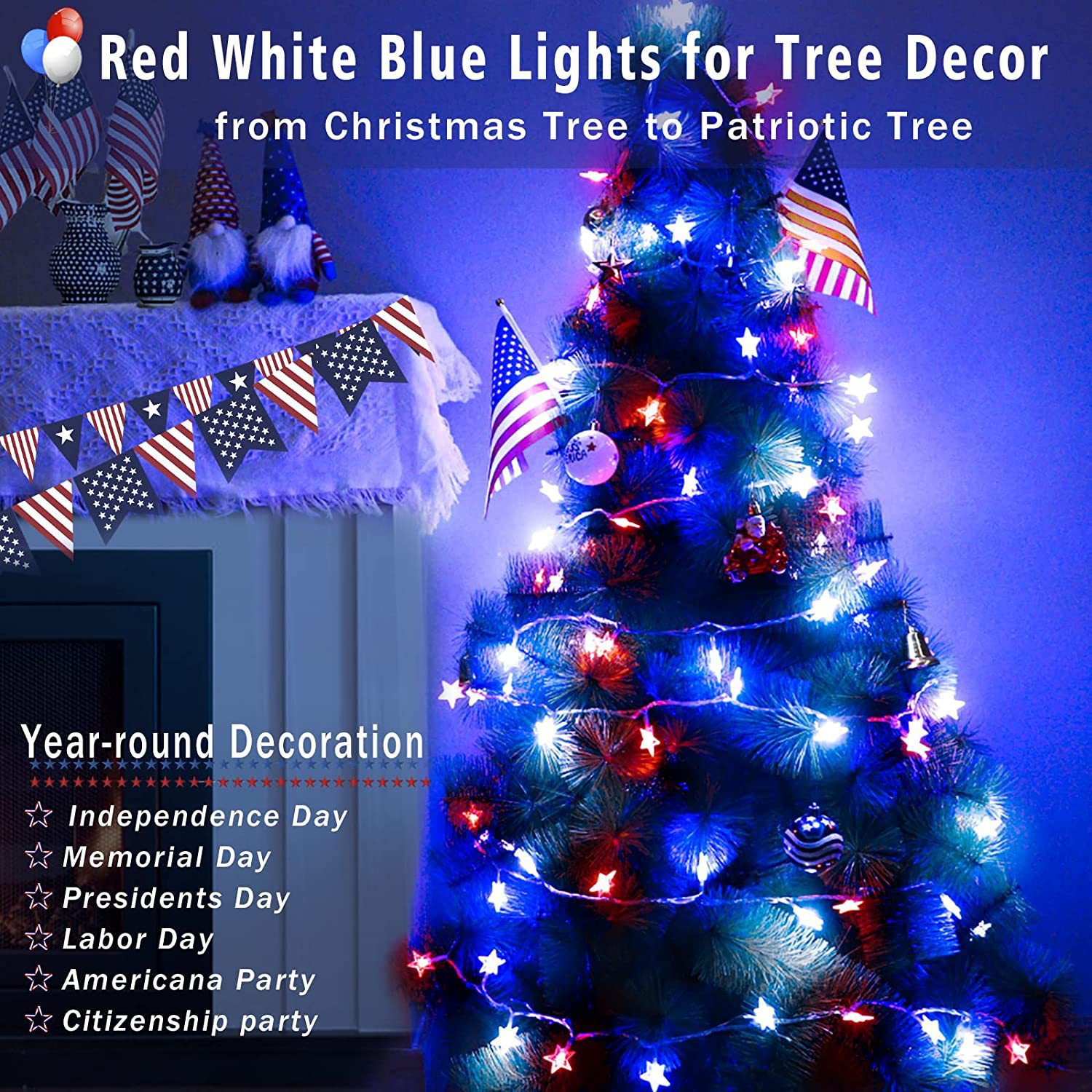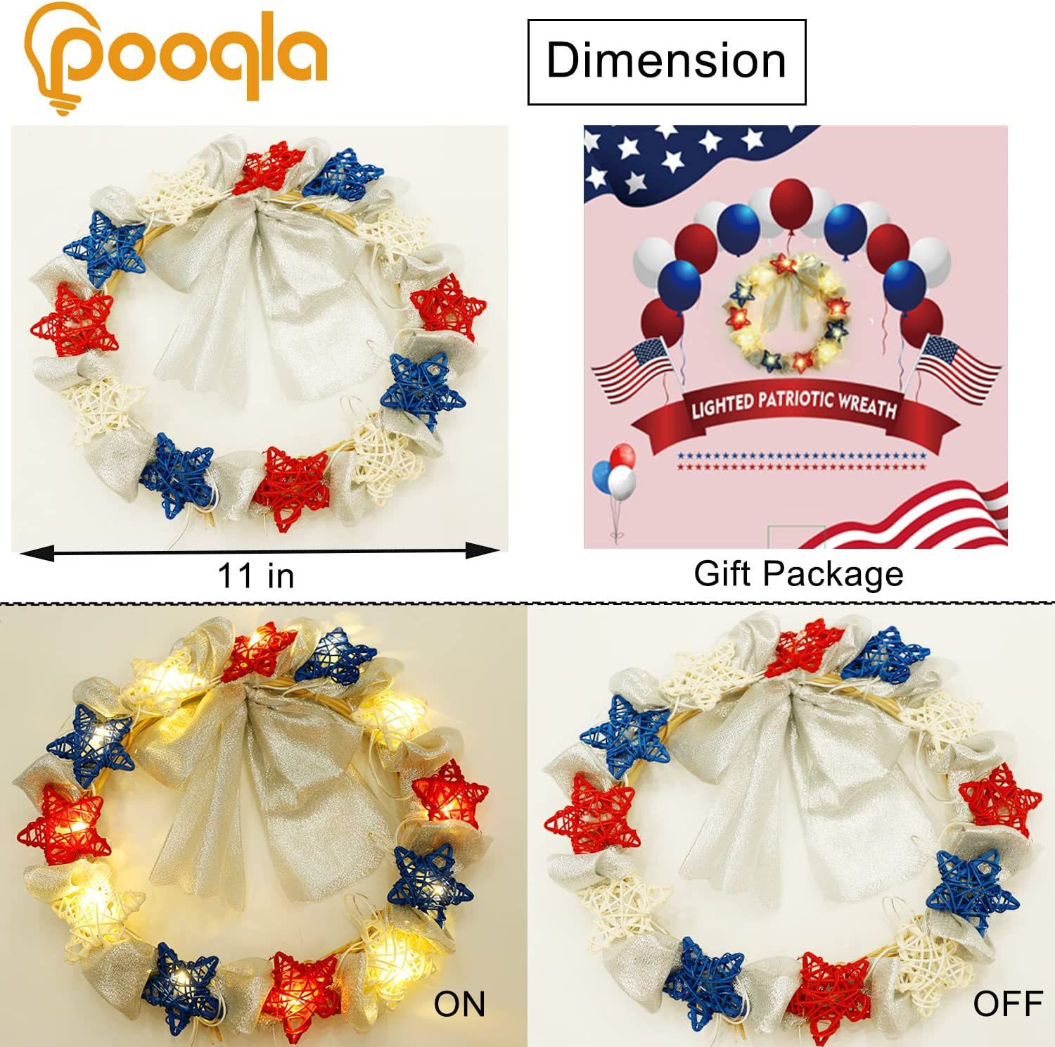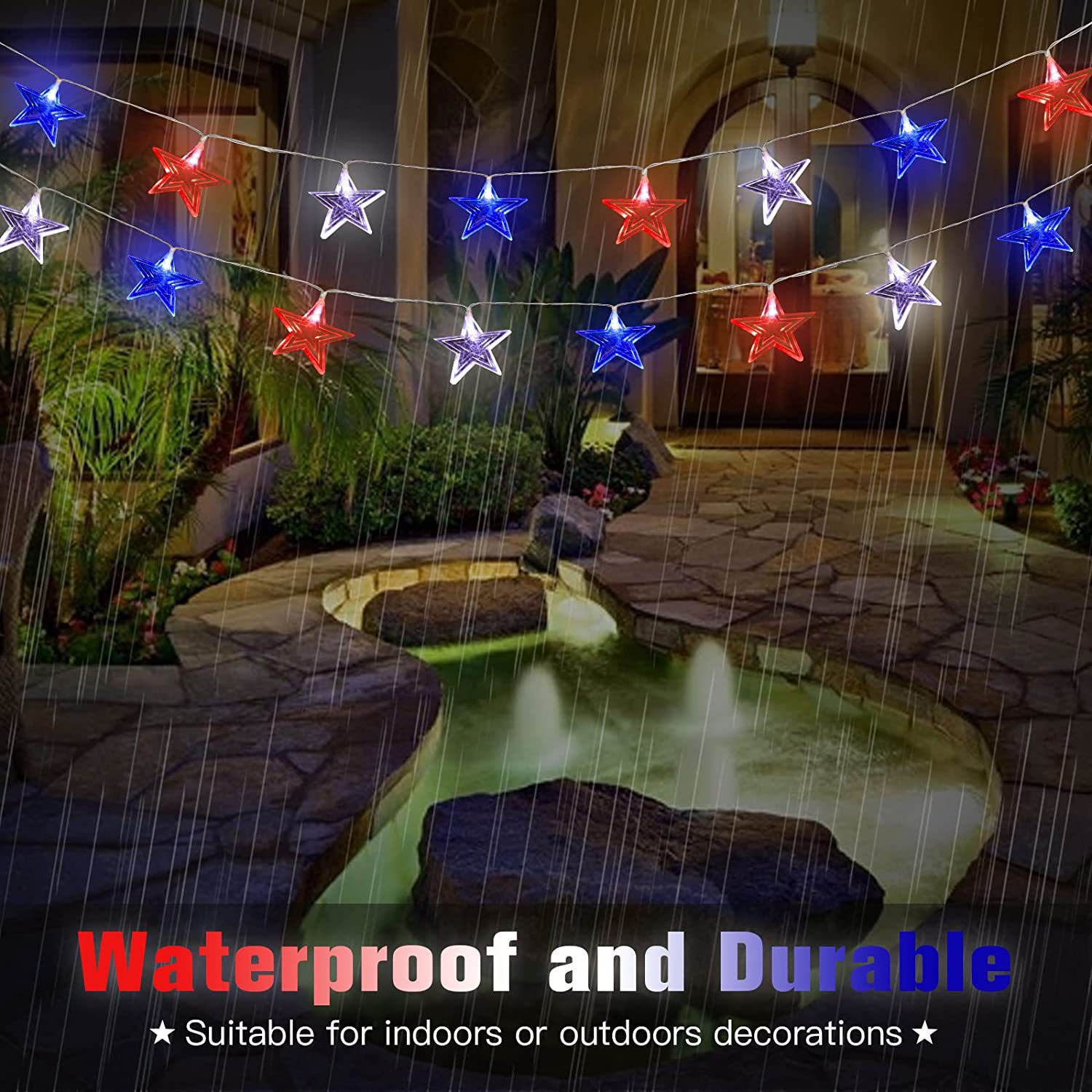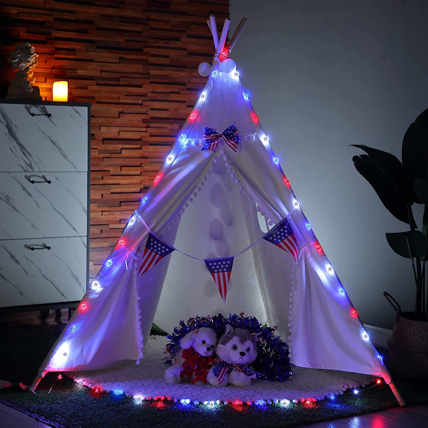 美国独立日红白蓝星星灯定制藤条五角星led灯笼圆珠串灯装饰灯串