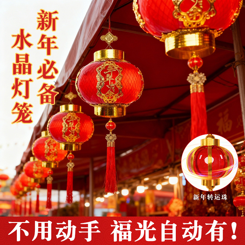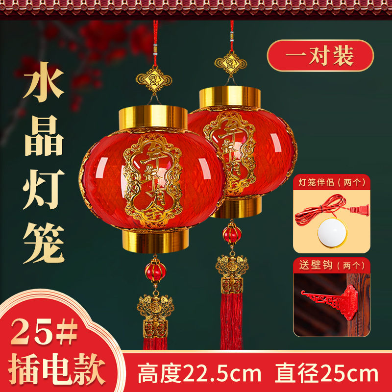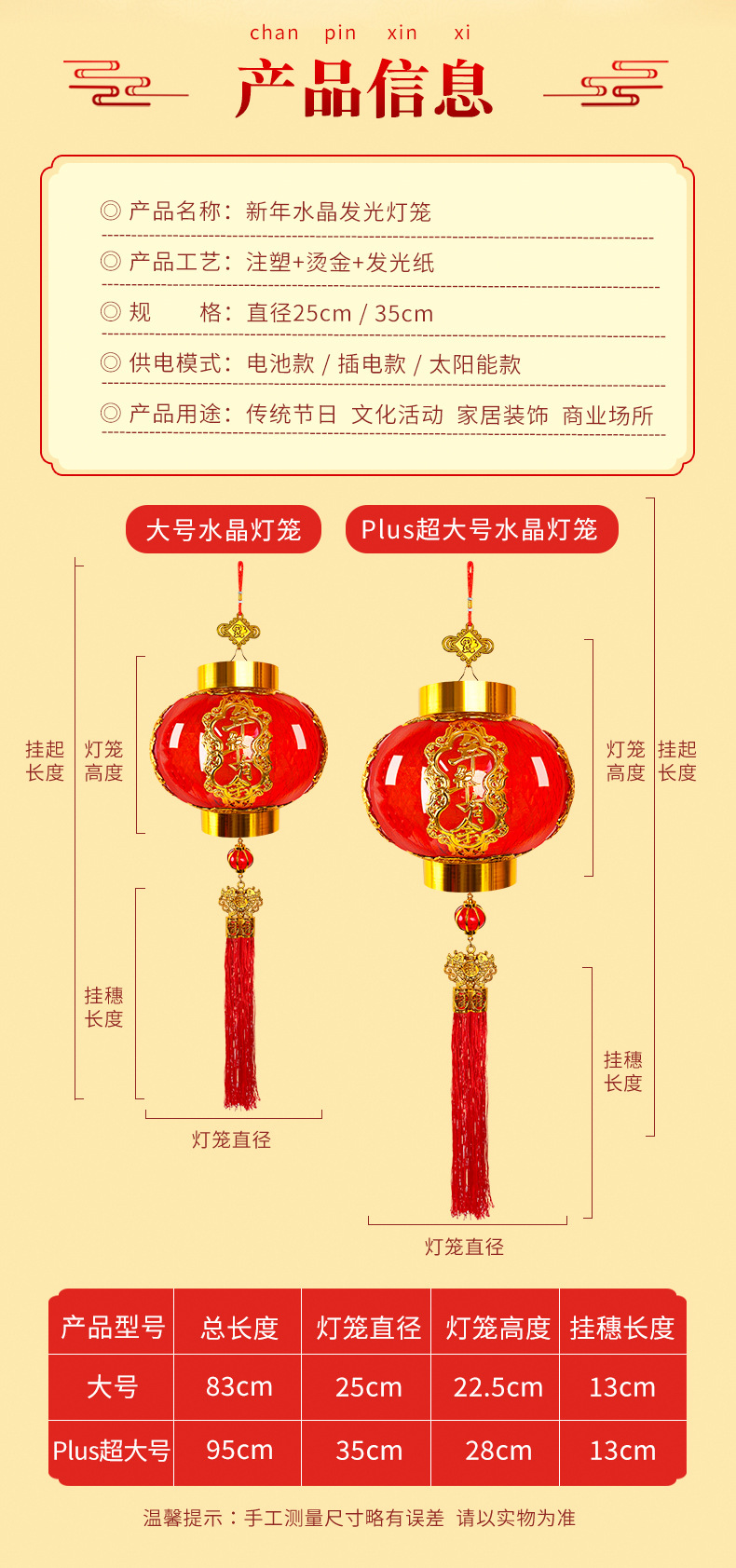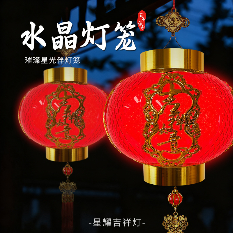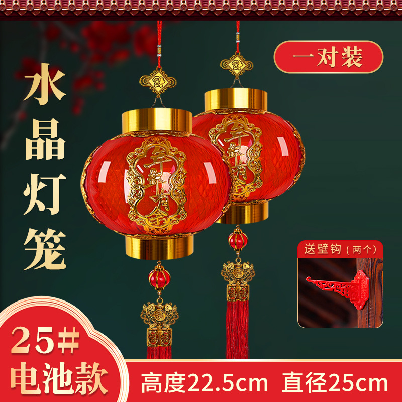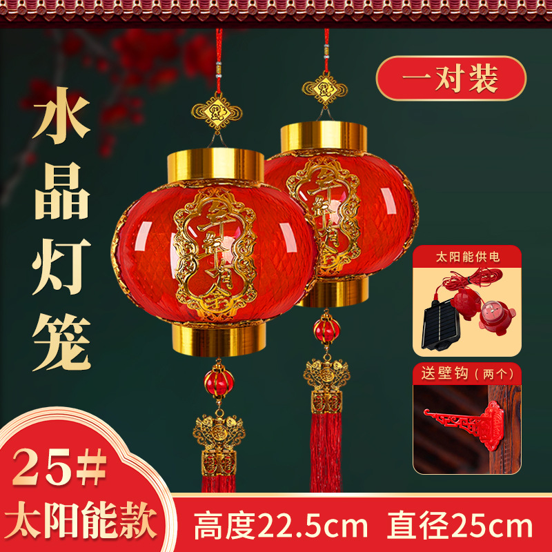 新中式风发光大红灯笼太阳能插电烫金边水晶灯笼春节客厅大门挂件