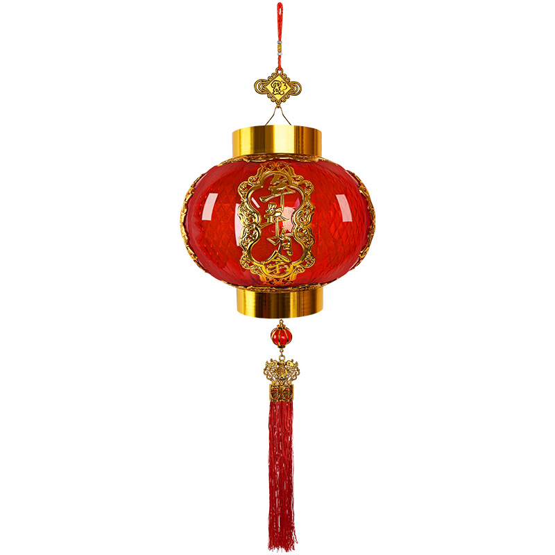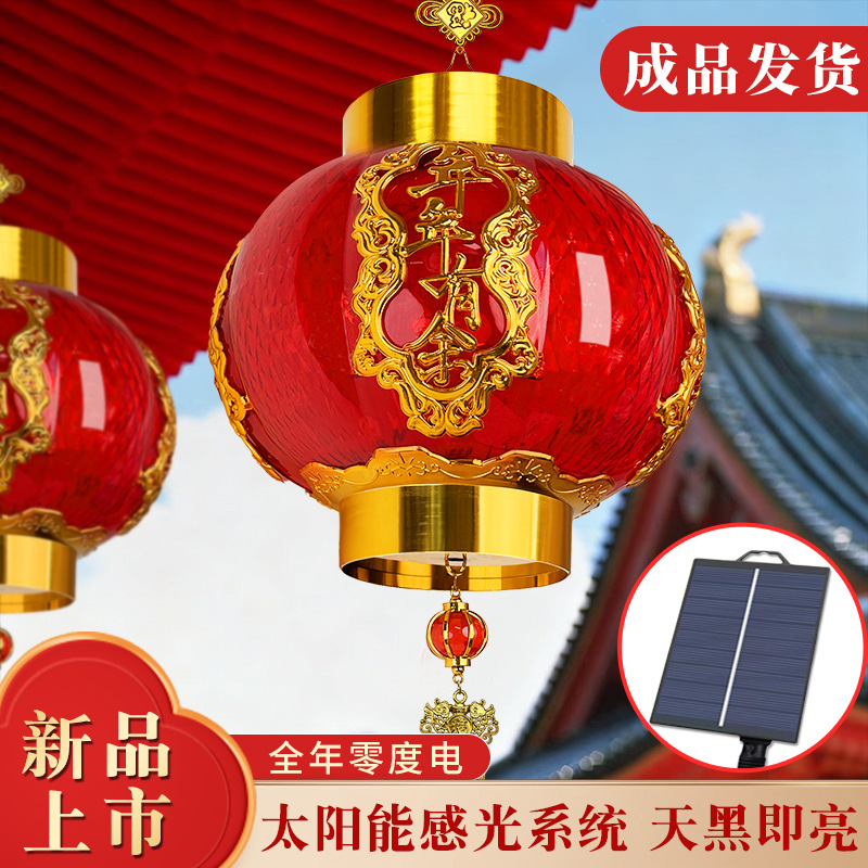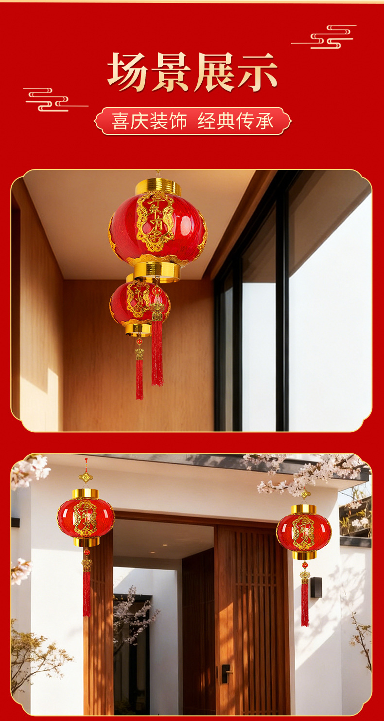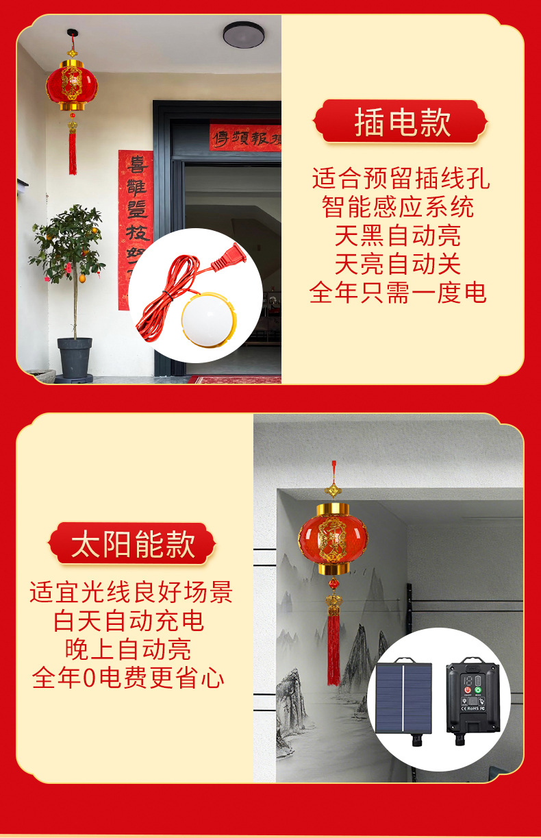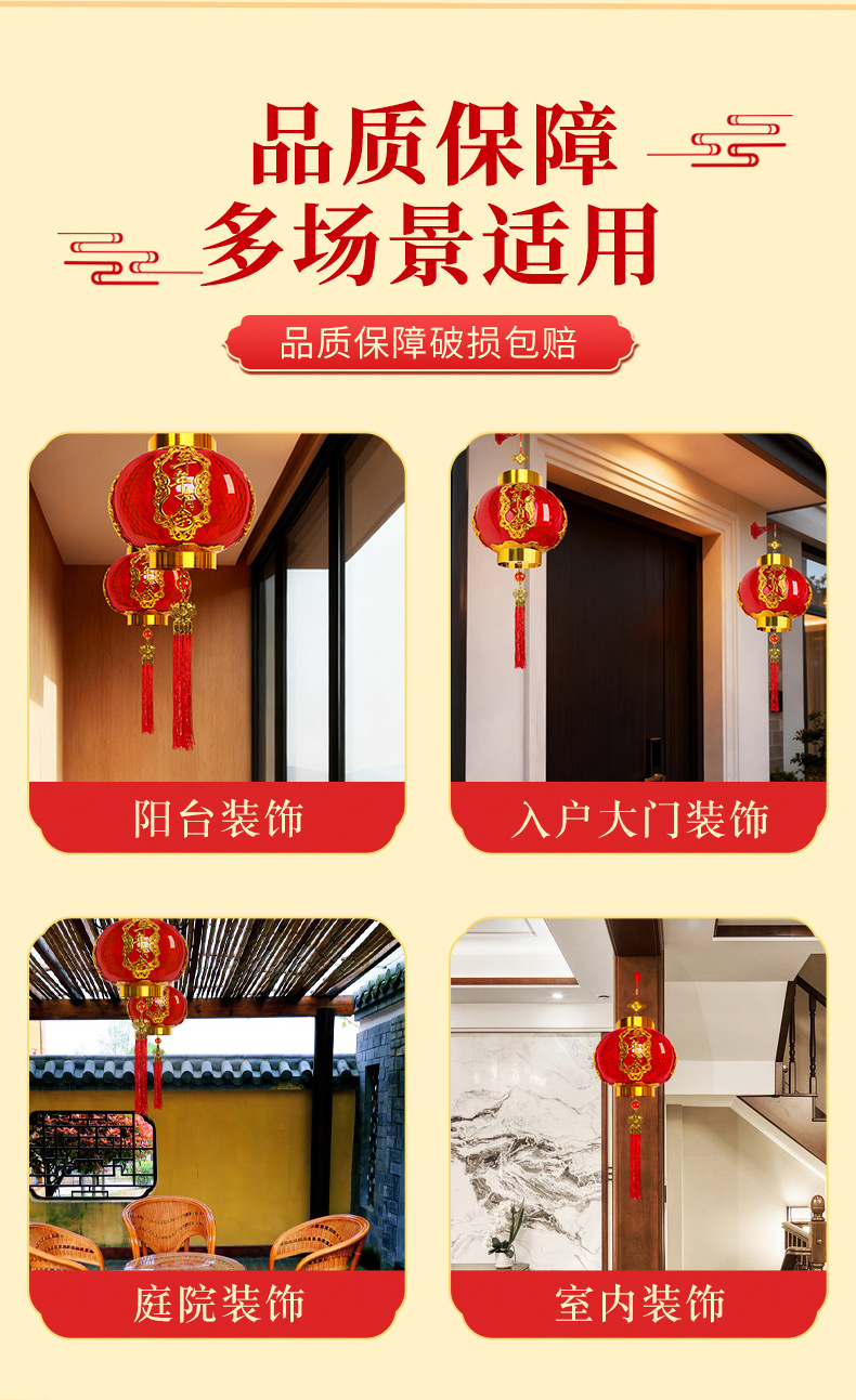 新中式风发光大红灯笼太阳能插电烫金边水晶灯笼春节客厅大门挂件