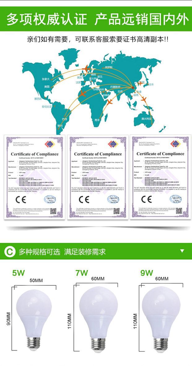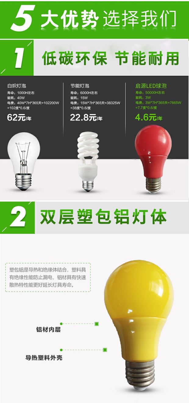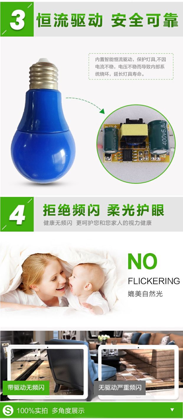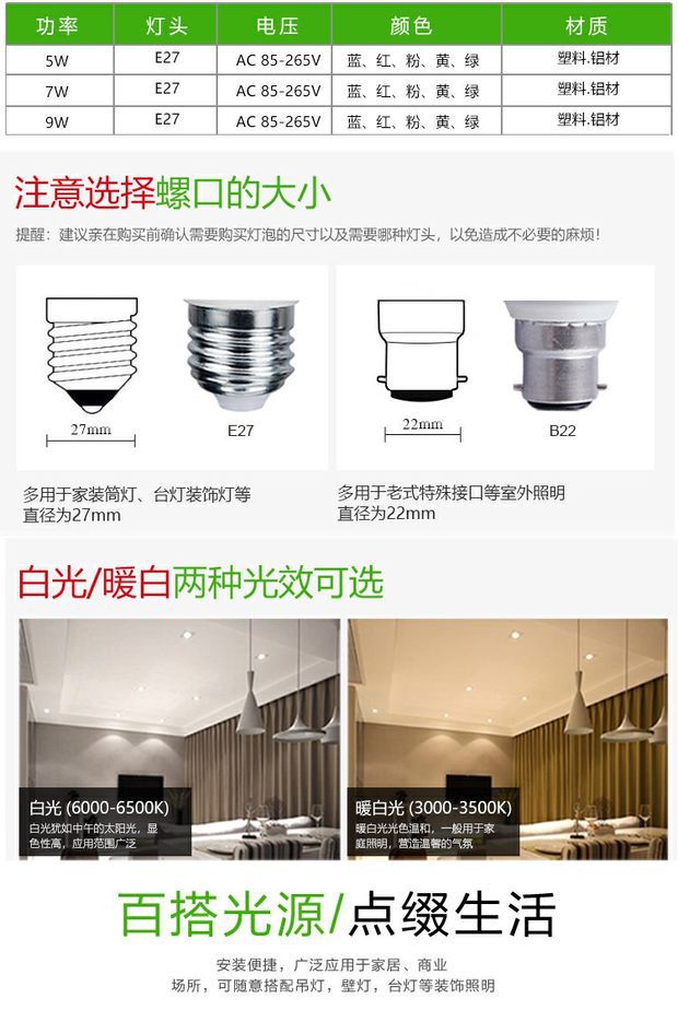 led彩色灯泡e27螺口5w7w9w红色绿蓝色粉黄色装饰灯笼110V220V