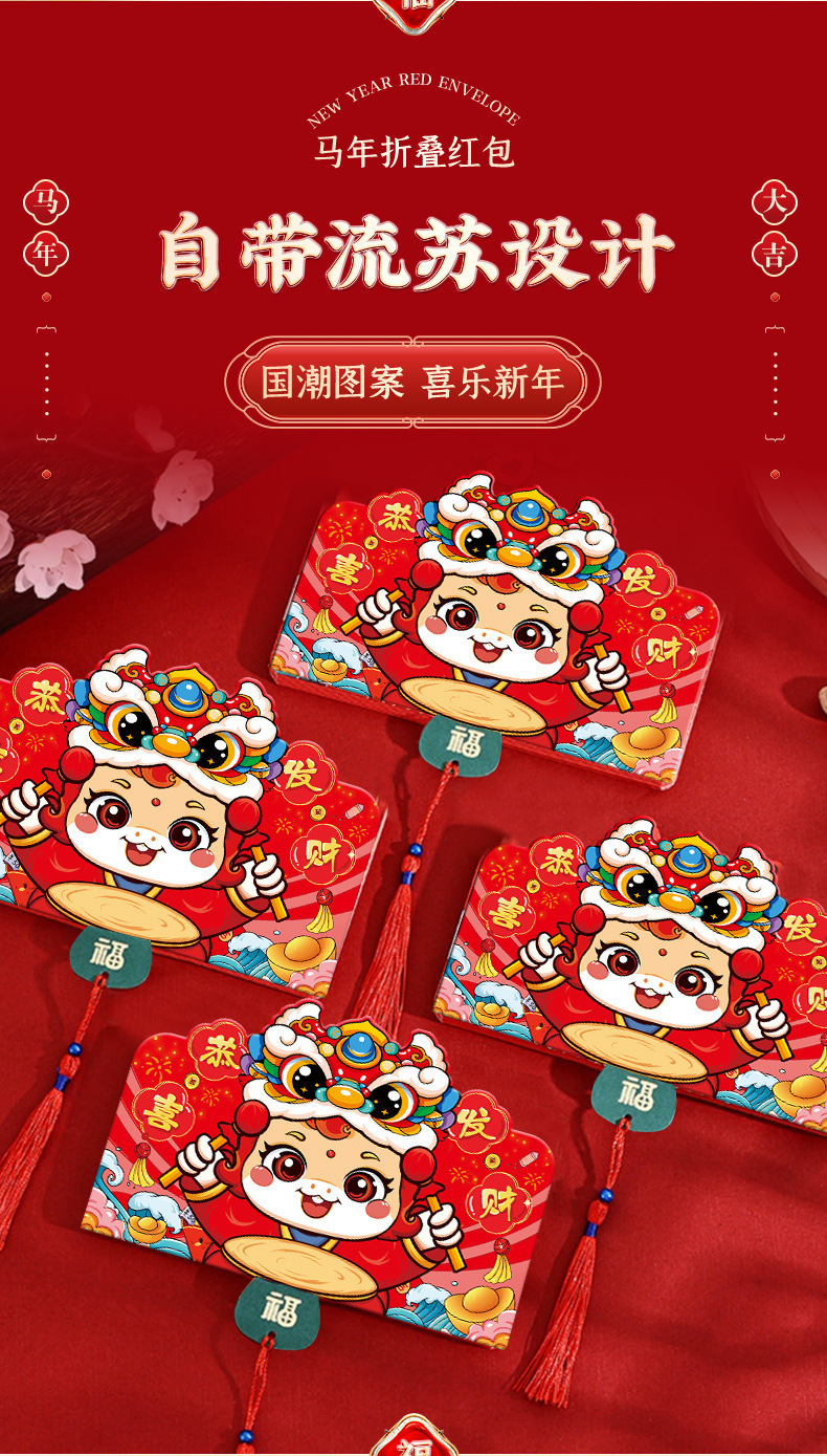 2026新款新年封包小孩压岁钱马年春节折叠红包创意卡通过年利是封