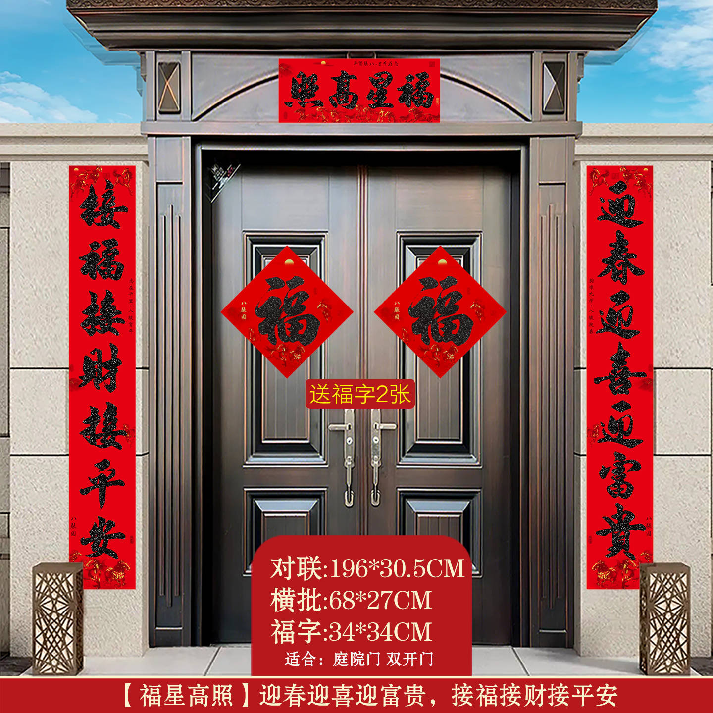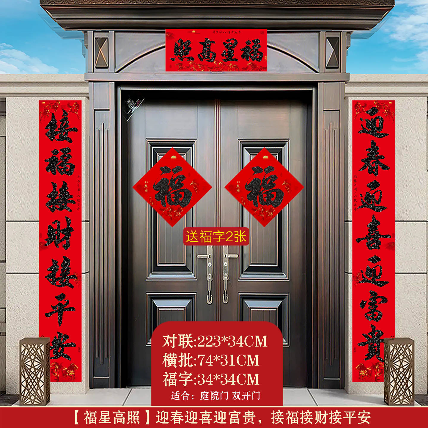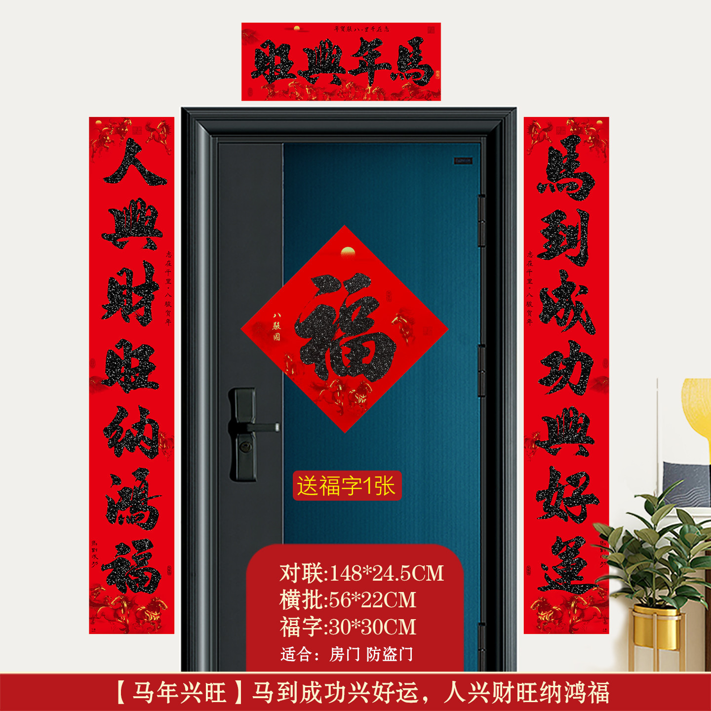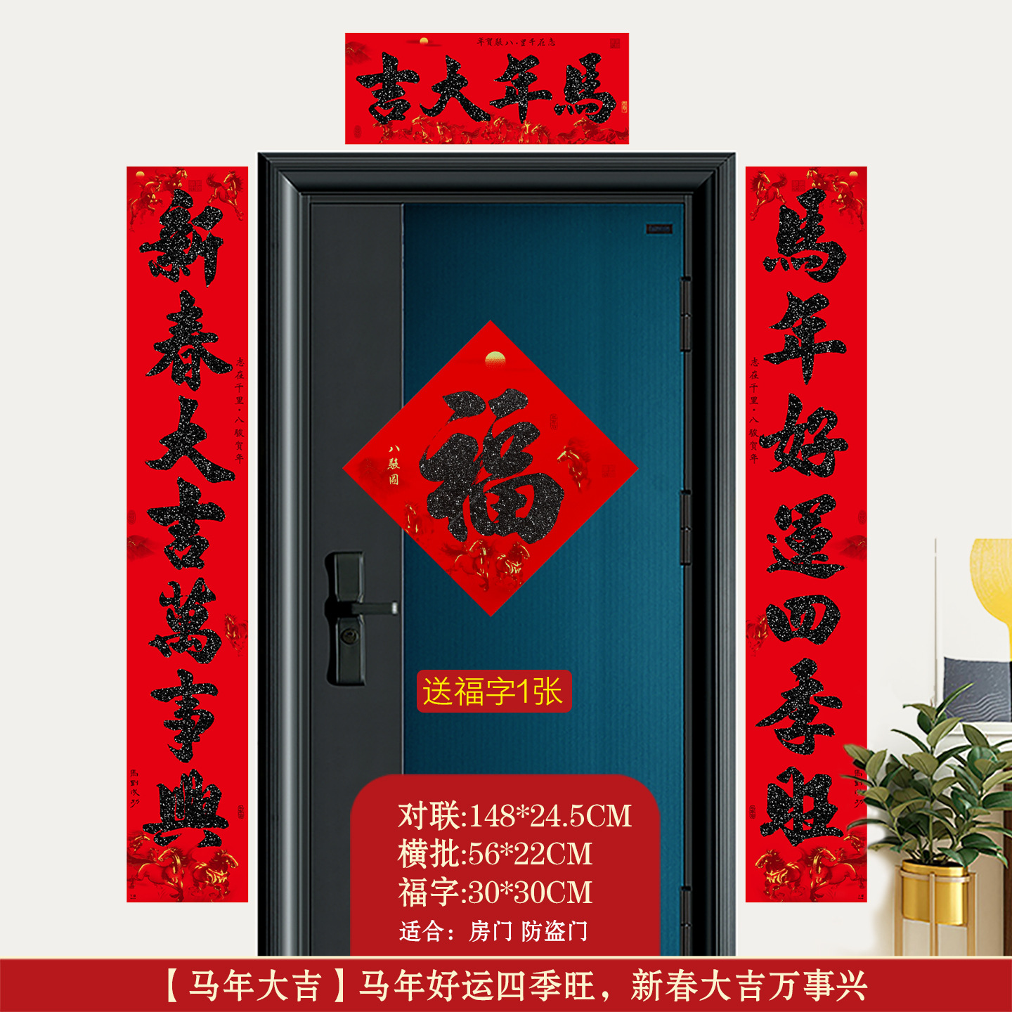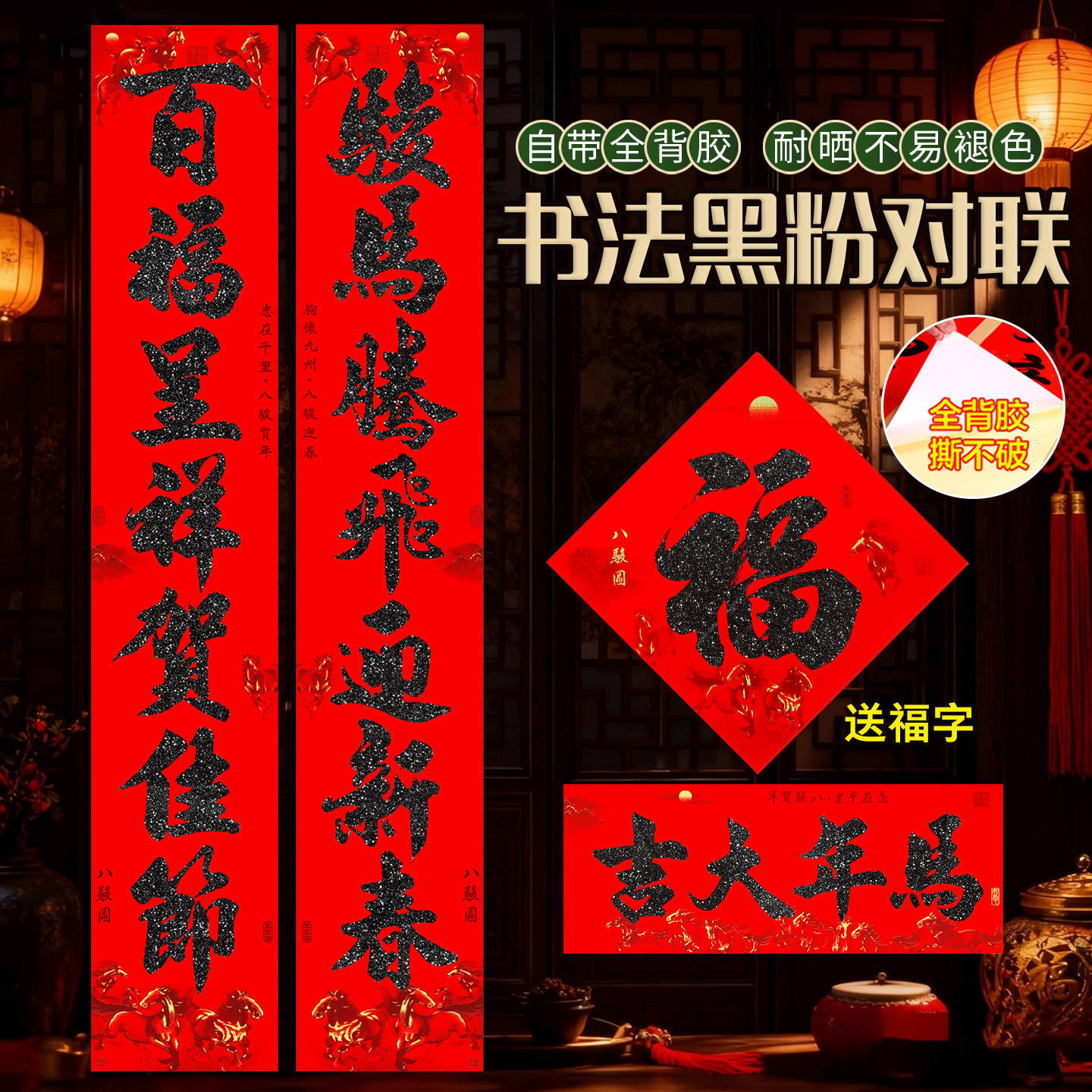 马年黑金粉字对联门贴全背胶入户门福字套装新年春节装饰自粘春联