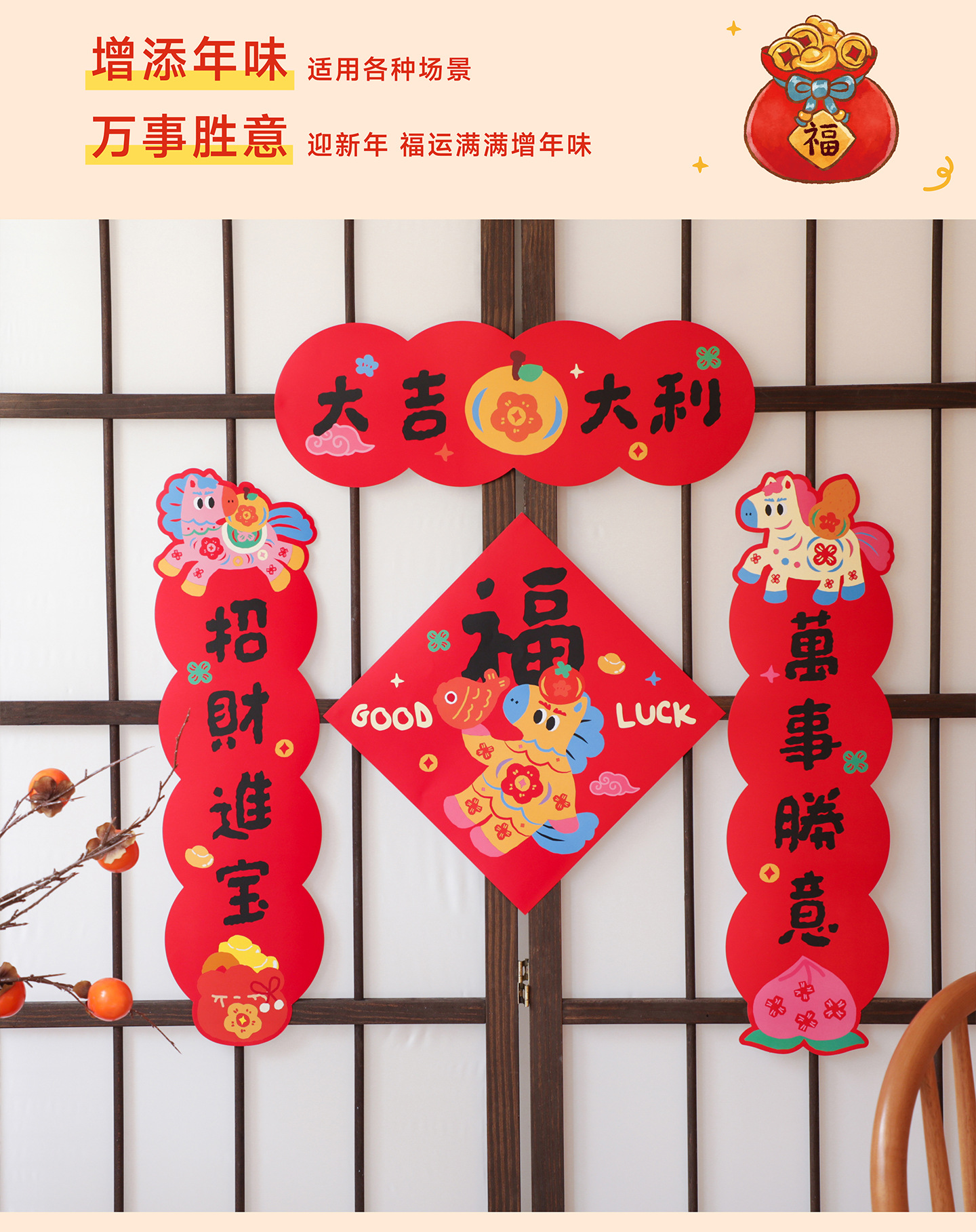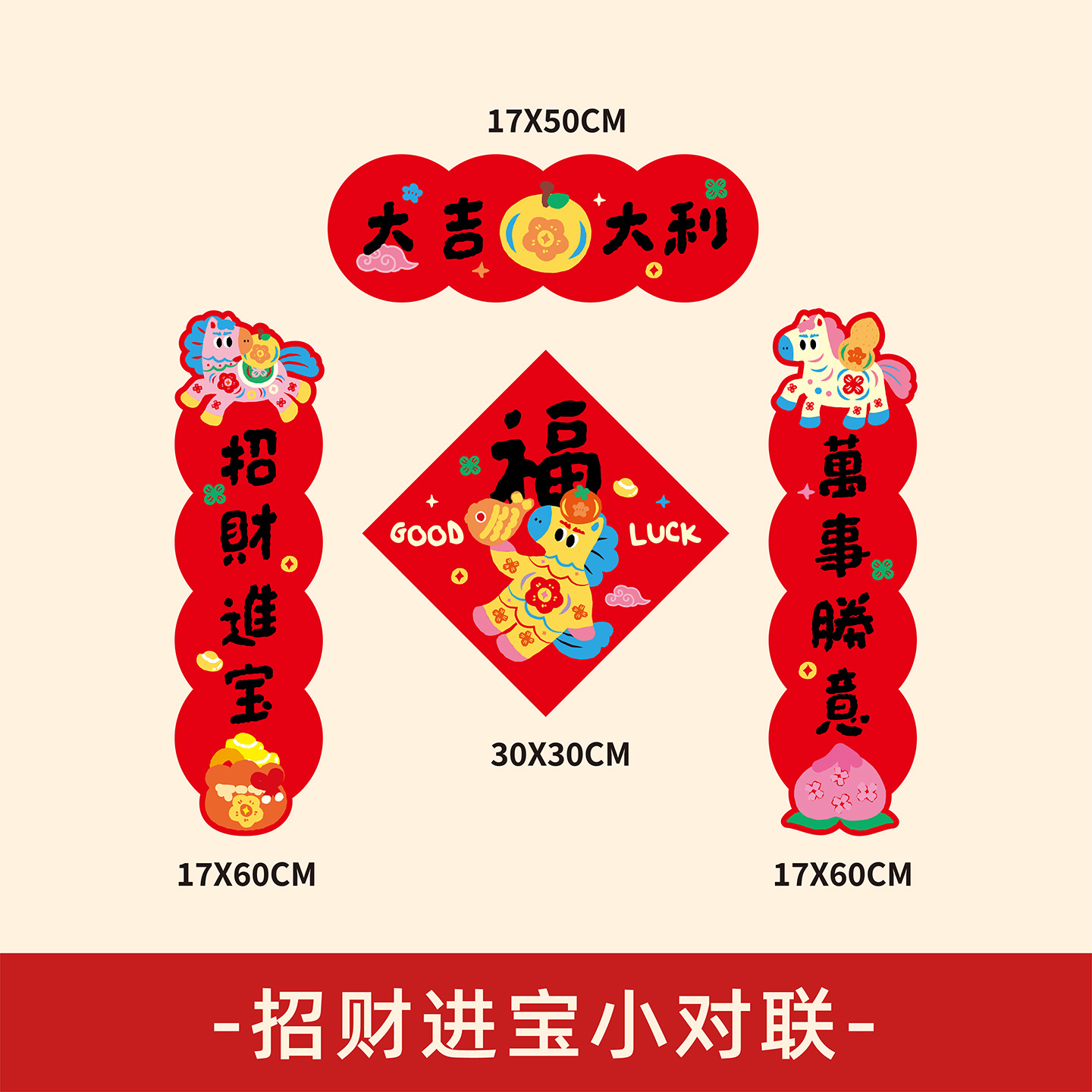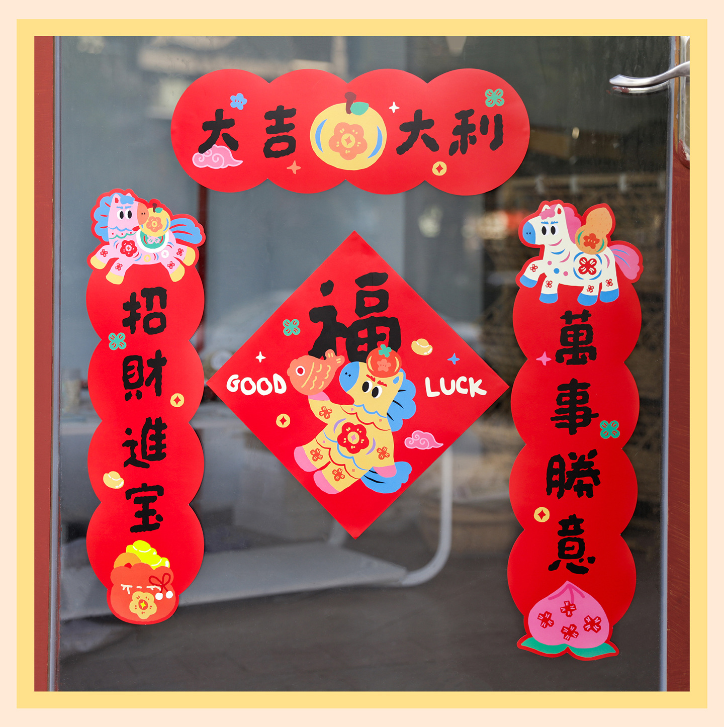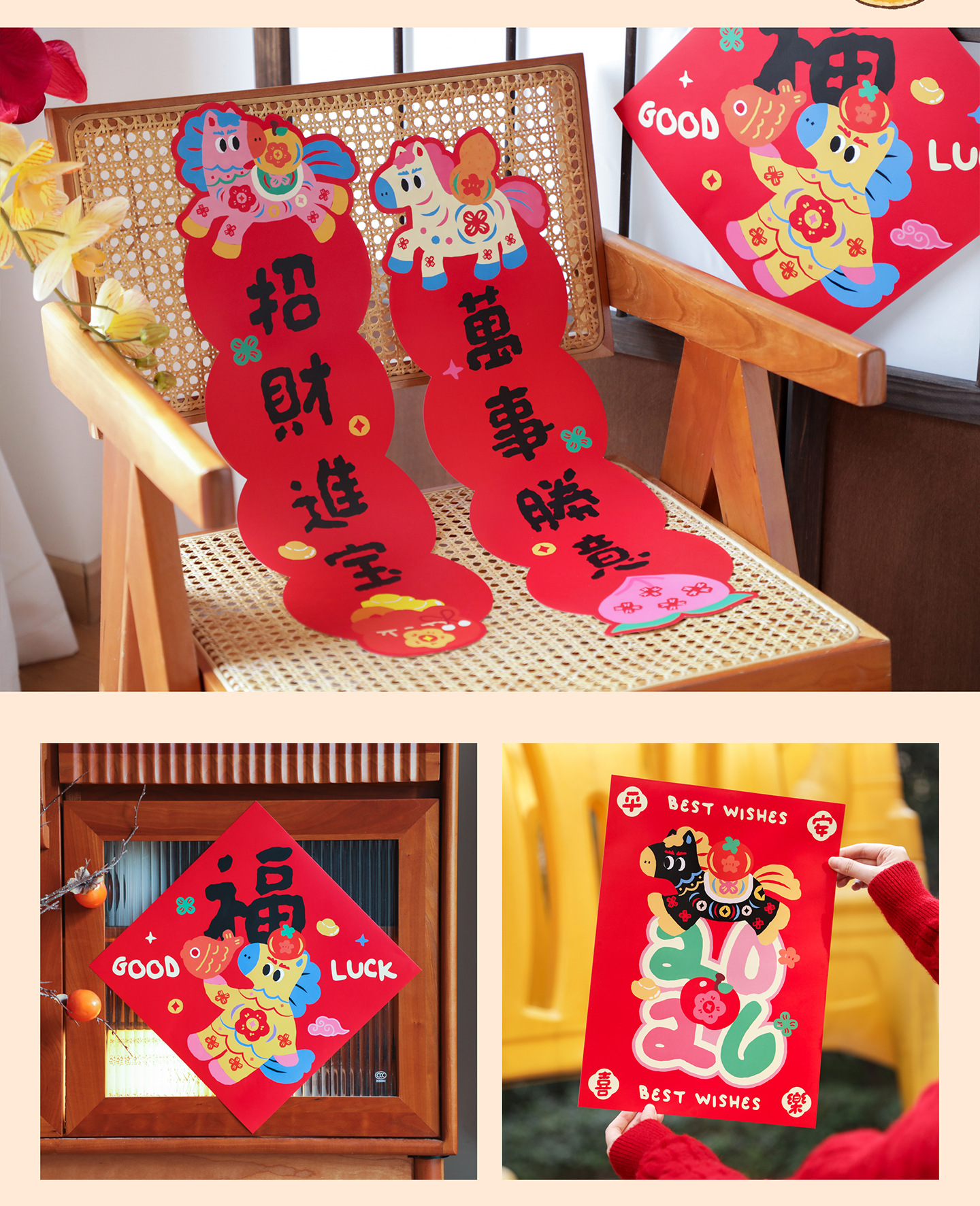马年小对联新年春节装饰门贴卡通可爱小马创意纸质对联小号福字贴