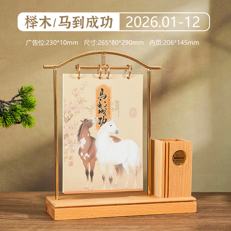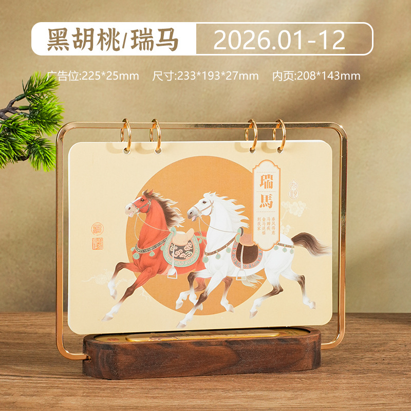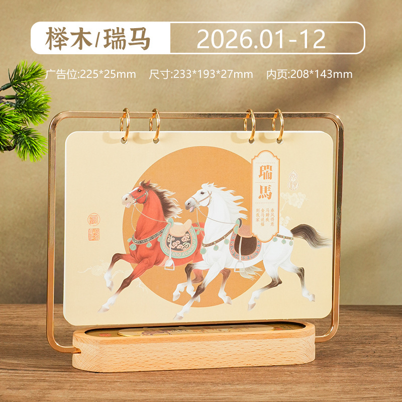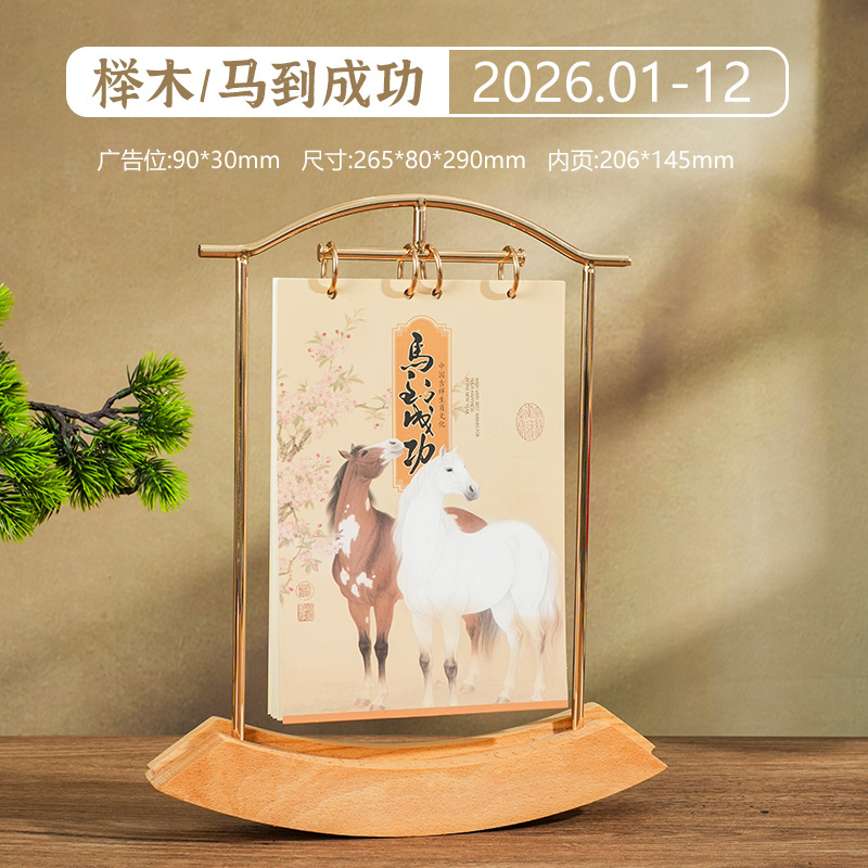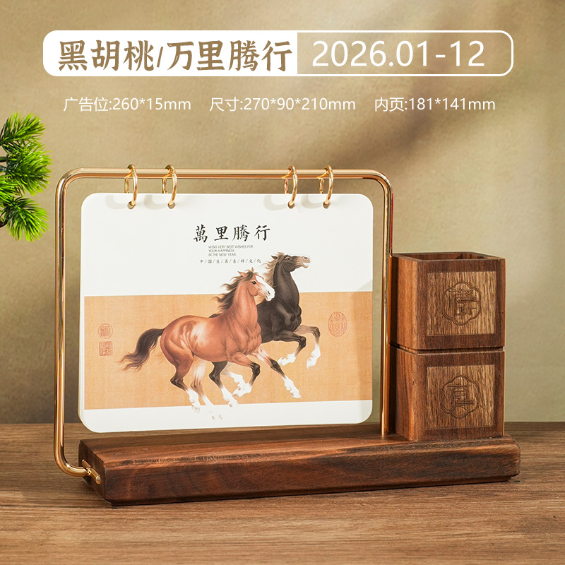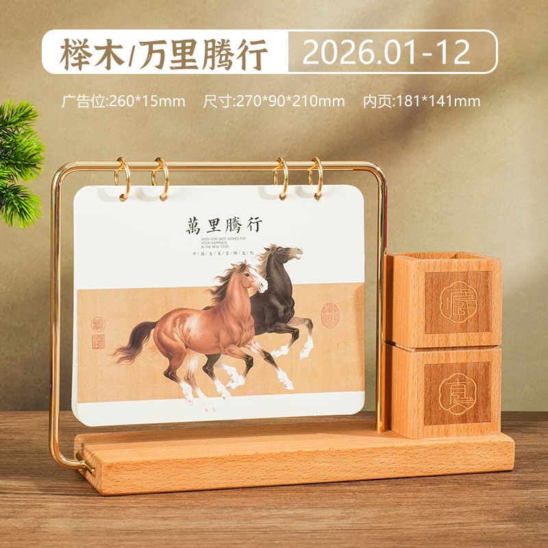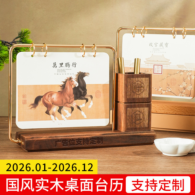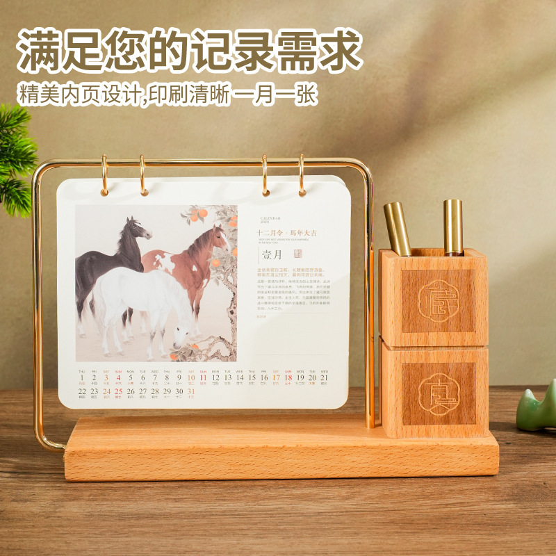 2026马年新款中式皮质台历定 做实木架底座日历摆台创意摆件定 制