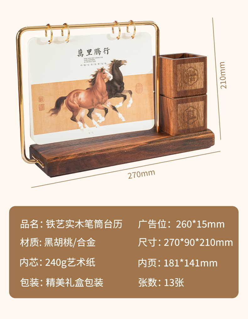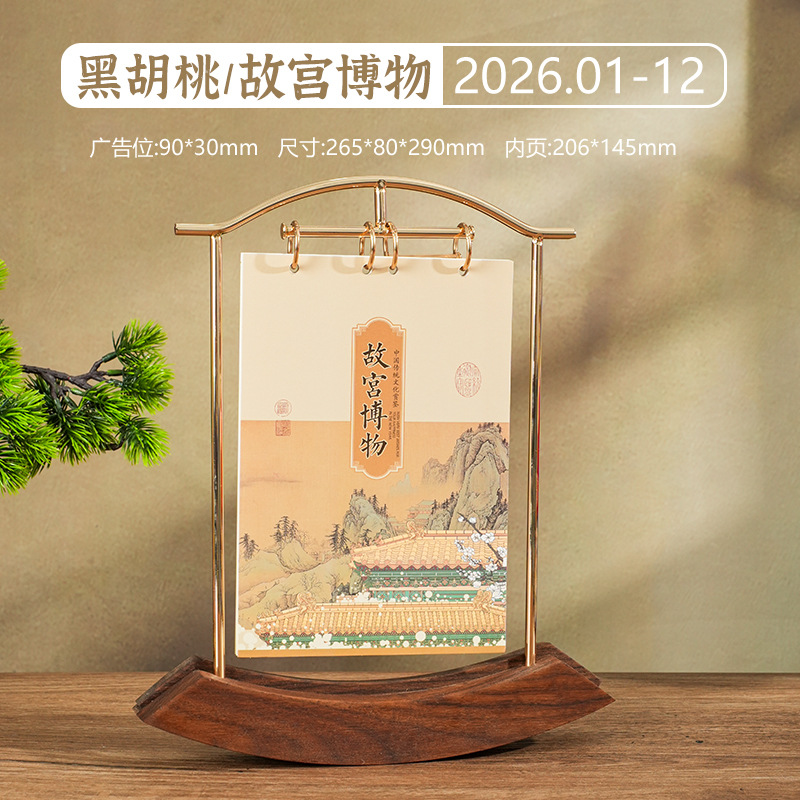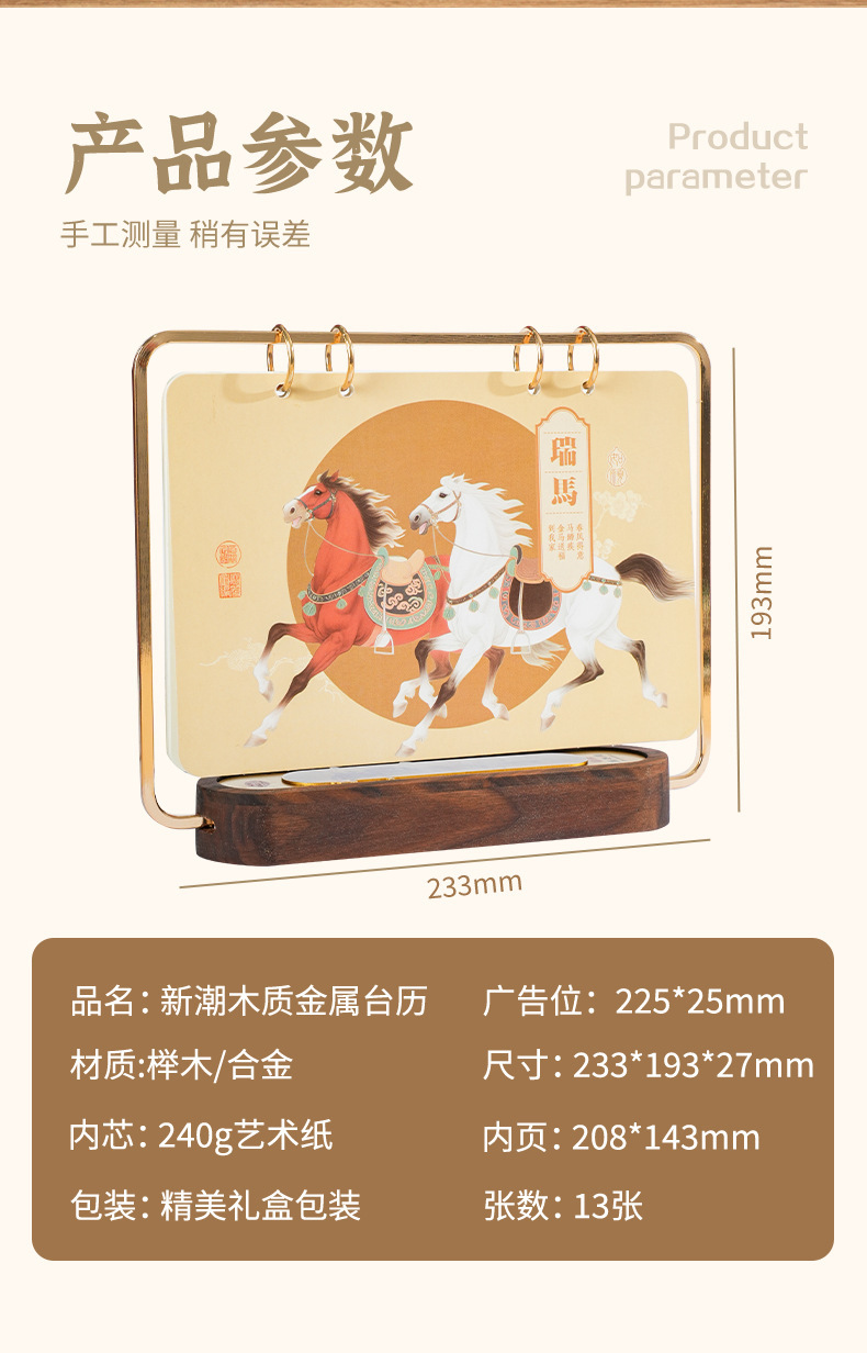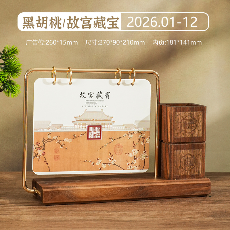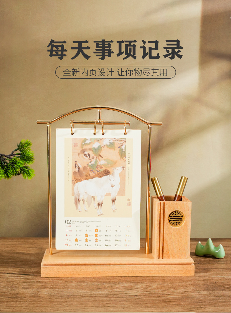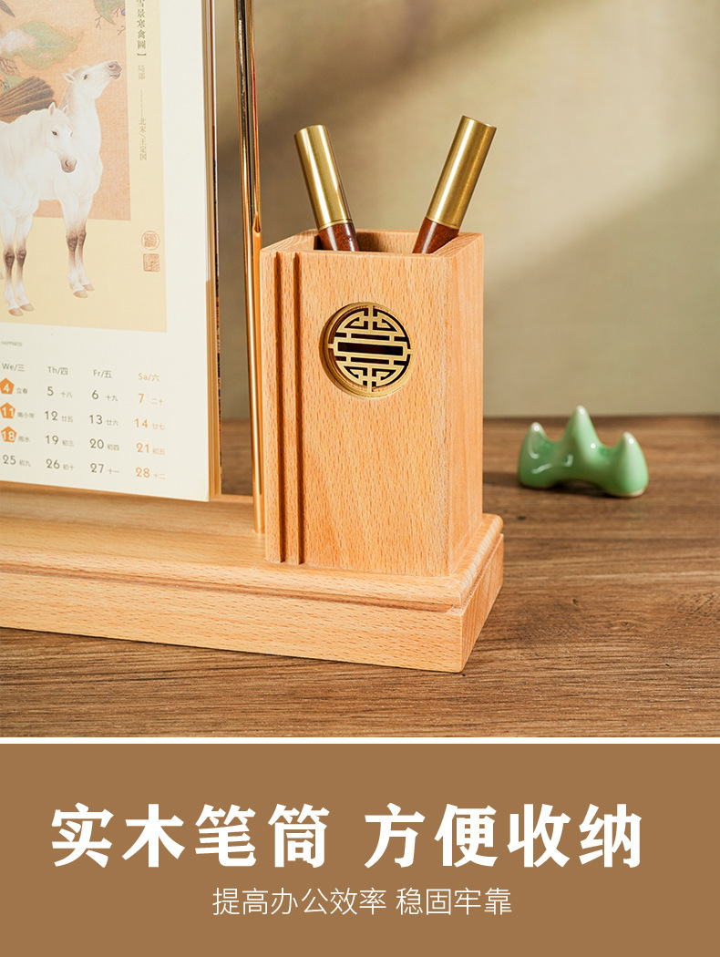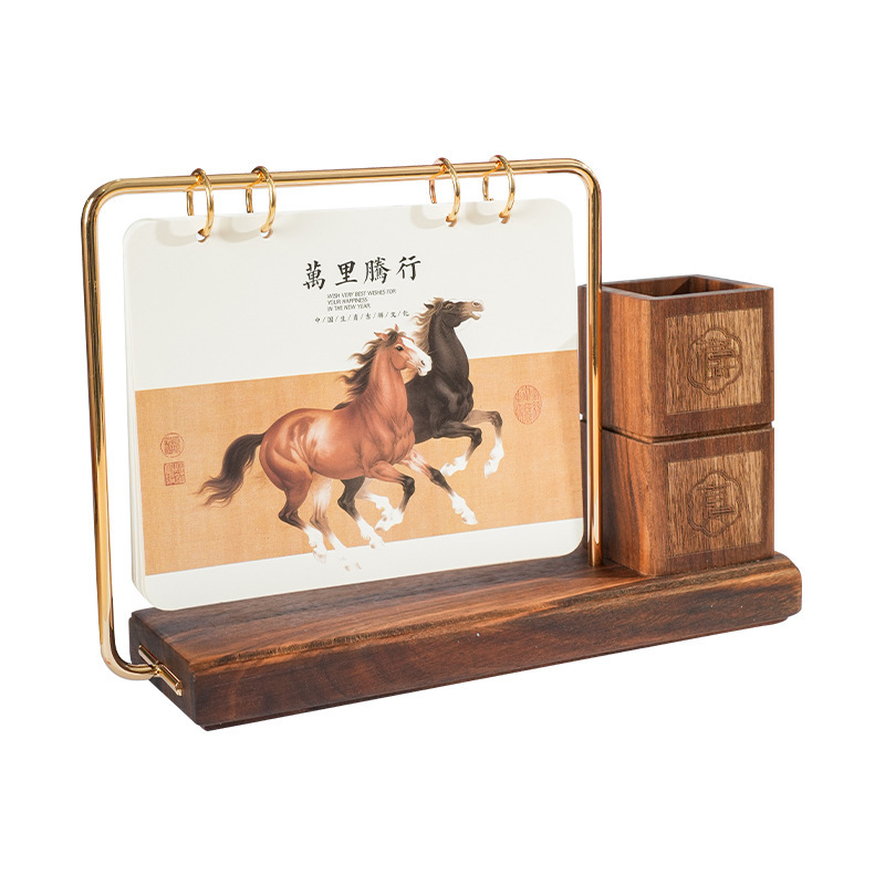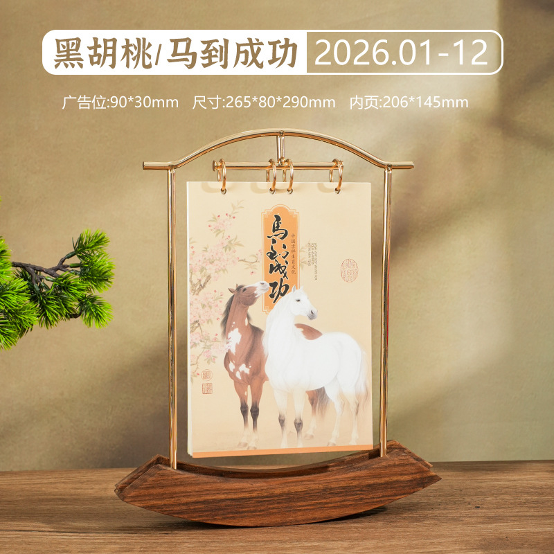 2026马年新款中式皮质台历定 做实木架底座日历摆台创意摆件定 制