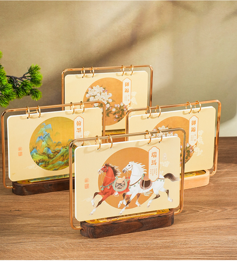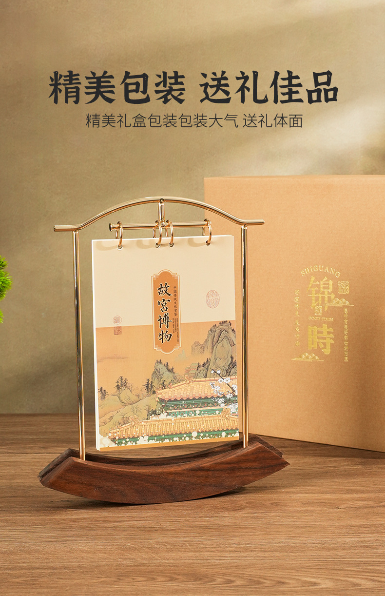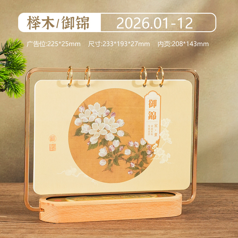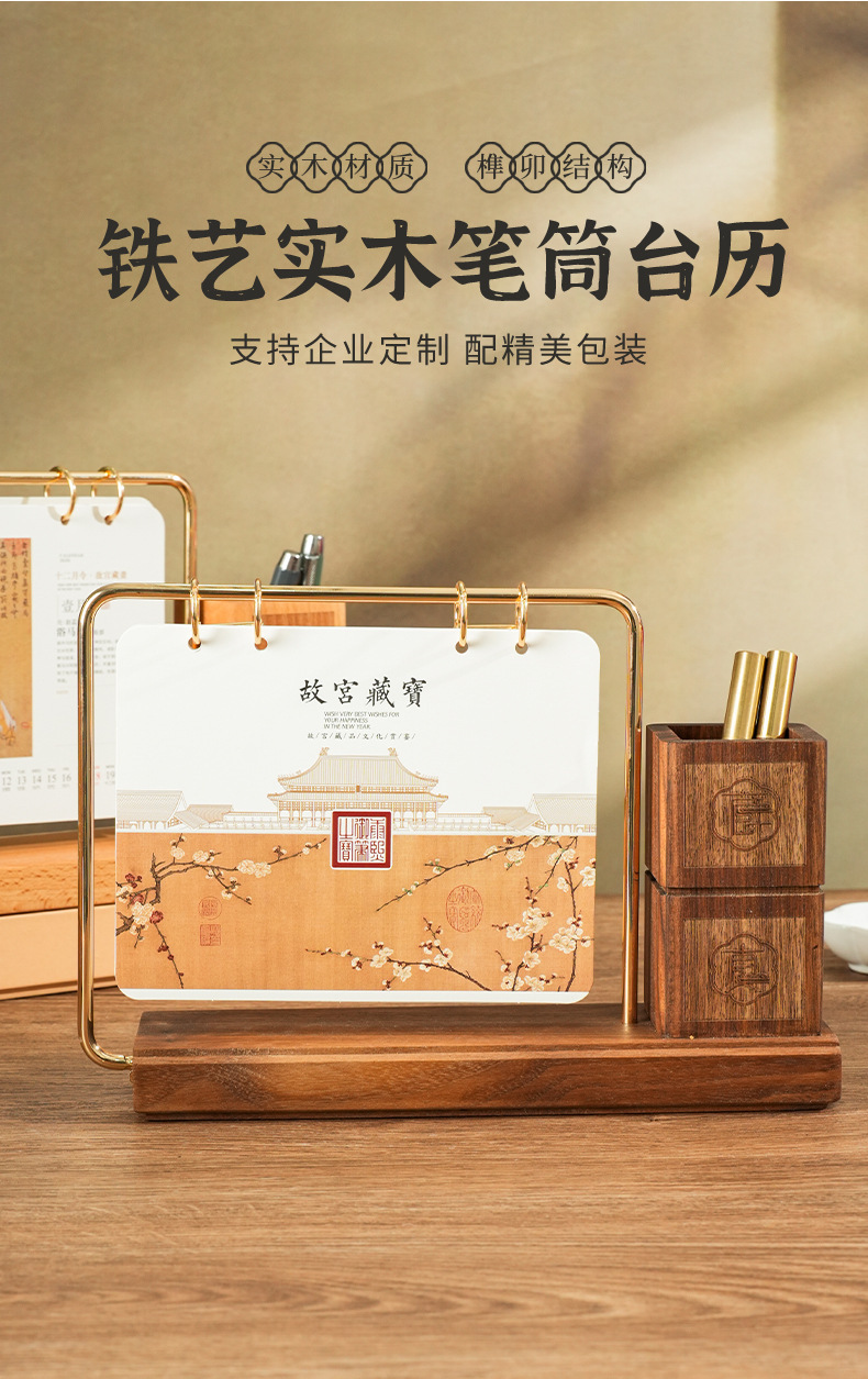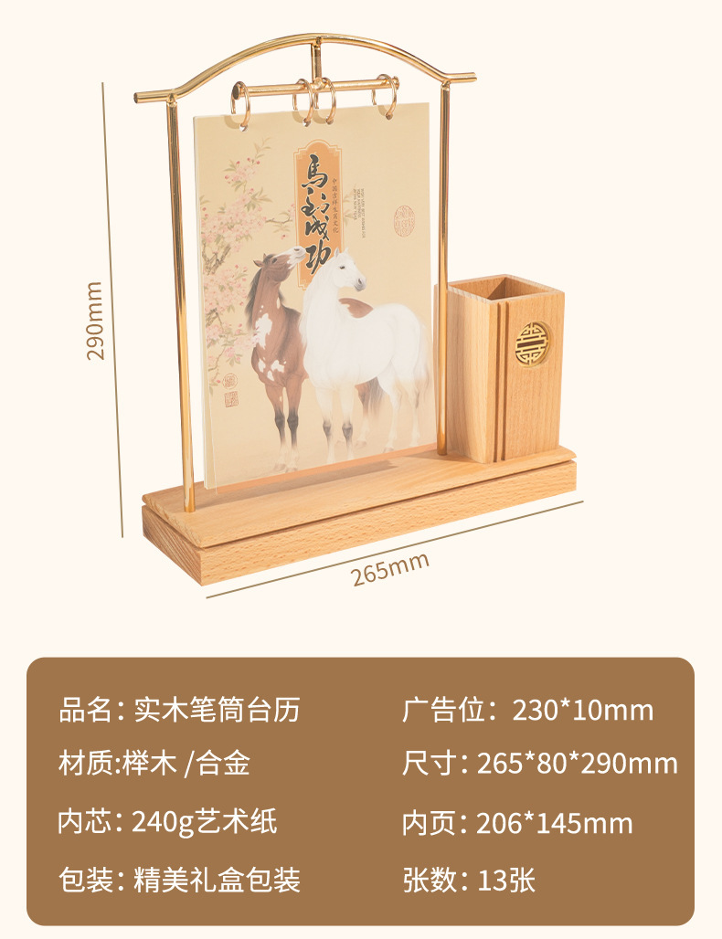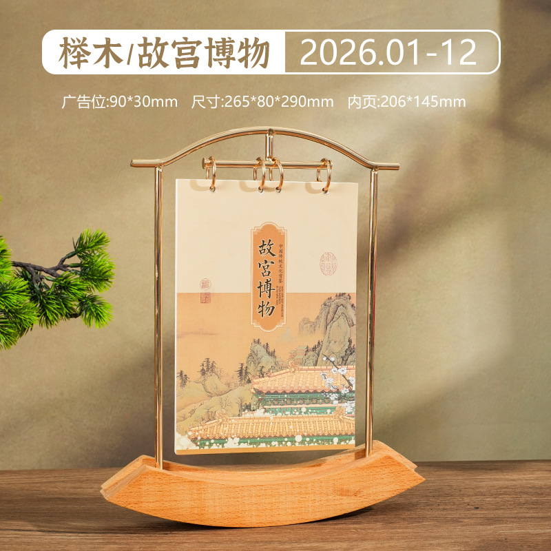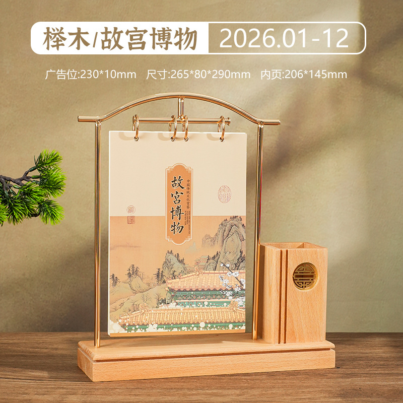 2026马年新款中式皮质台历定 做实木架底座日历摆台创意摆件定 制