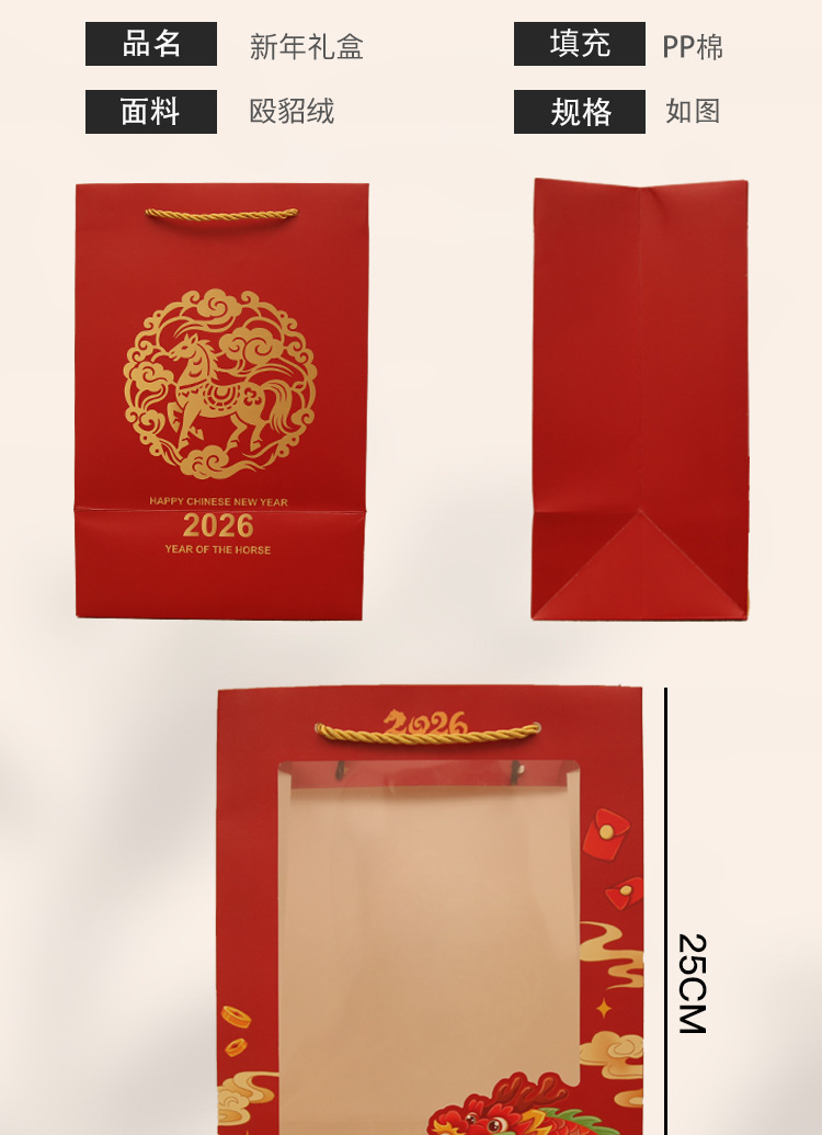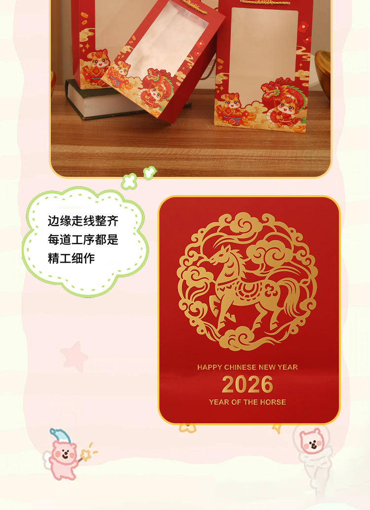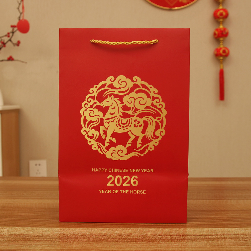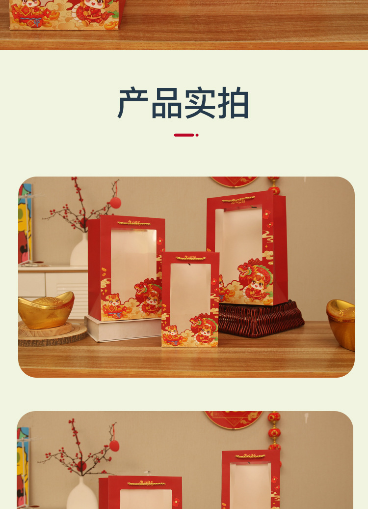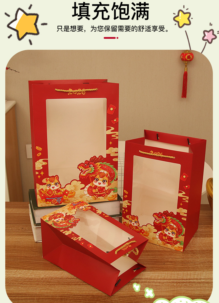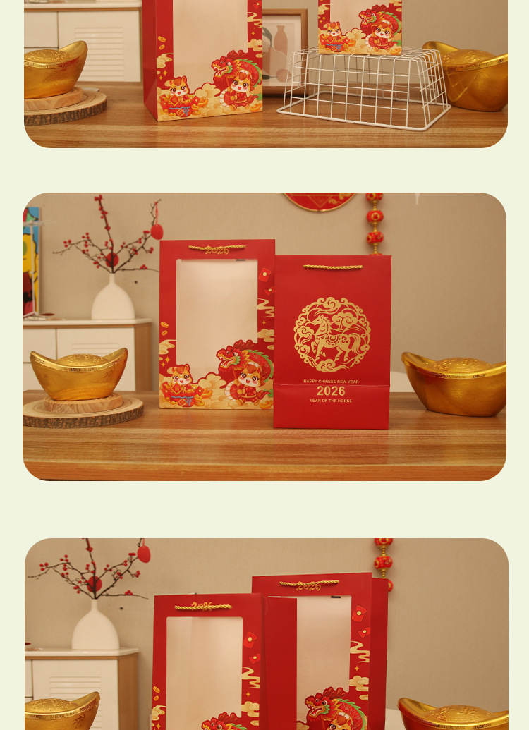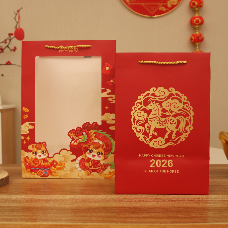 2026年新年马年春节喜庆手提袋透明橱窗伴手礼袋红色公司活动礼盒