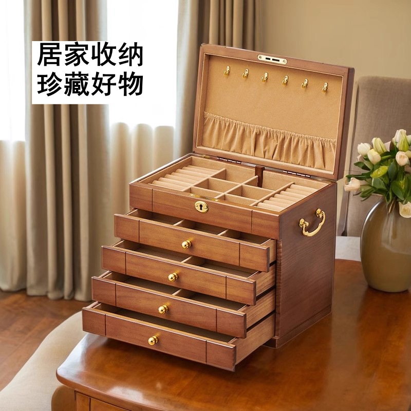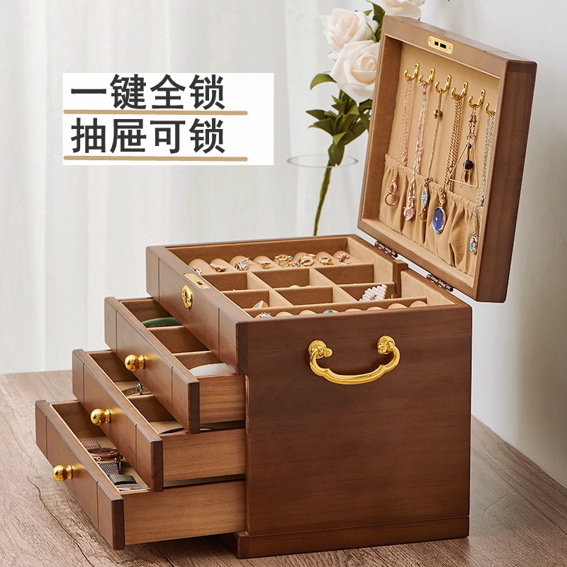 实木首饰盒全锁大容量多功能首饰收纳盒饰品盒结婚送礼抽屉式收纳