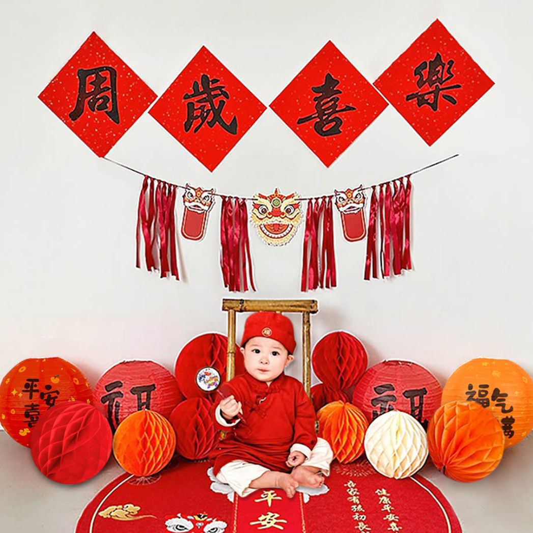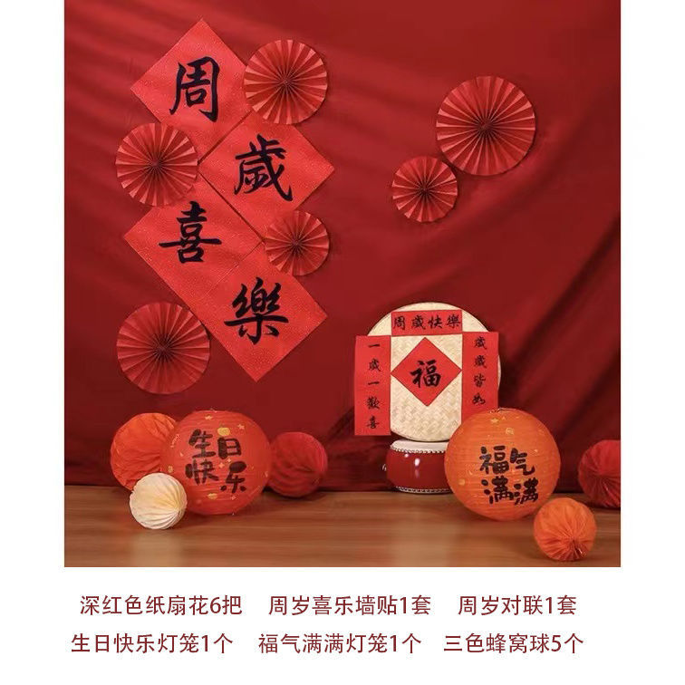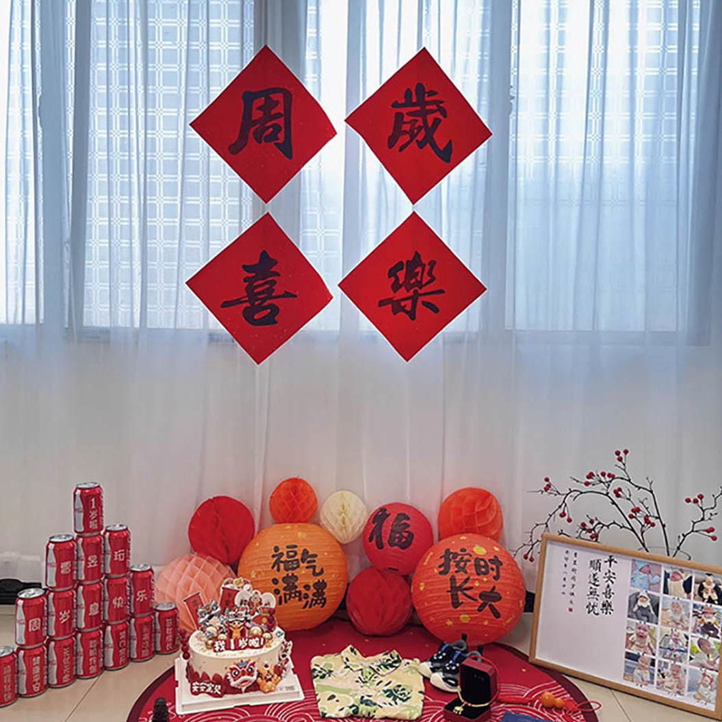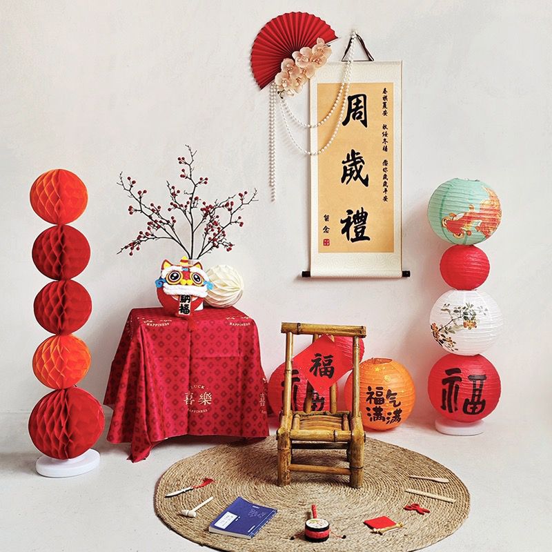宝宝周岁生日布置古风福气满满纸灯笼蜂窝球立柱抓周仪式感道具