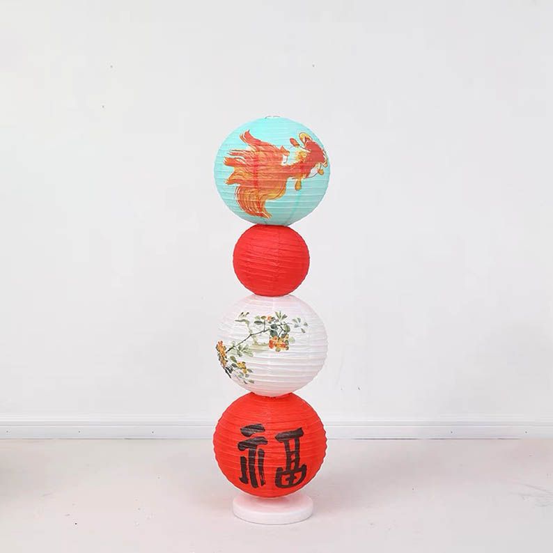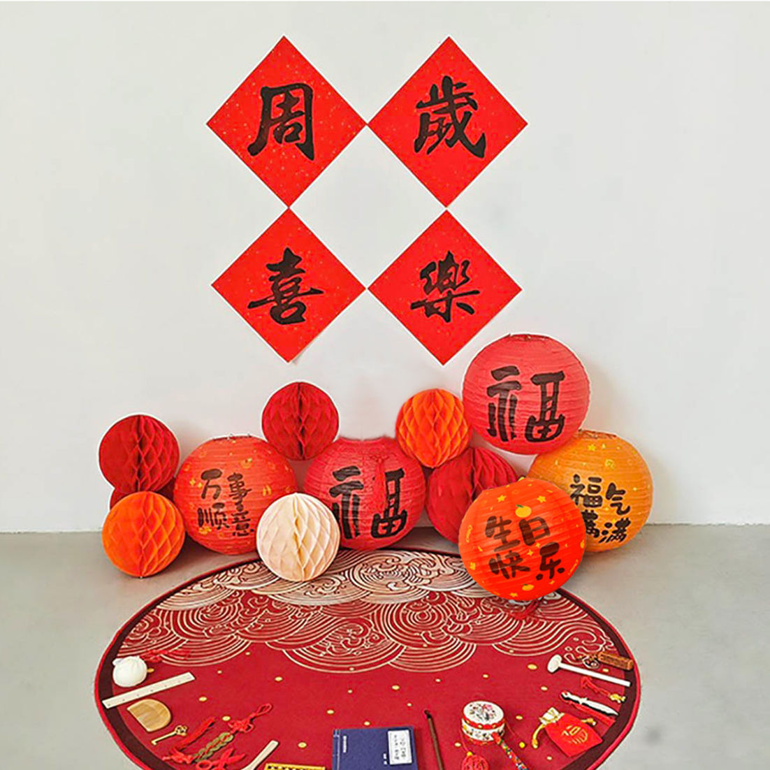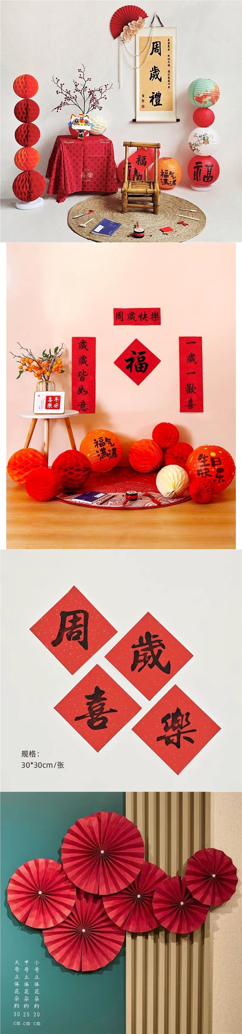 宝宝周岁生日布置古风福气满满纸灯笼蜂窝球立柱抓周仪式感道具