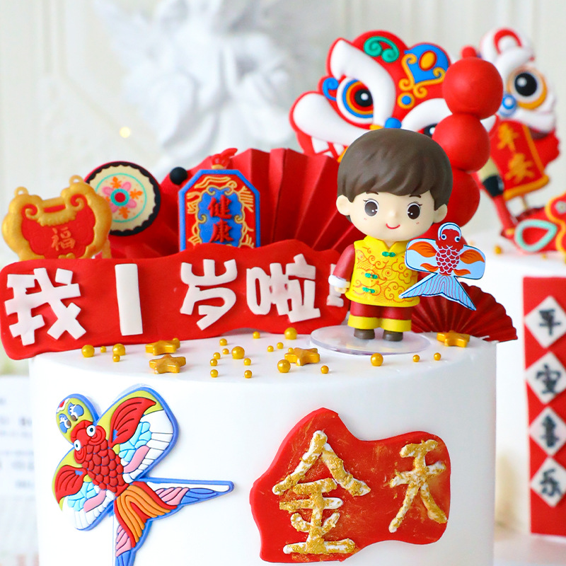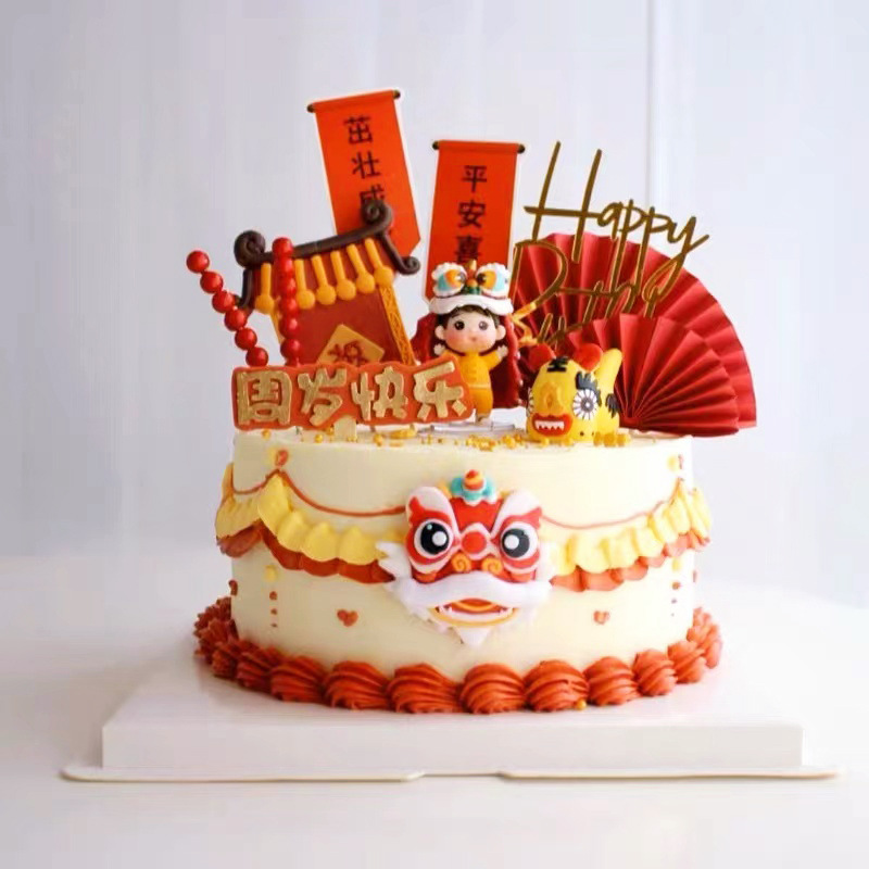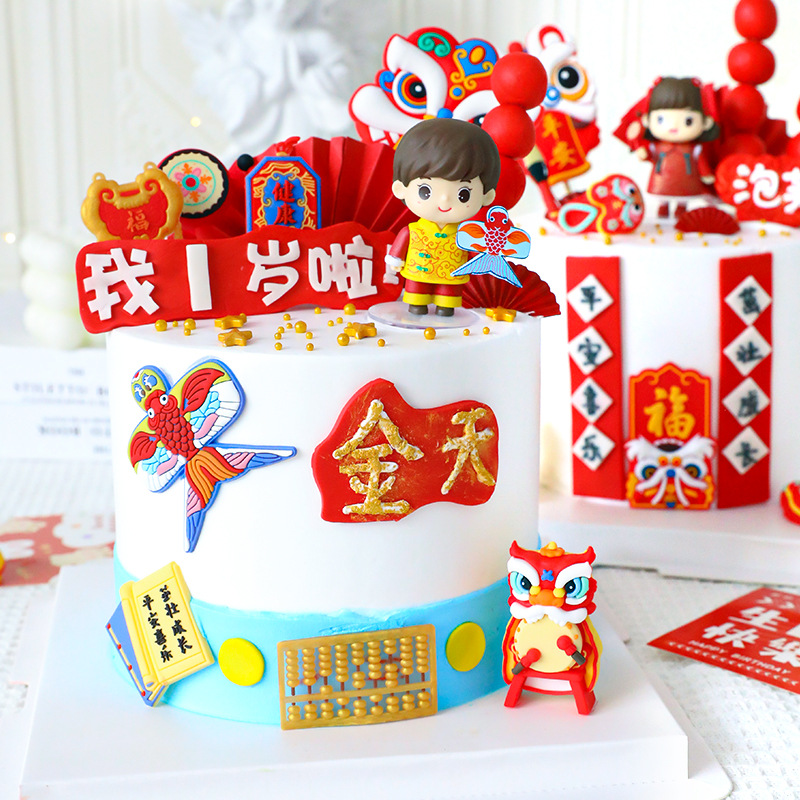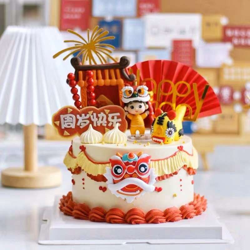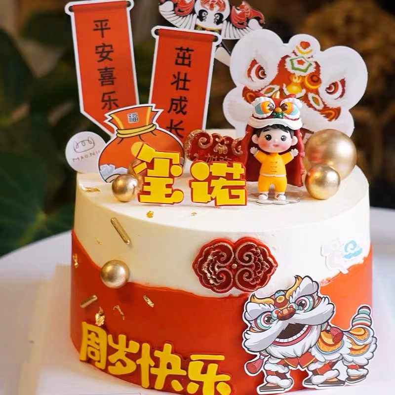 中式国潮风舞狮醒狮生日蛋糕装饰摆件宝宝周岁生日甜品台插件配件