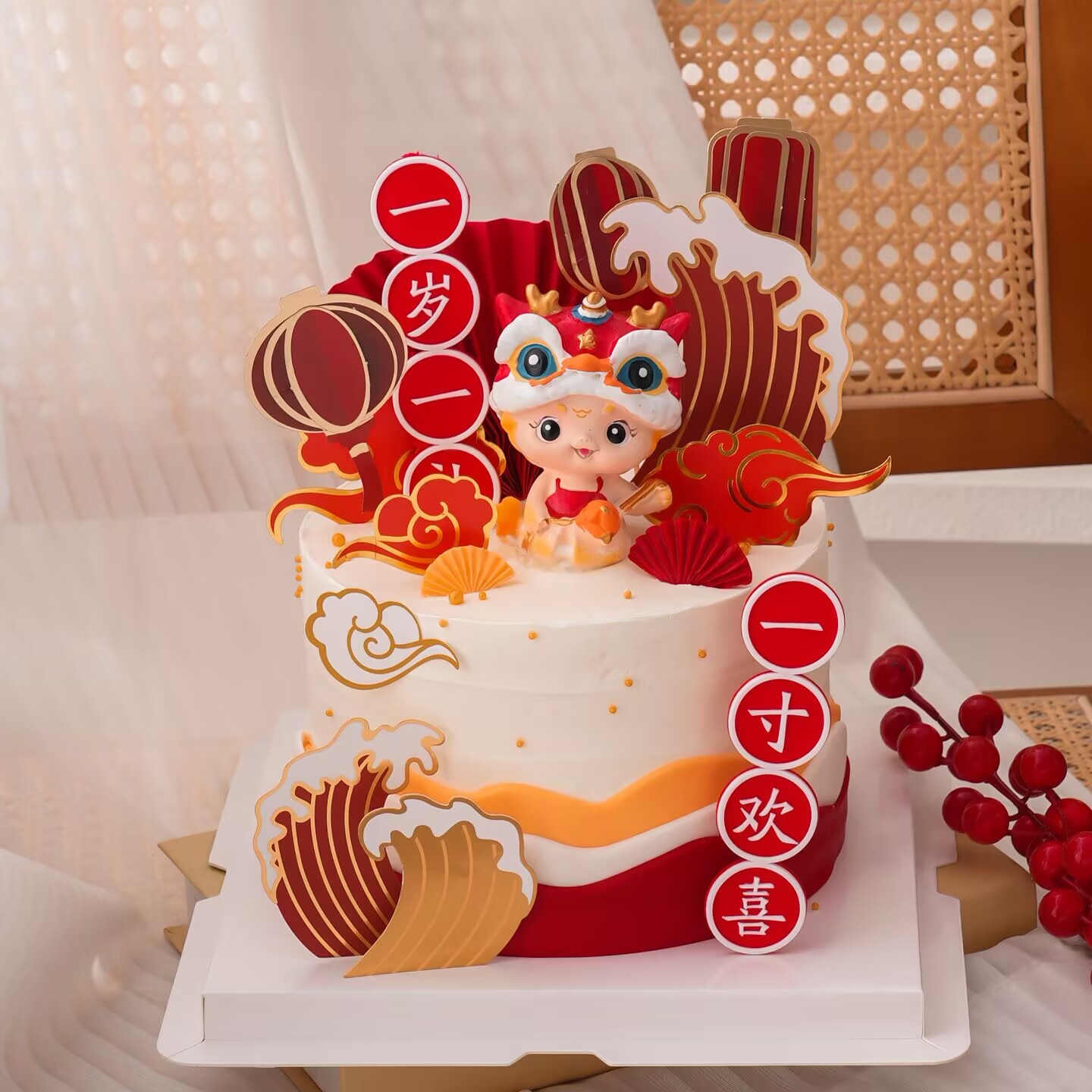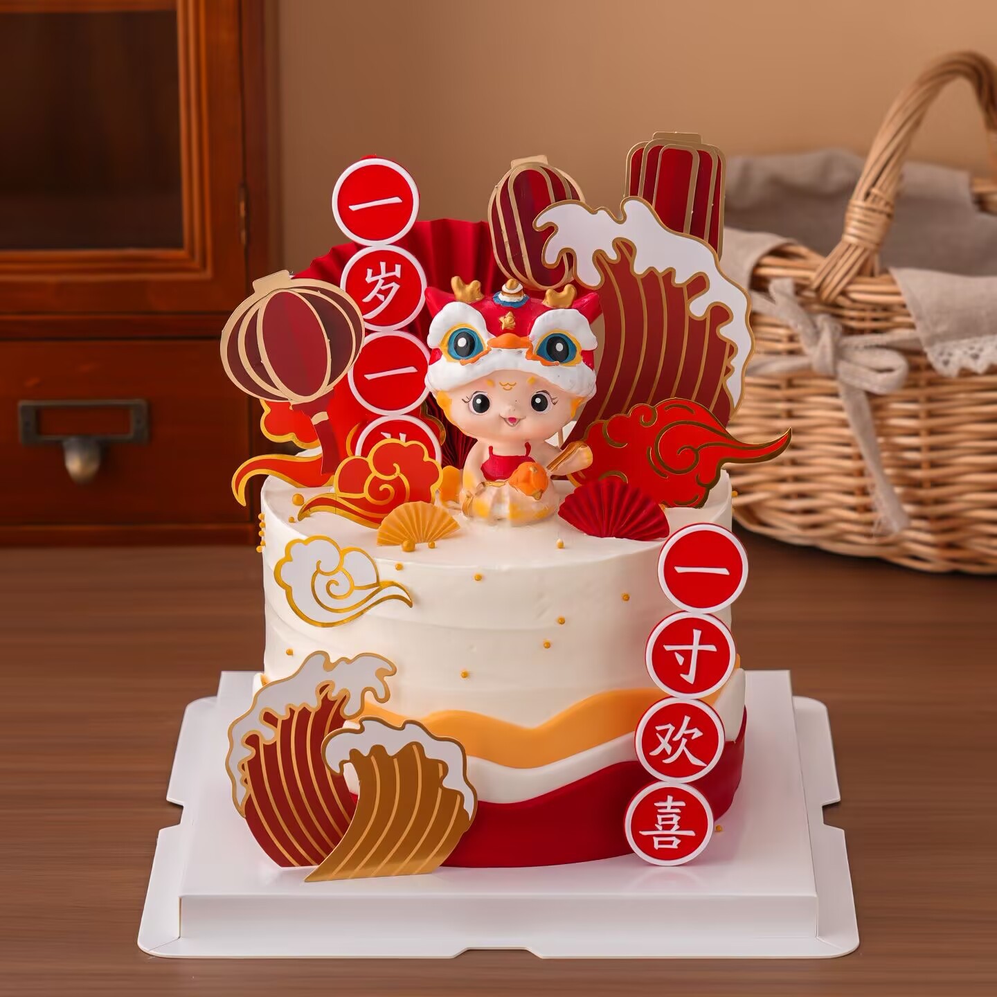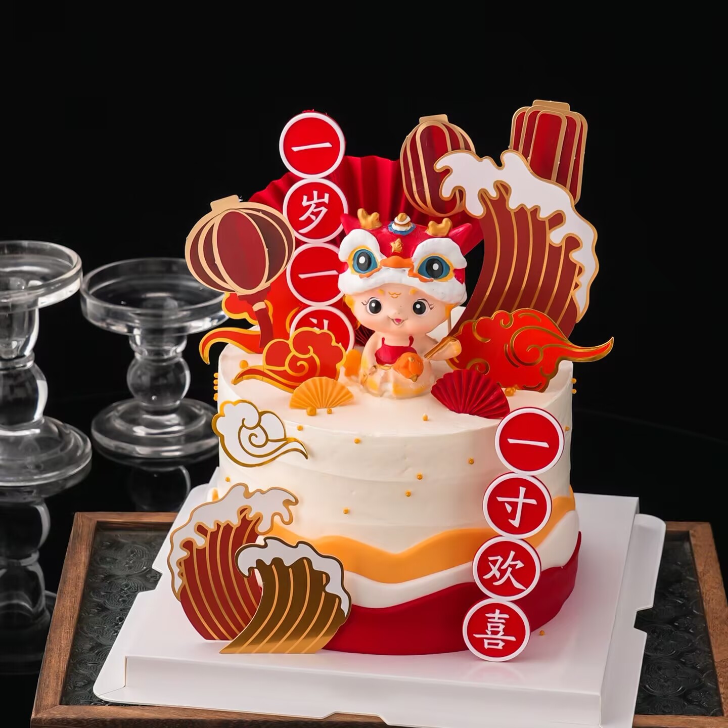 中式绣球龙宝宝周岁礼蛋糕装饰摆件儿童生日周岁宴甜品台装扮插件