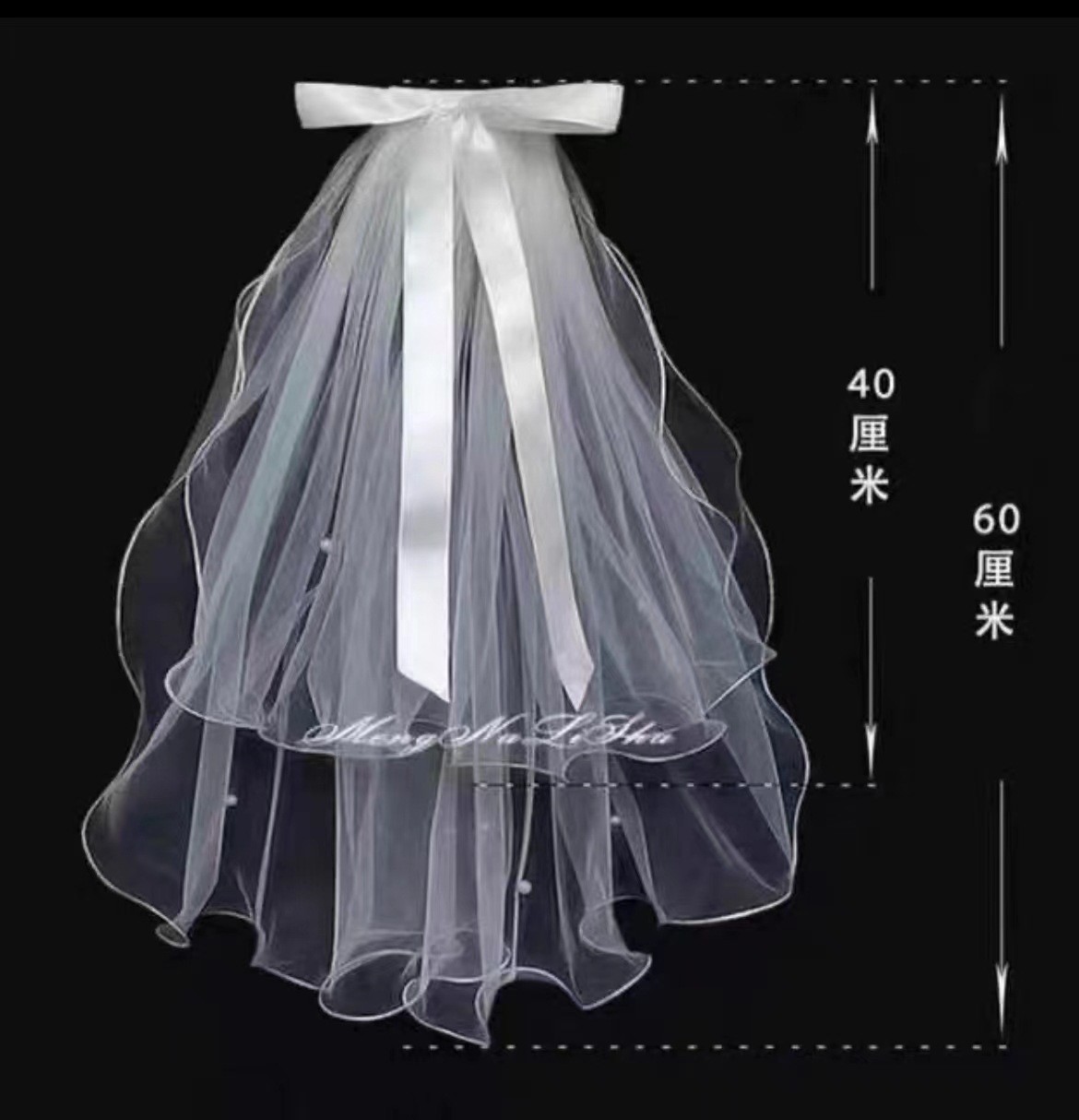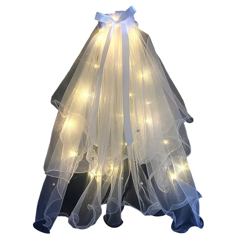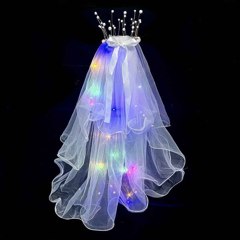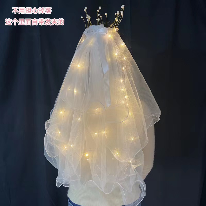 儿童发光头纱仙气带珍珠双层头纱高级感摆摊拍照道具结婚领证头纱