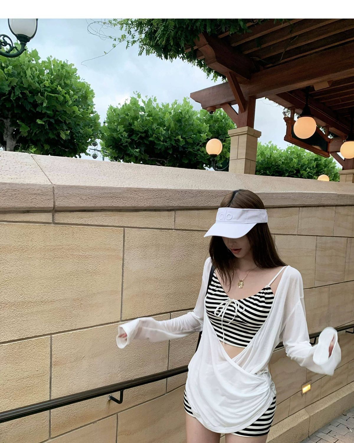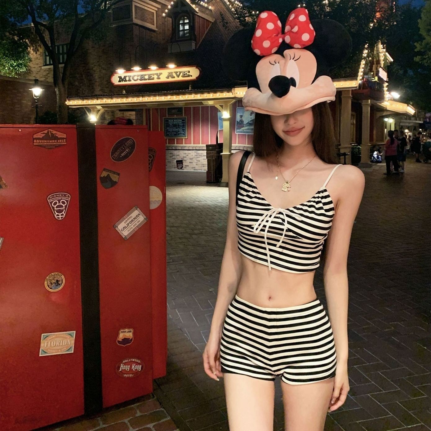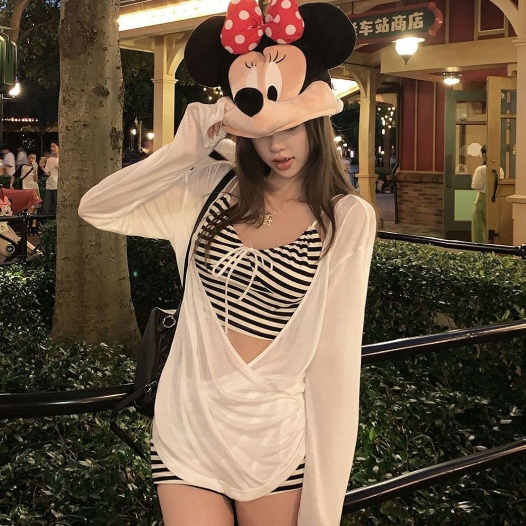 2025新款甜美少女复古条纹简约分体泳衣高腰遮肚显瘦度假泳装女