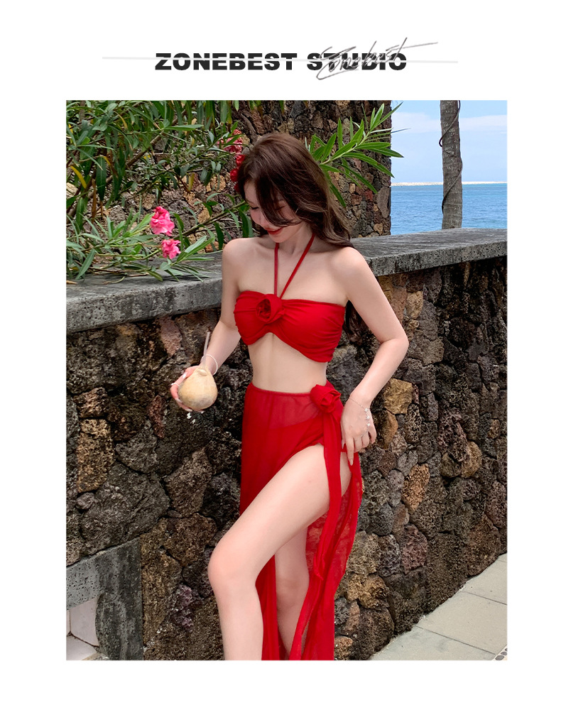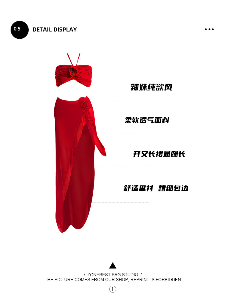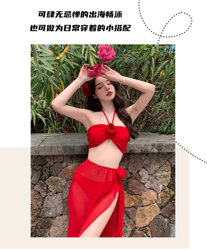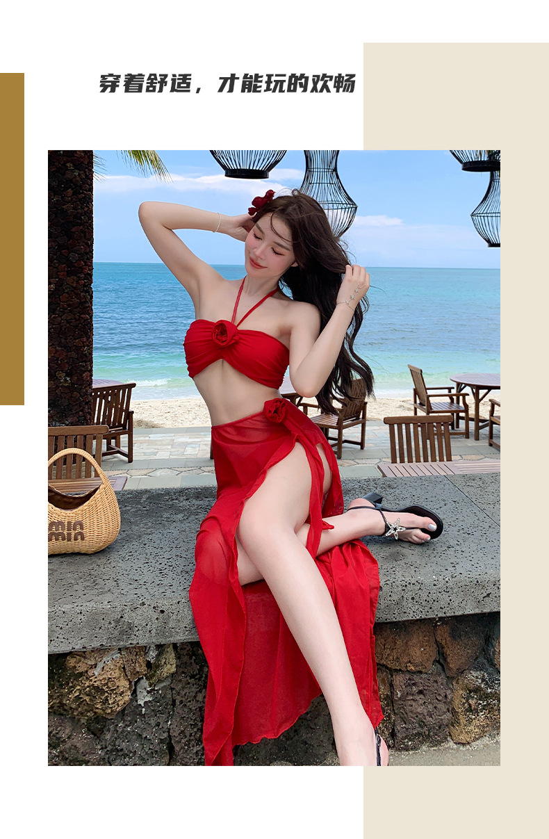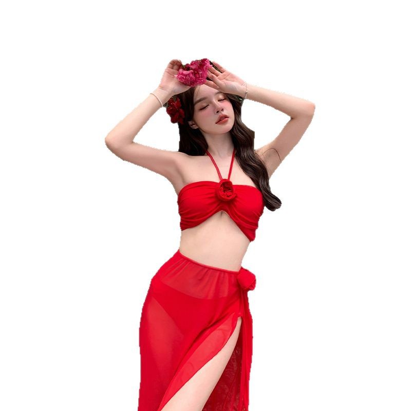 2025新款红色挂脖泳衣女性感显瘦分体比基尼裙式感小胸温泉泳装女