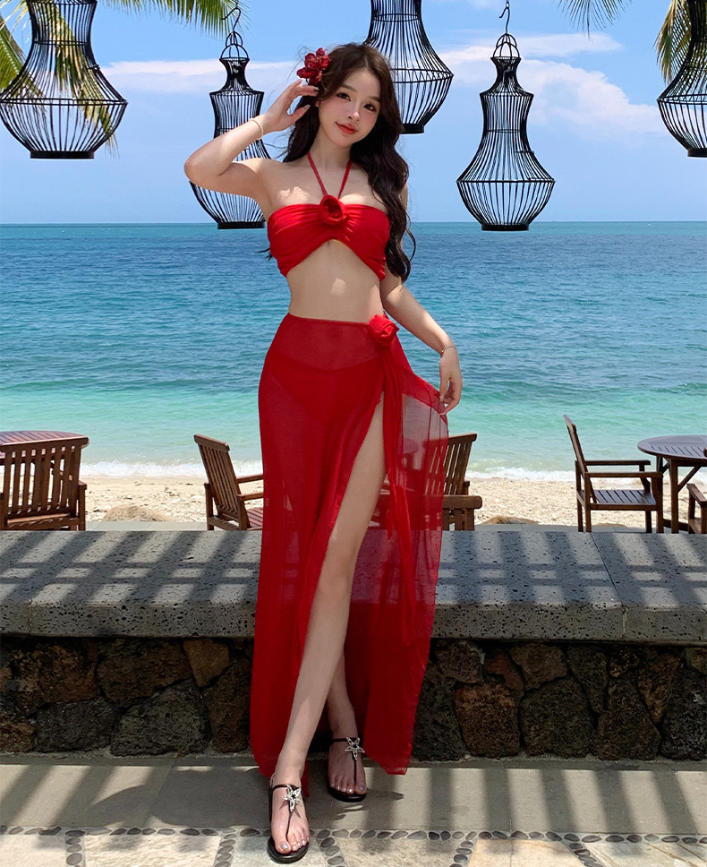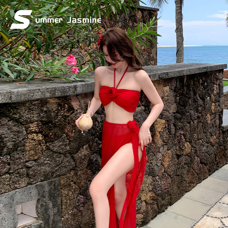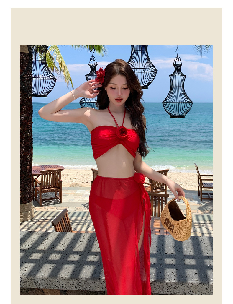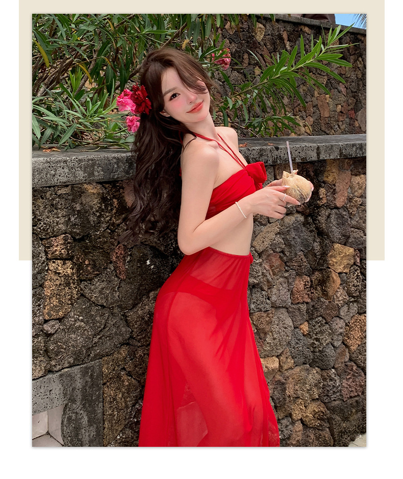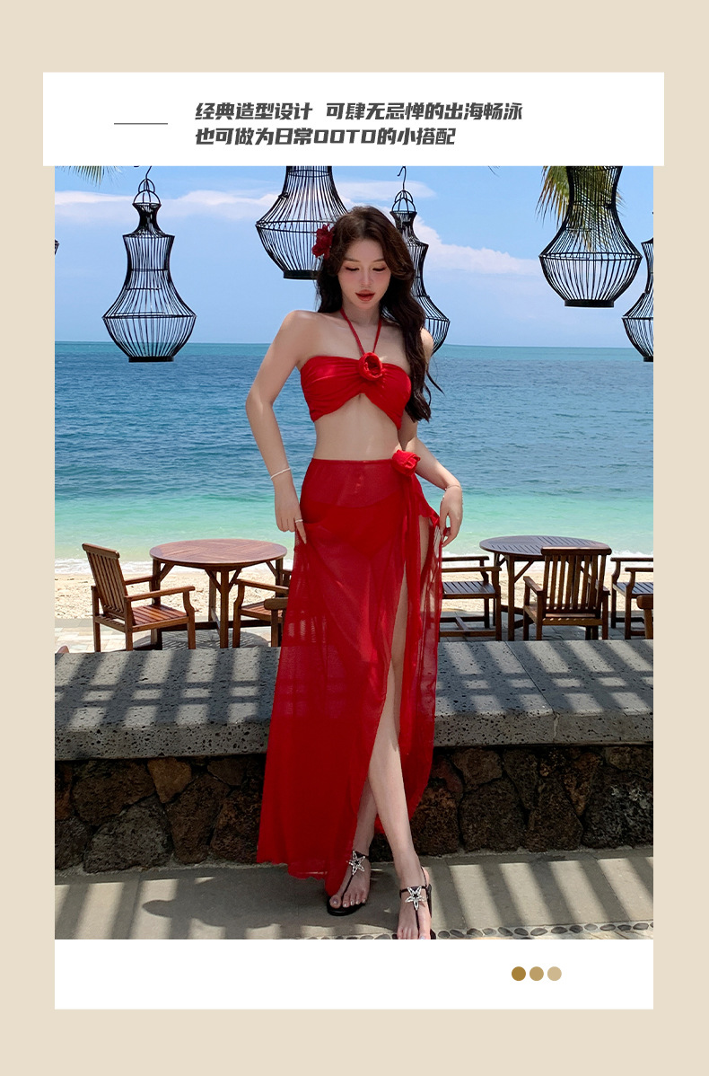 2025新款红色挂脖泳衣女性感显瘦分体比基尼裙式感小胸温泉泳装女