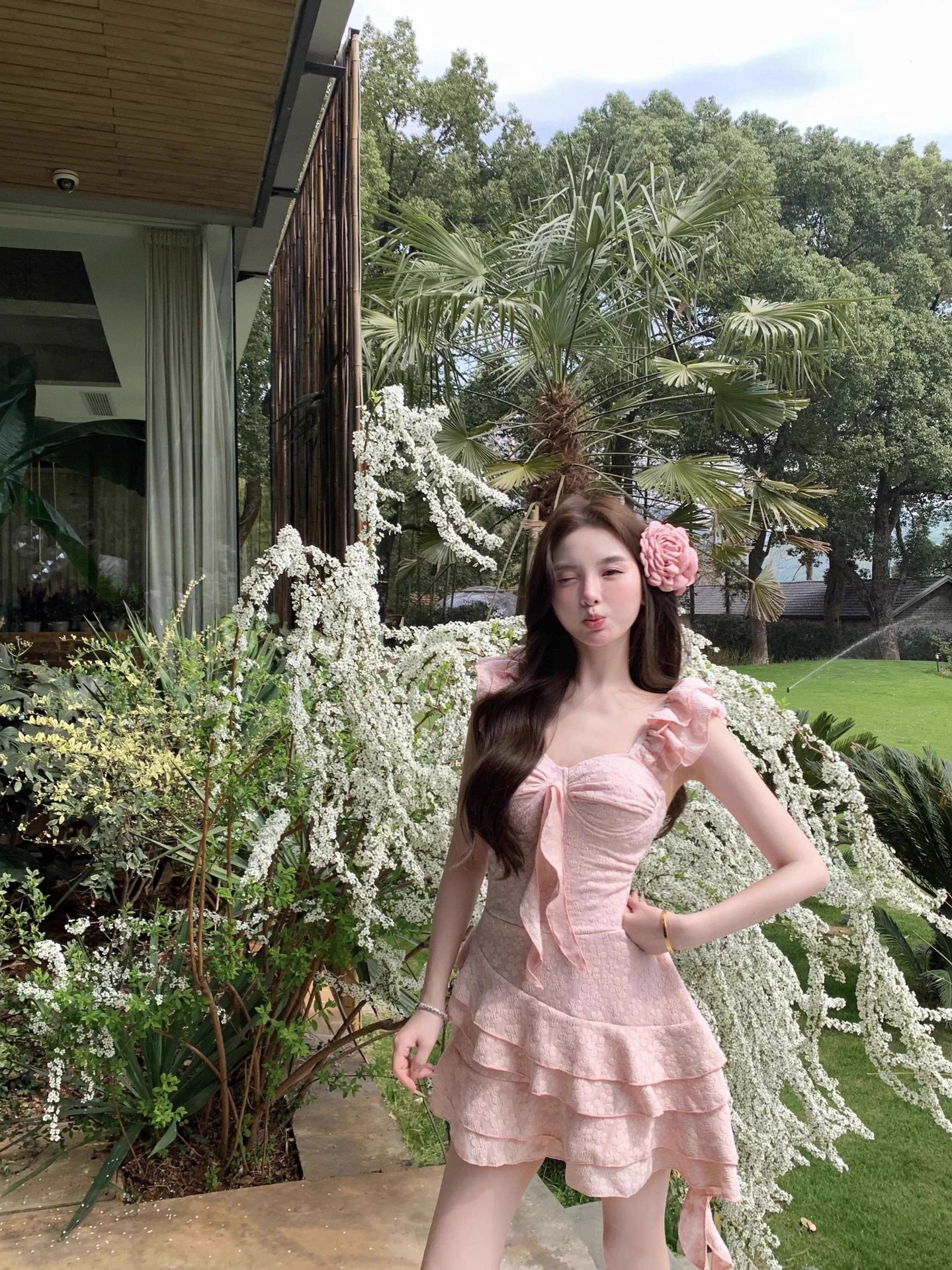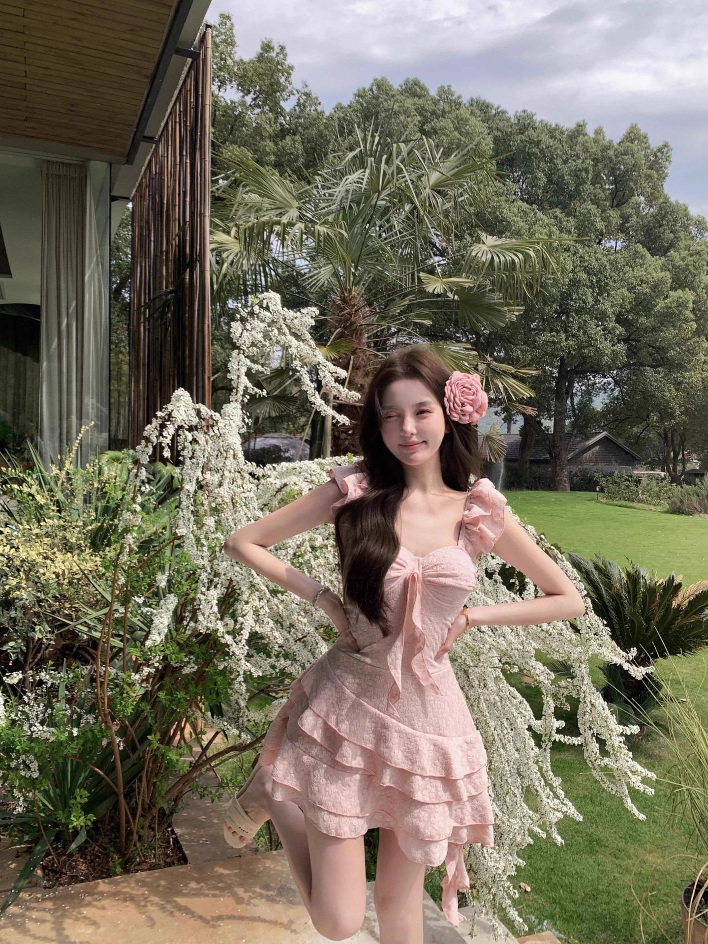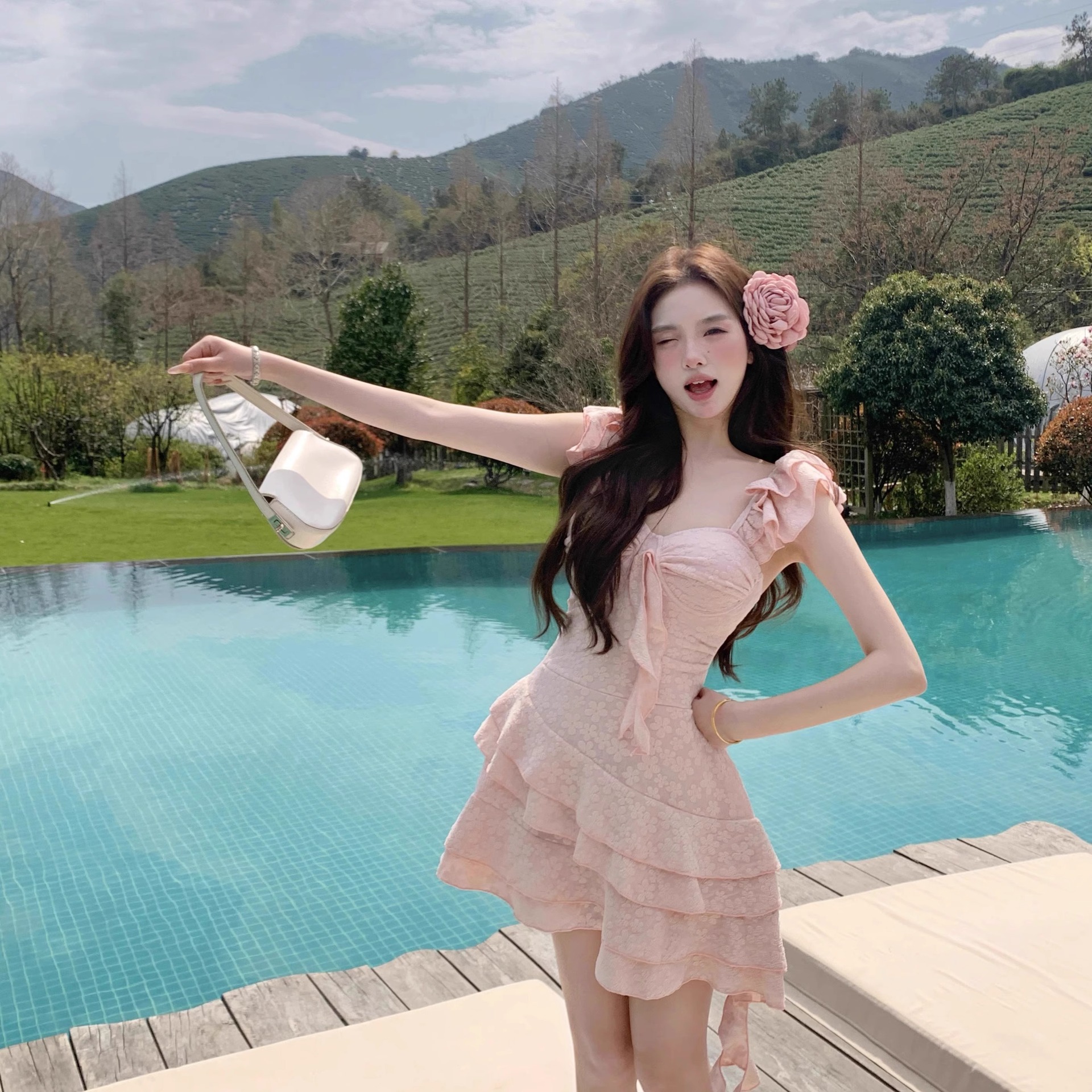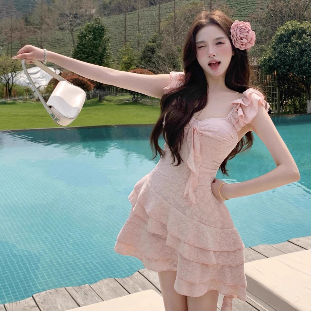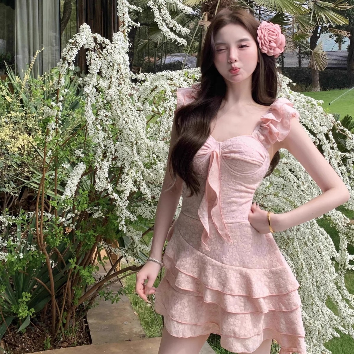 2025新款甜美樱花粉少女纯欲连体泳衣小飞袖显瘦遮肚温泉度假泳衣