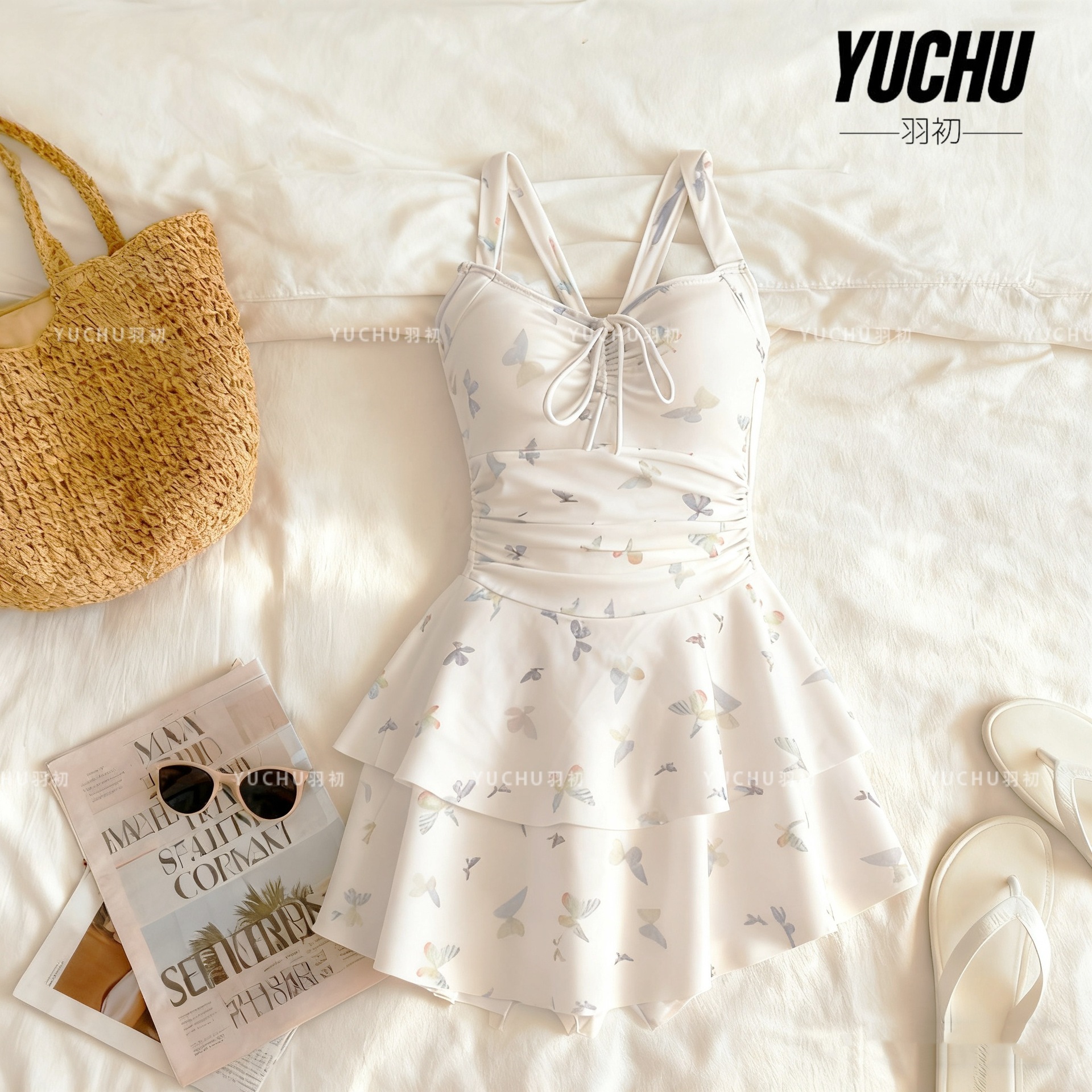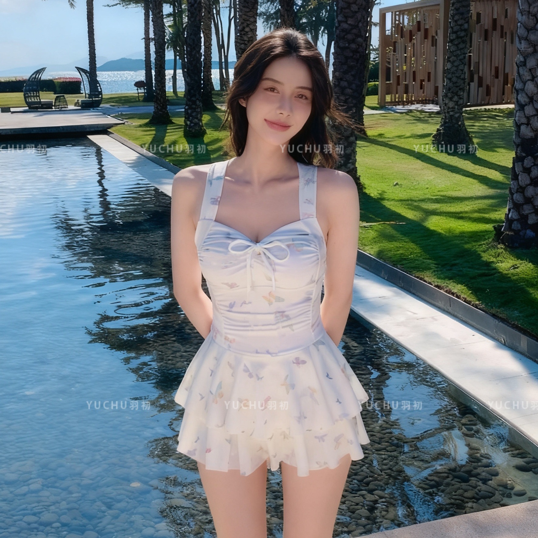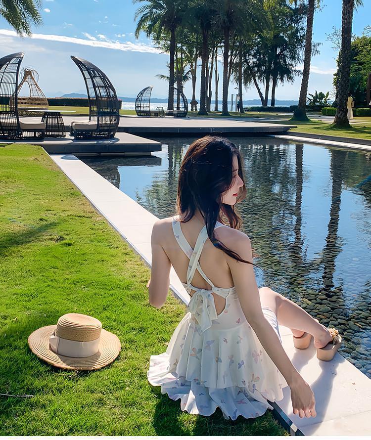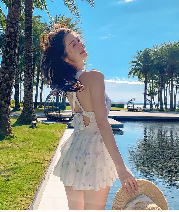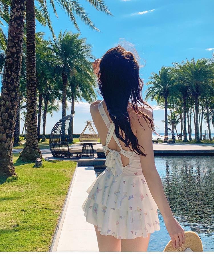 2025泳衣新款连体裙式遮肚显瘦保守蝴蝶印花少女泳装泡温泉度假