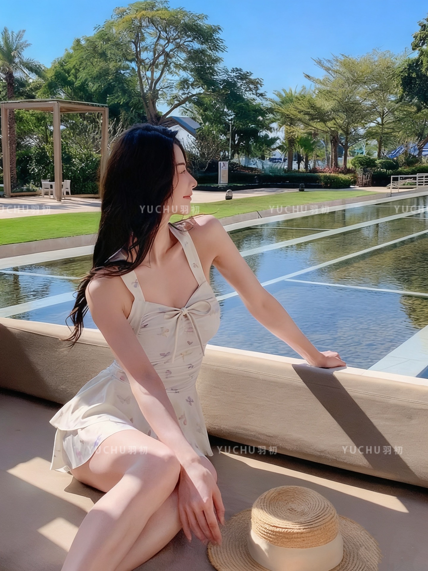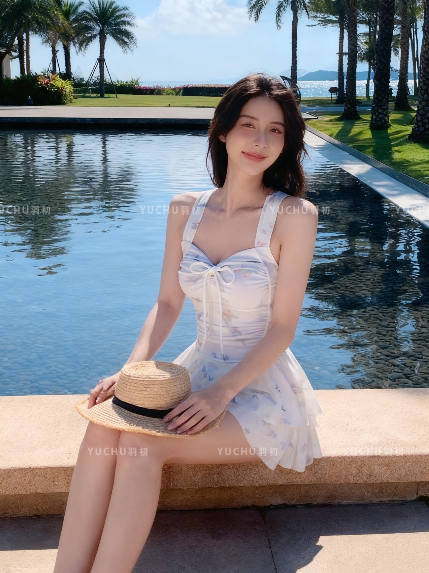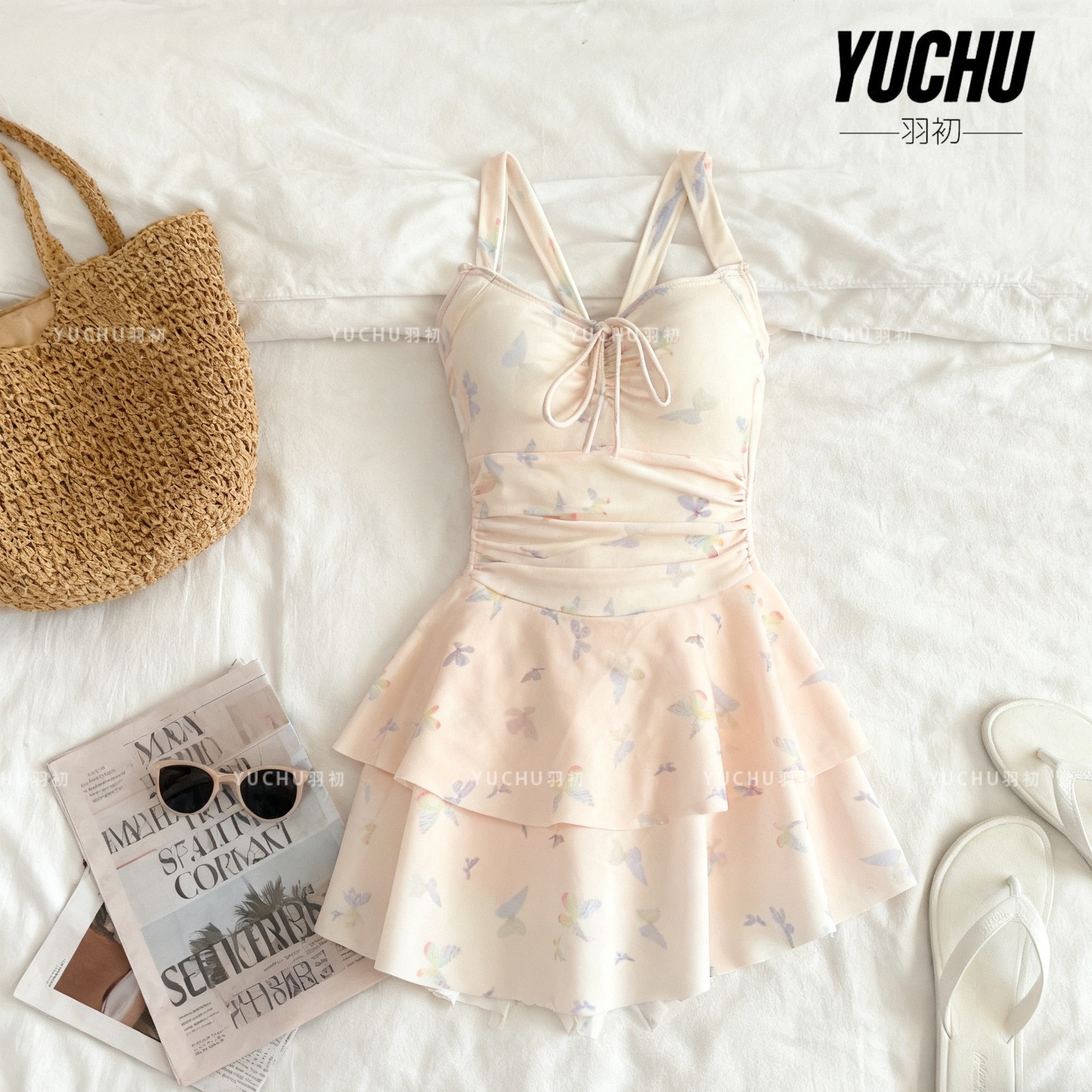 2025泳衣新款连体裙式遮肚显瘦保守蝴蝶印花少女泳装泡温泉度假