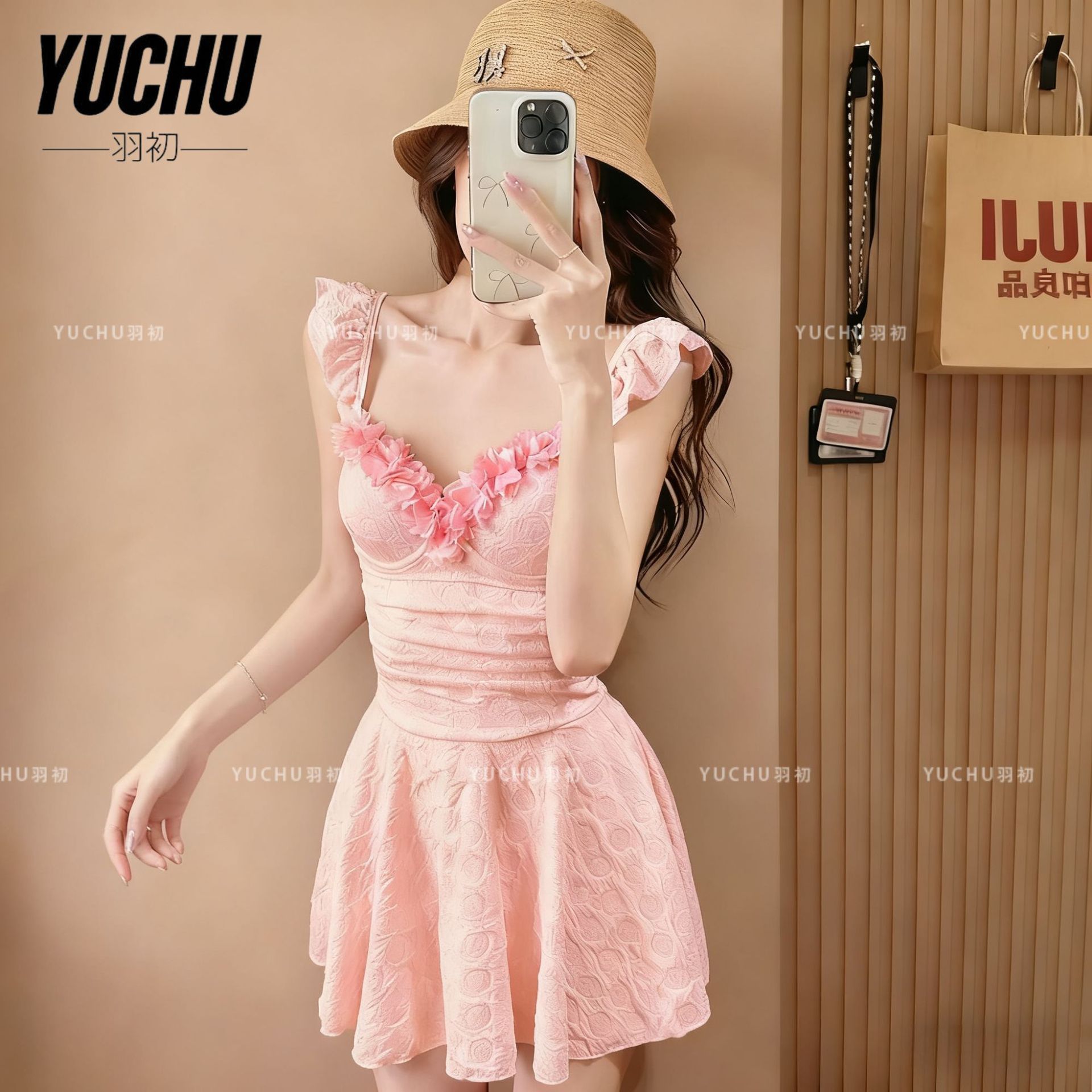 2026新款奶乎乎baby蓝纯欲遮肉显瘦连体荷叶边保守聚拢度假泳衣女