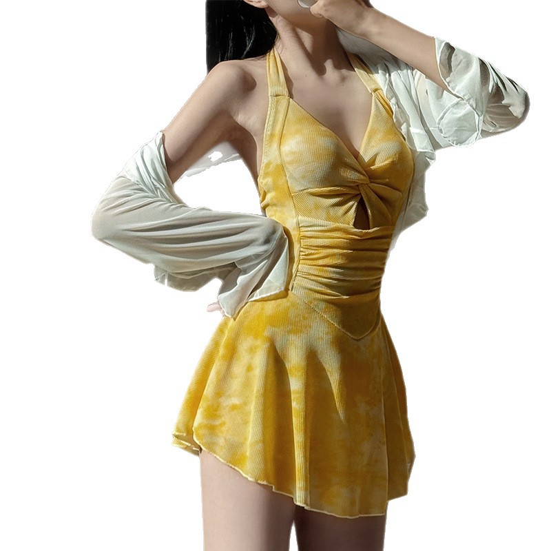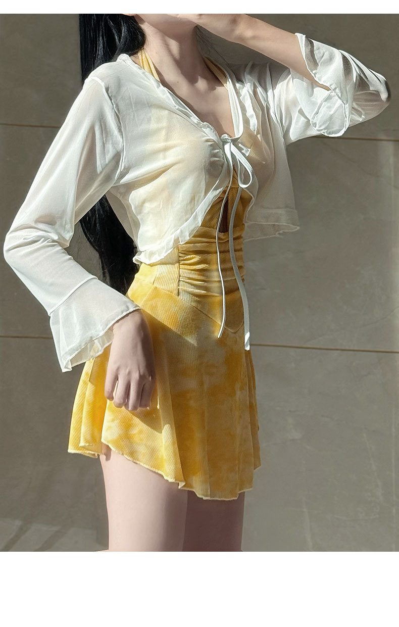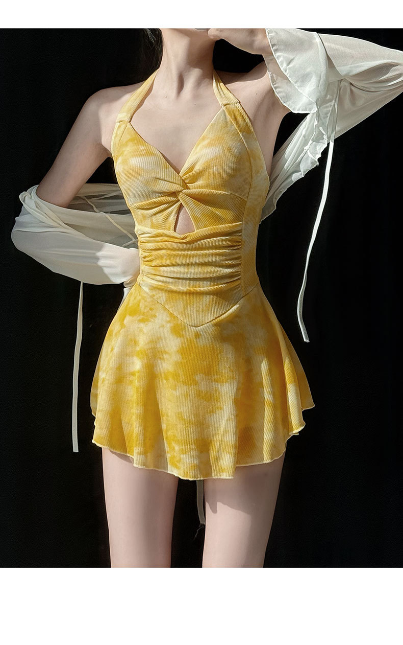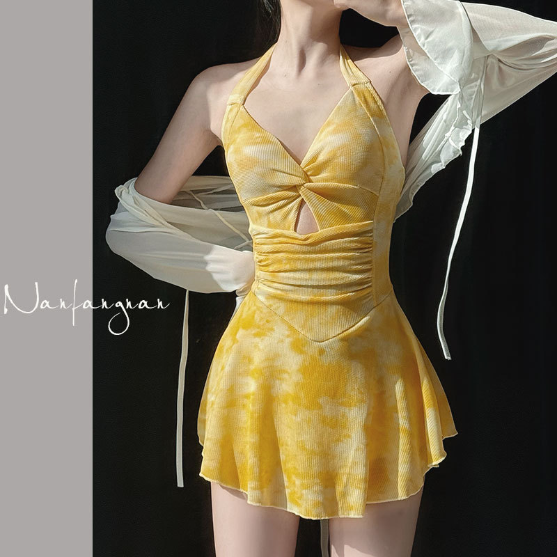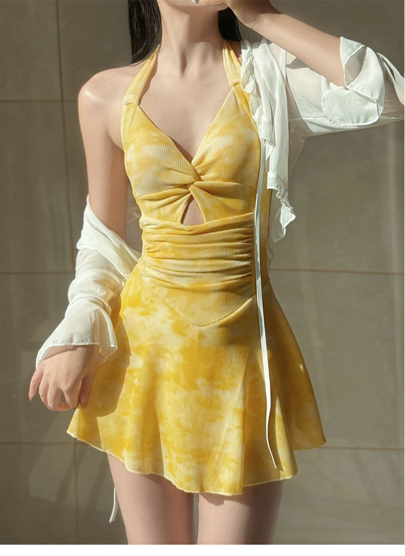 2025年泳衣女新款开衫跨境辣妹挂脖裙式连体遮肚显瘦两件套绑带夏