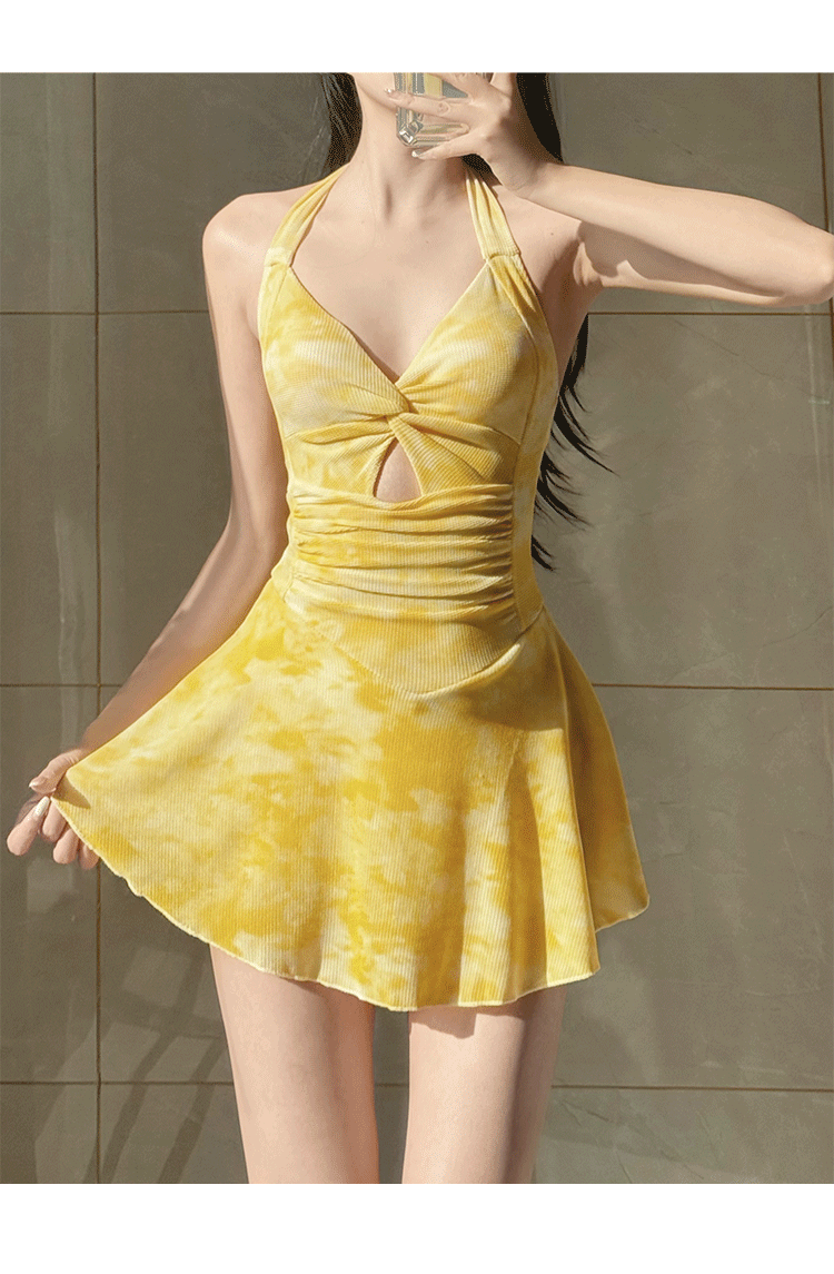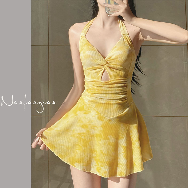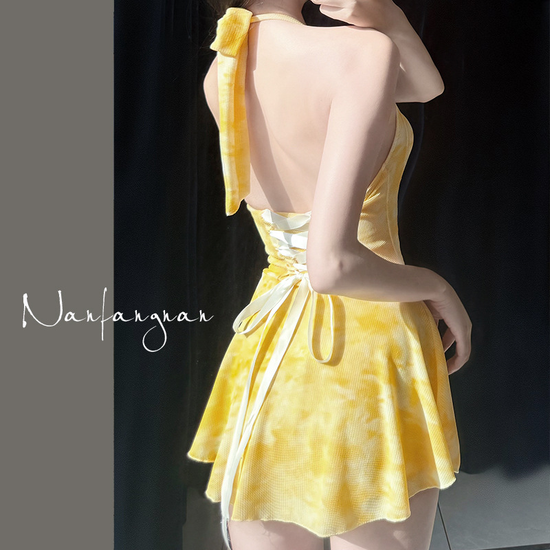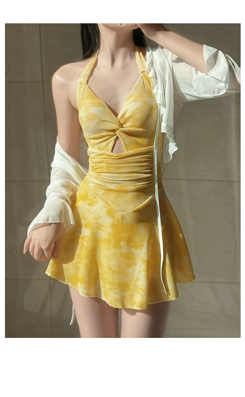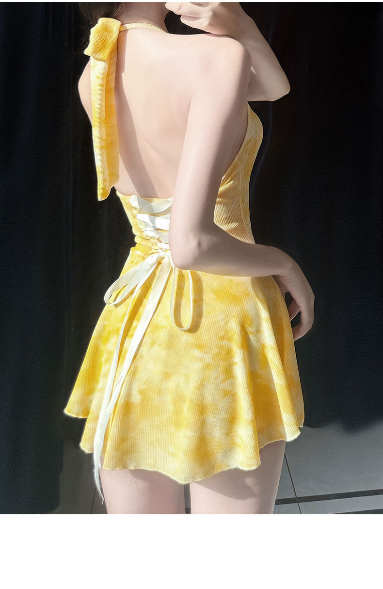 2025年泳衣女新款开衫跨境辣妹挂脖裙式连体遮肚显瘦两件套绑带夏