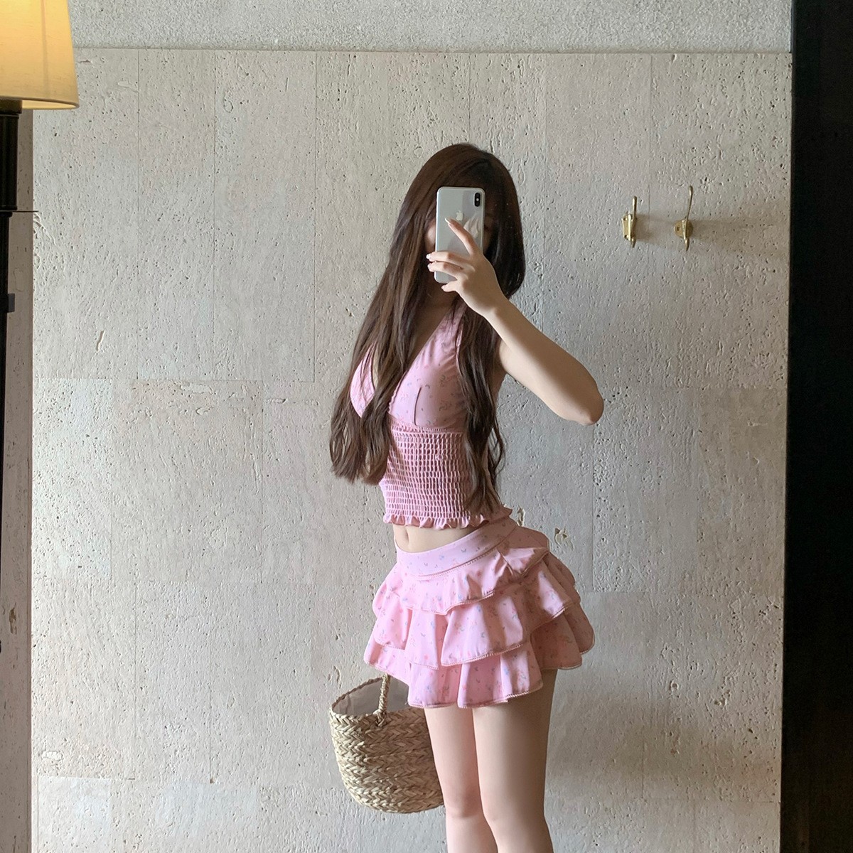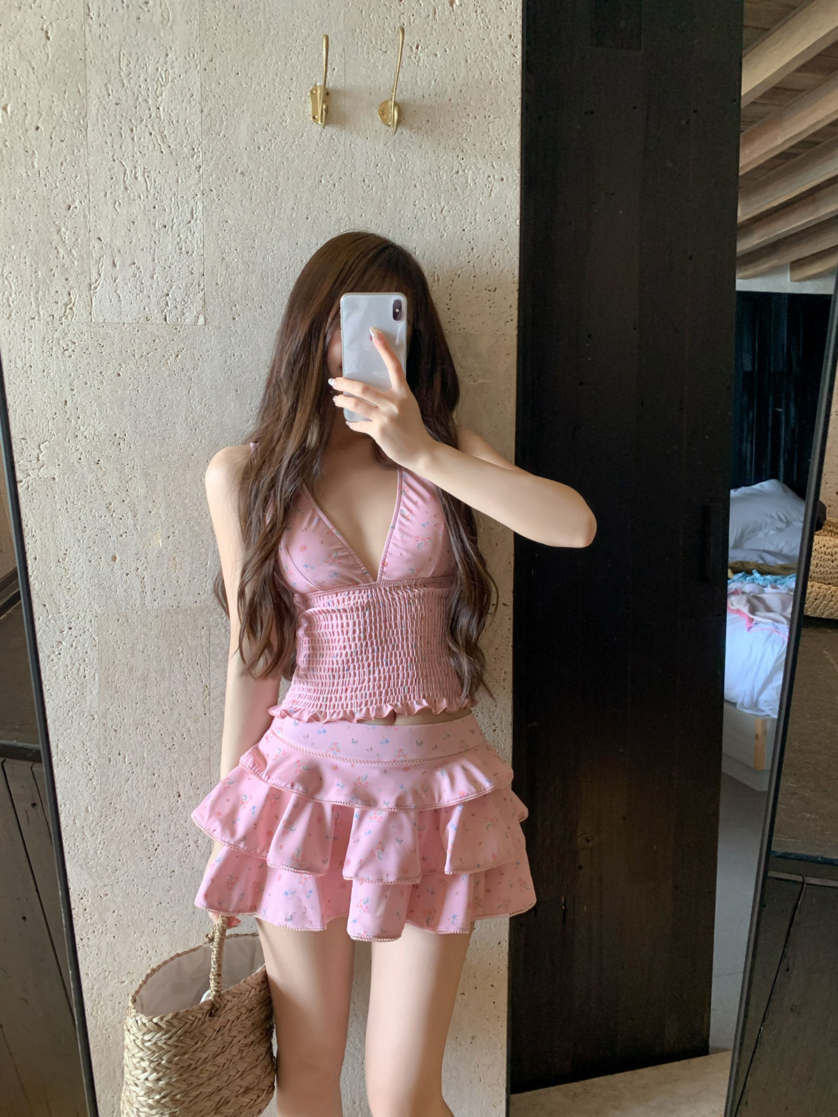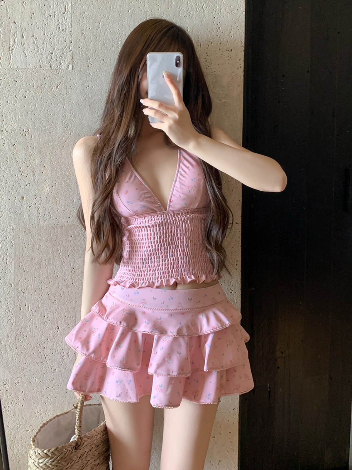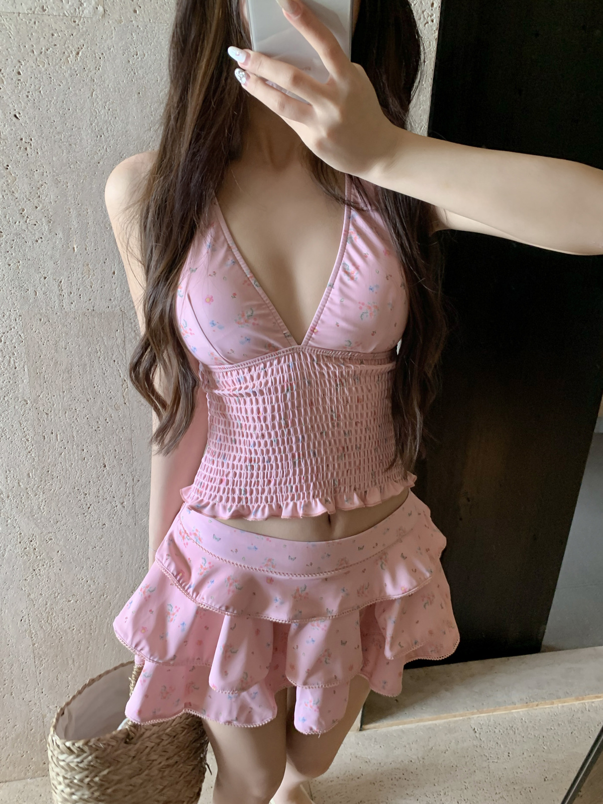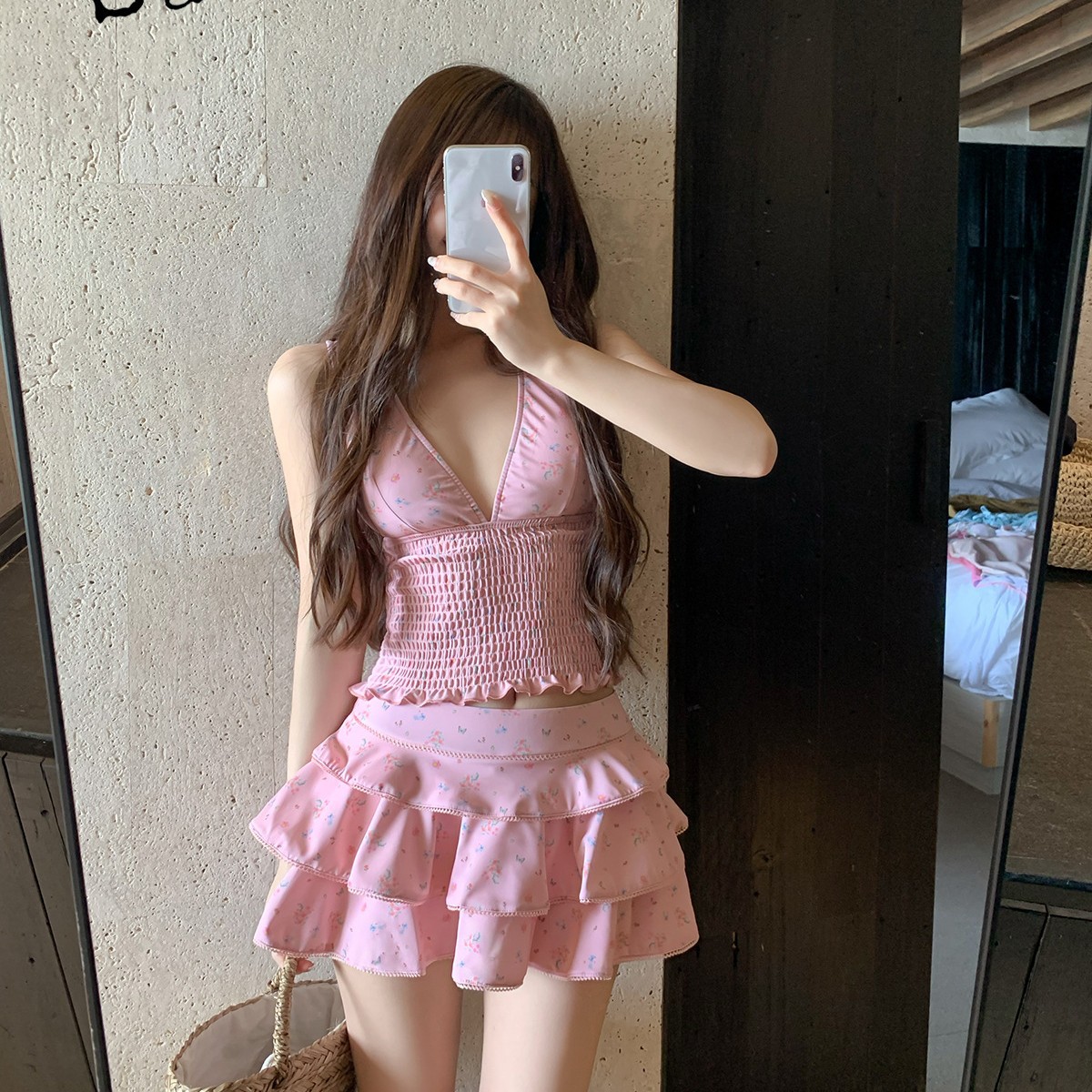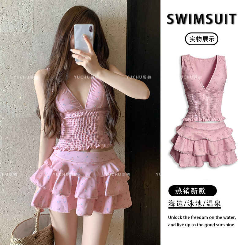 纯欲风粉色碎花分体裙式保守游泳衣蛋糕裙可爱甜美遮肉显瘦泡温泉