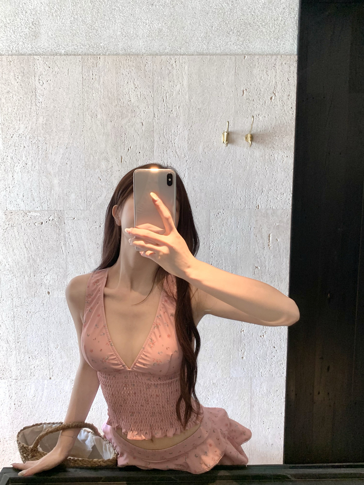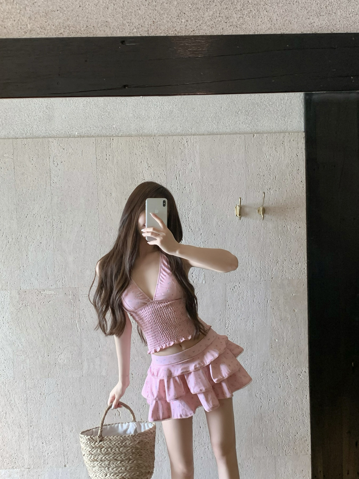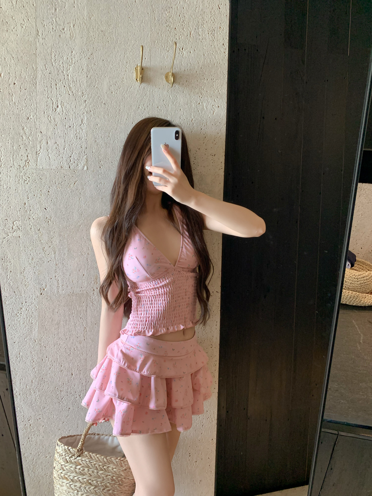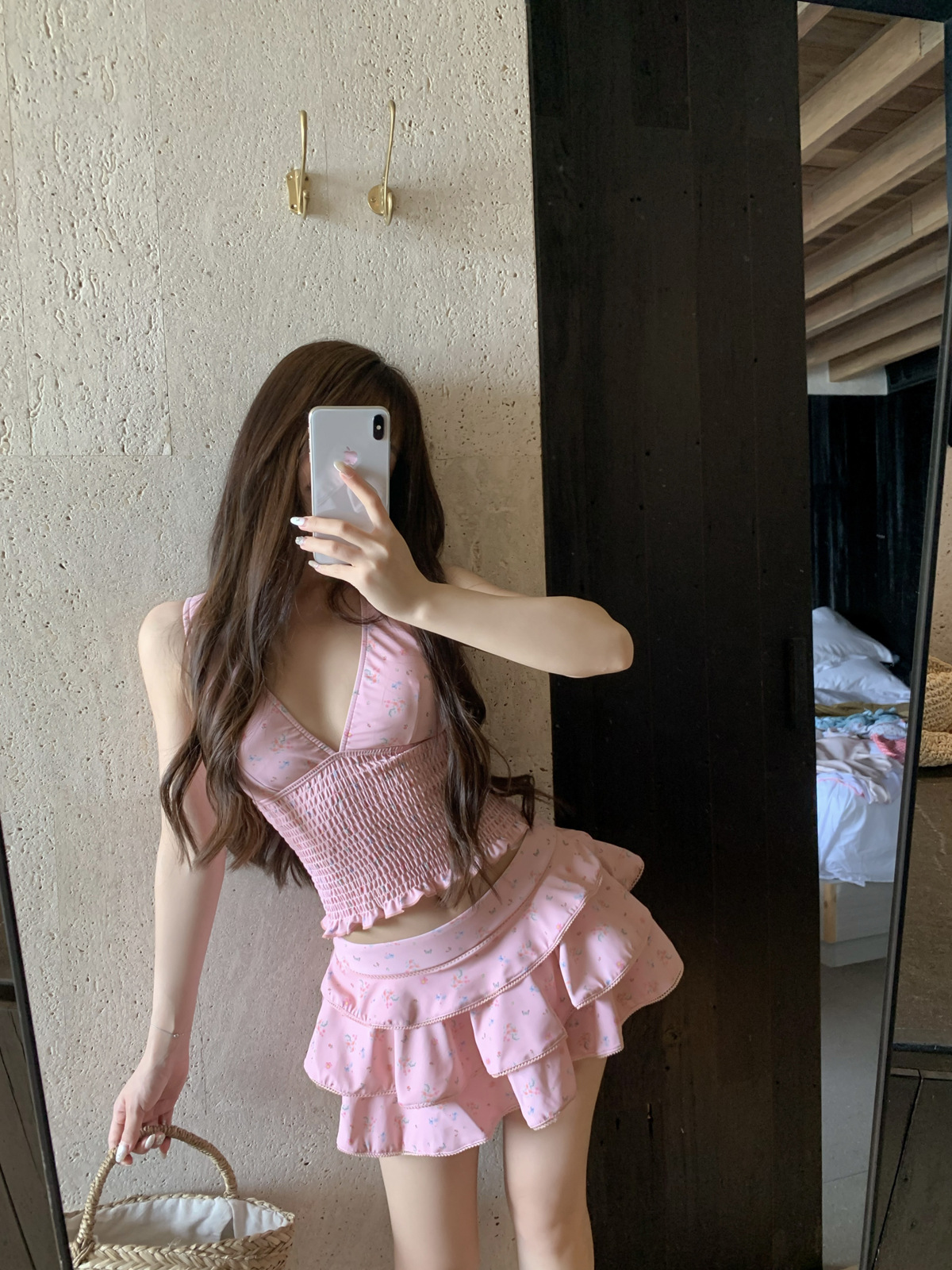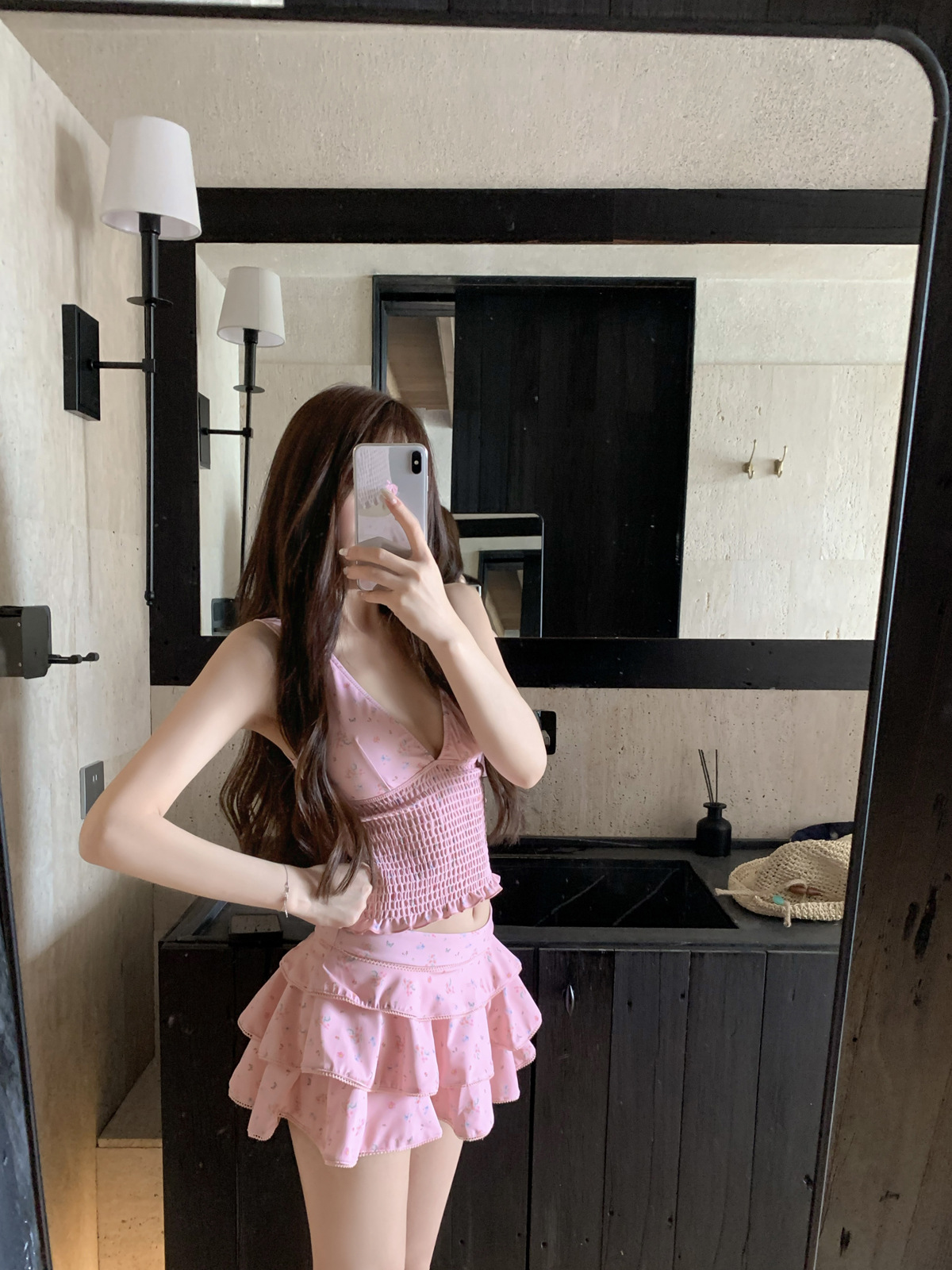 纯欲风粉色碎花分体裙式保守游泳衣蛋糕裙可爱甜美遮肉显瘦泡温泉