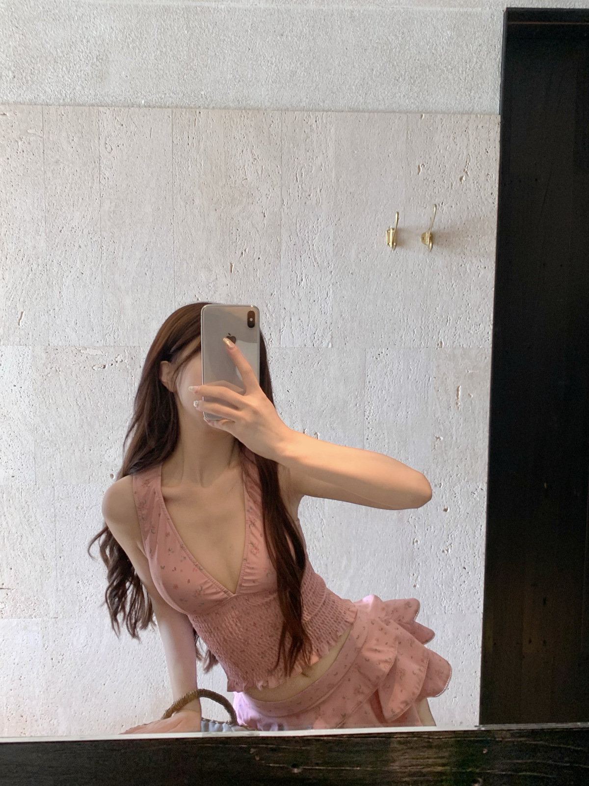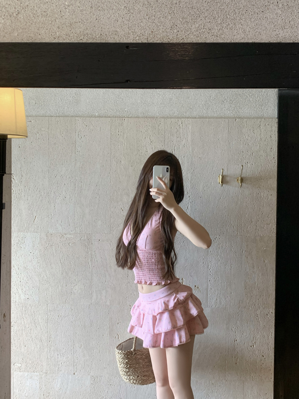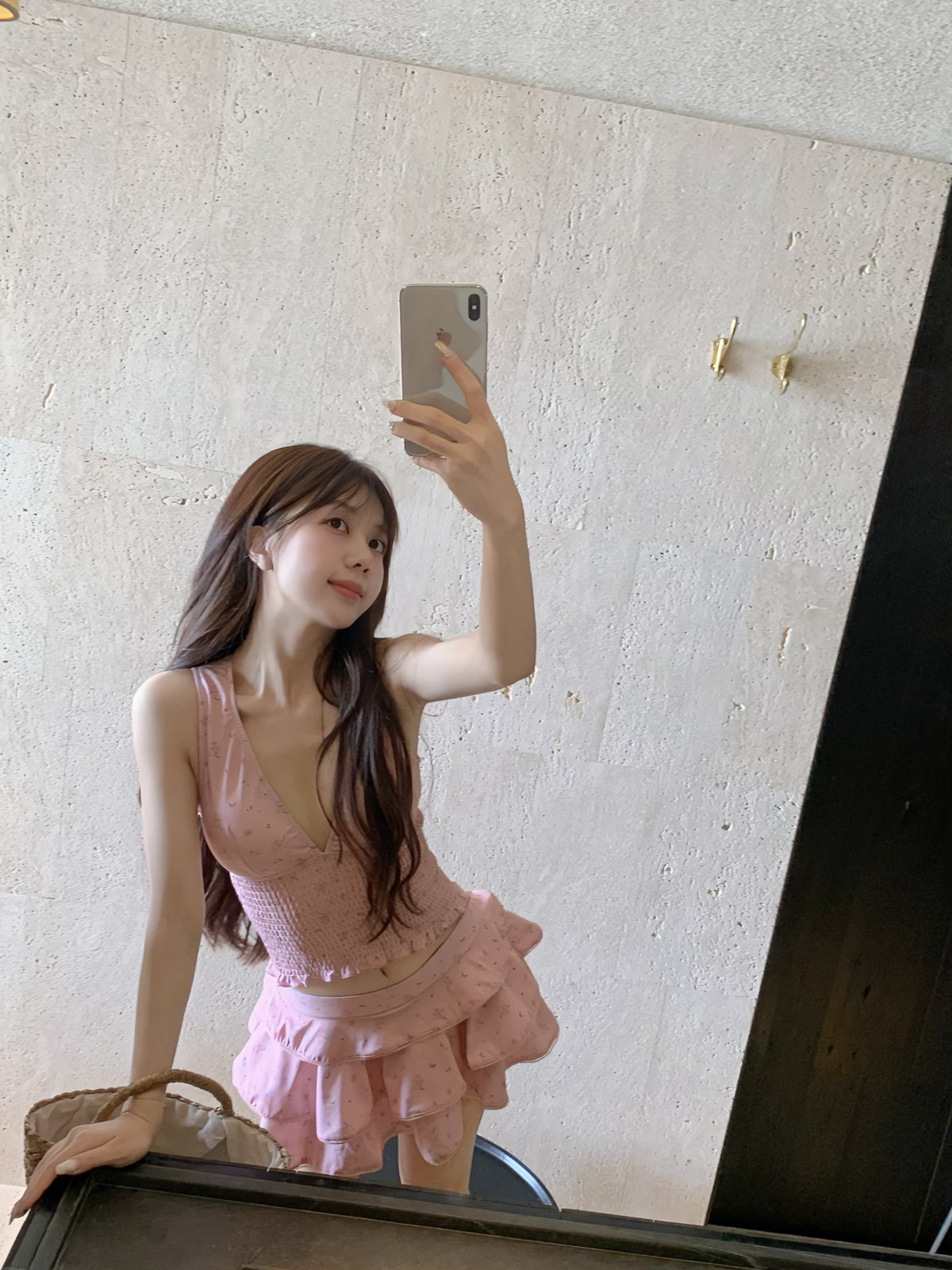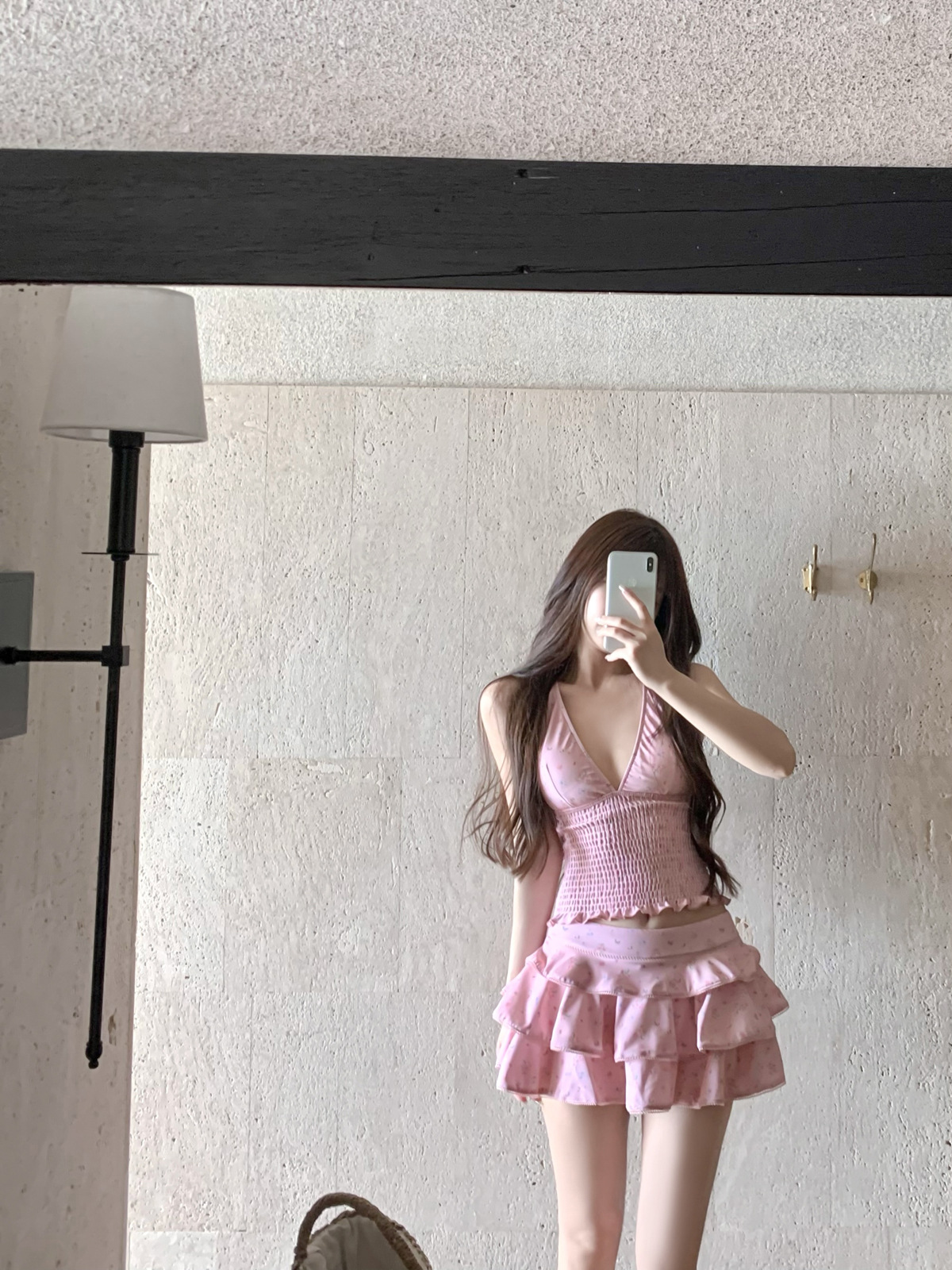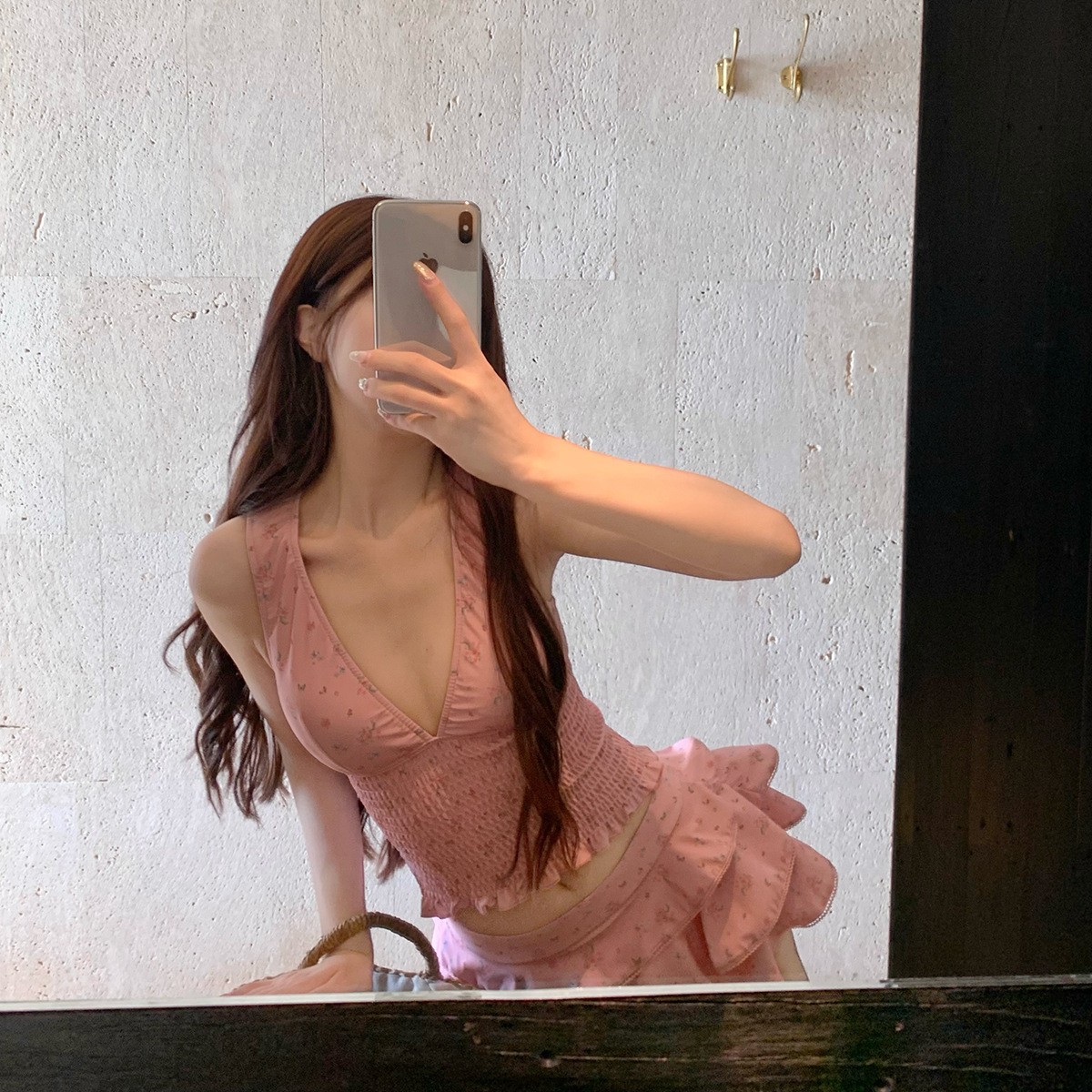 纯欲风粉色碎花分体裙式保守游泳衣蛋糕裙可爱甜美遮肉显瘦泡温泉