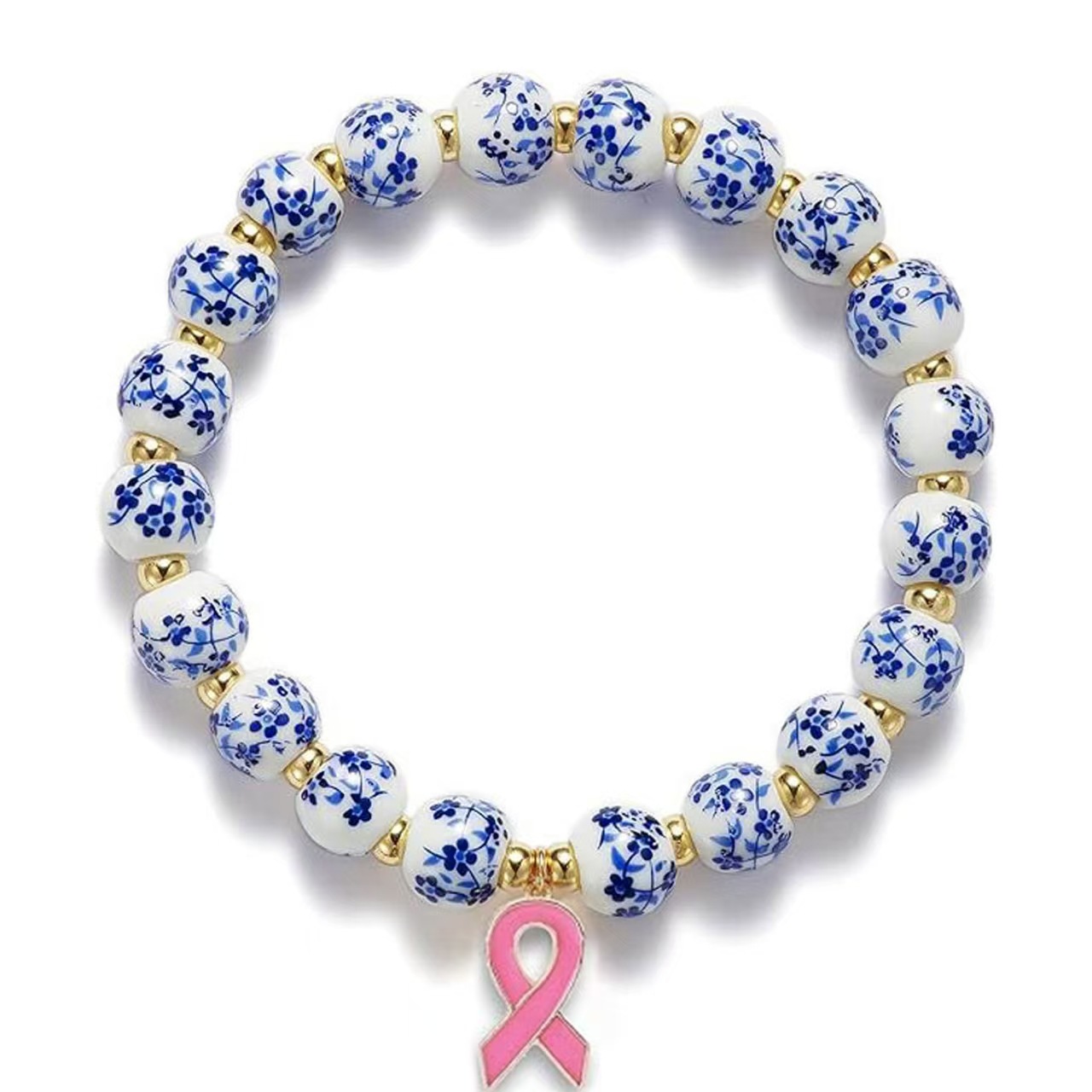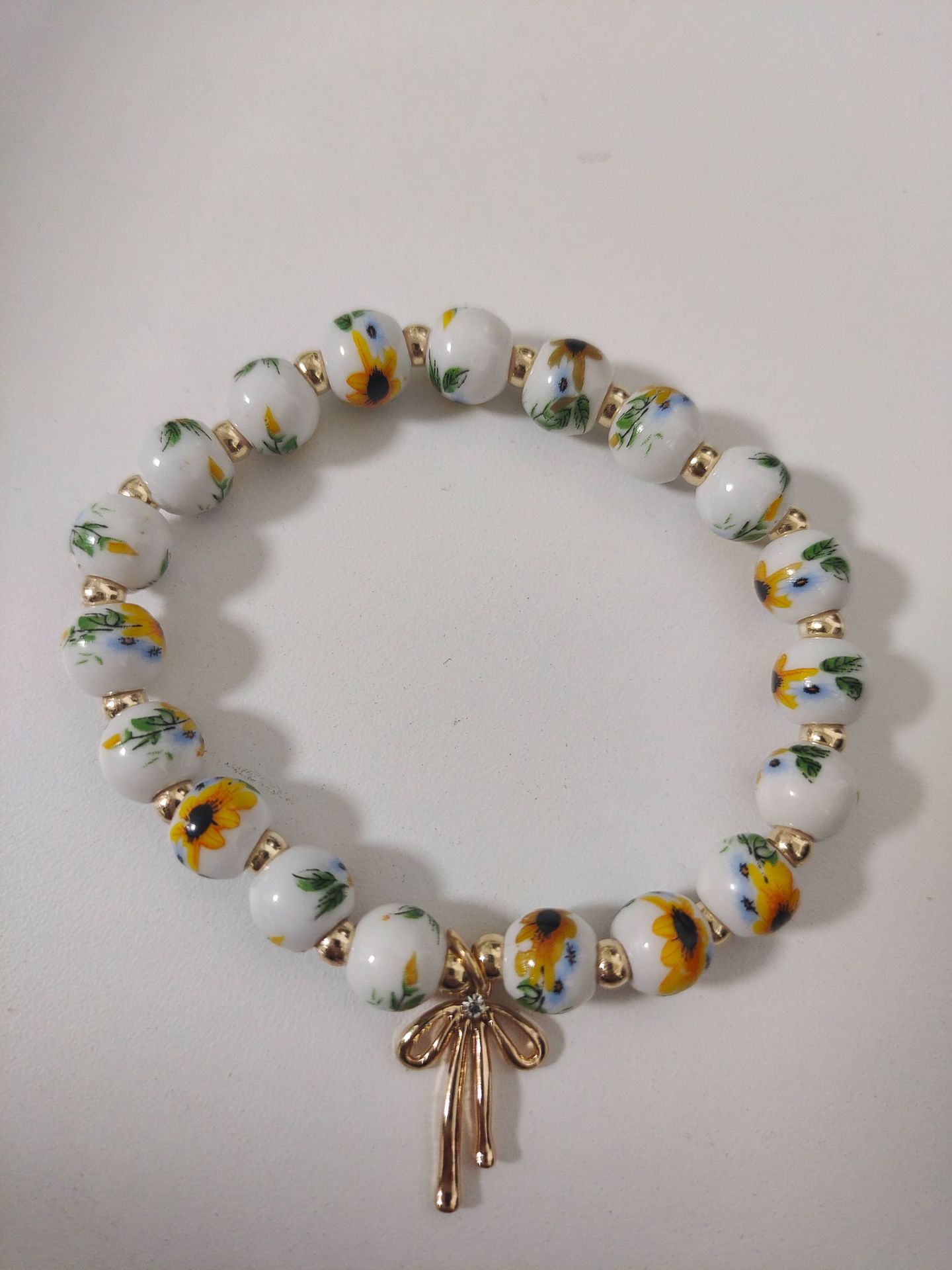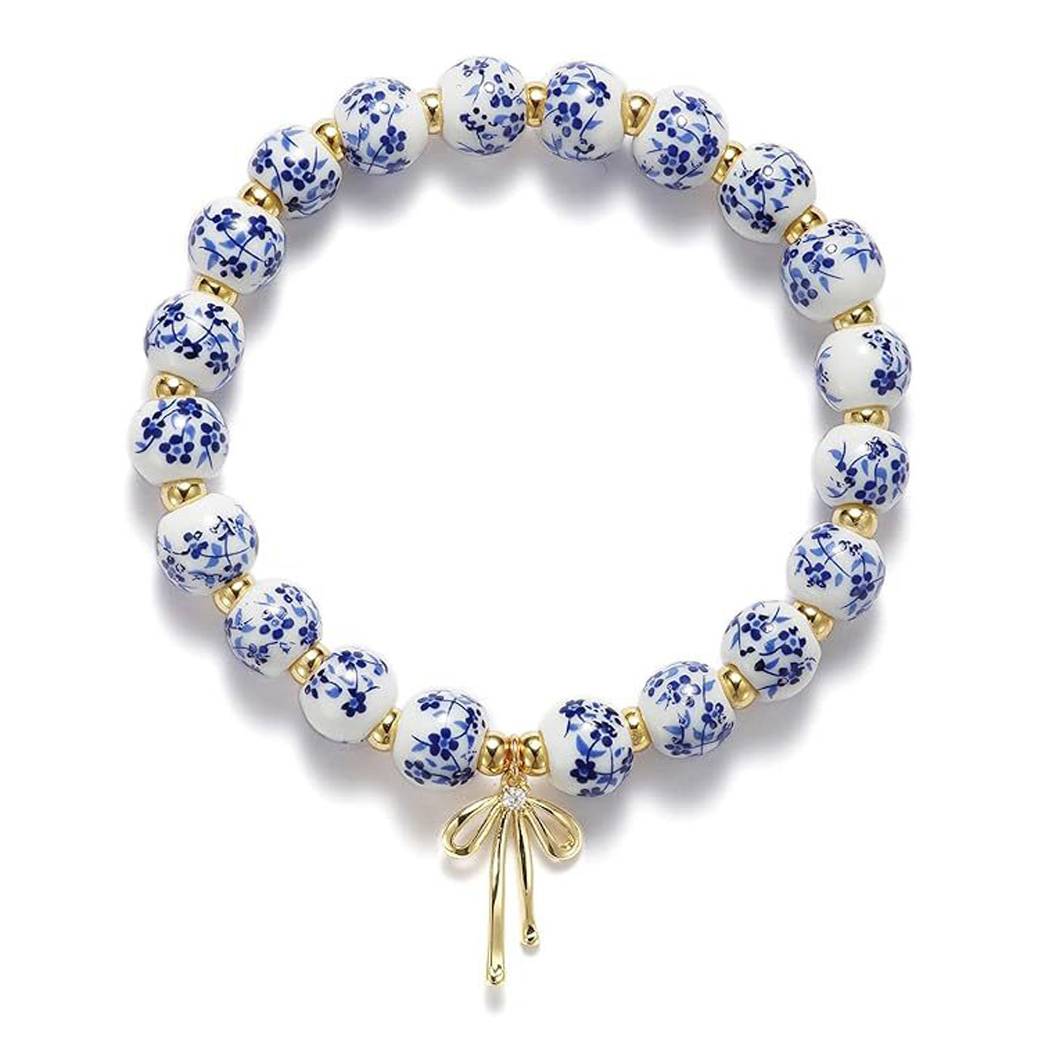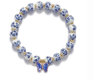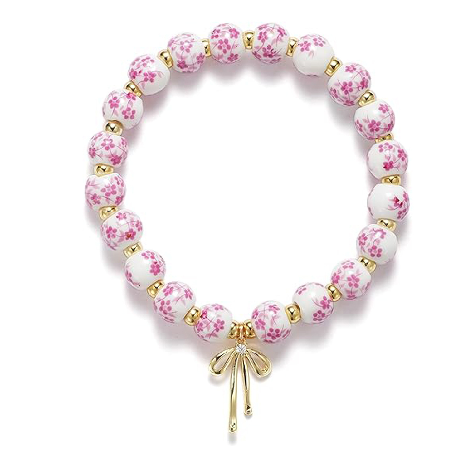 陶瓷碎花珠手链镶钻蝴蝶结金珠串珠弹力绳手链粉色陶瓷珠领结手链