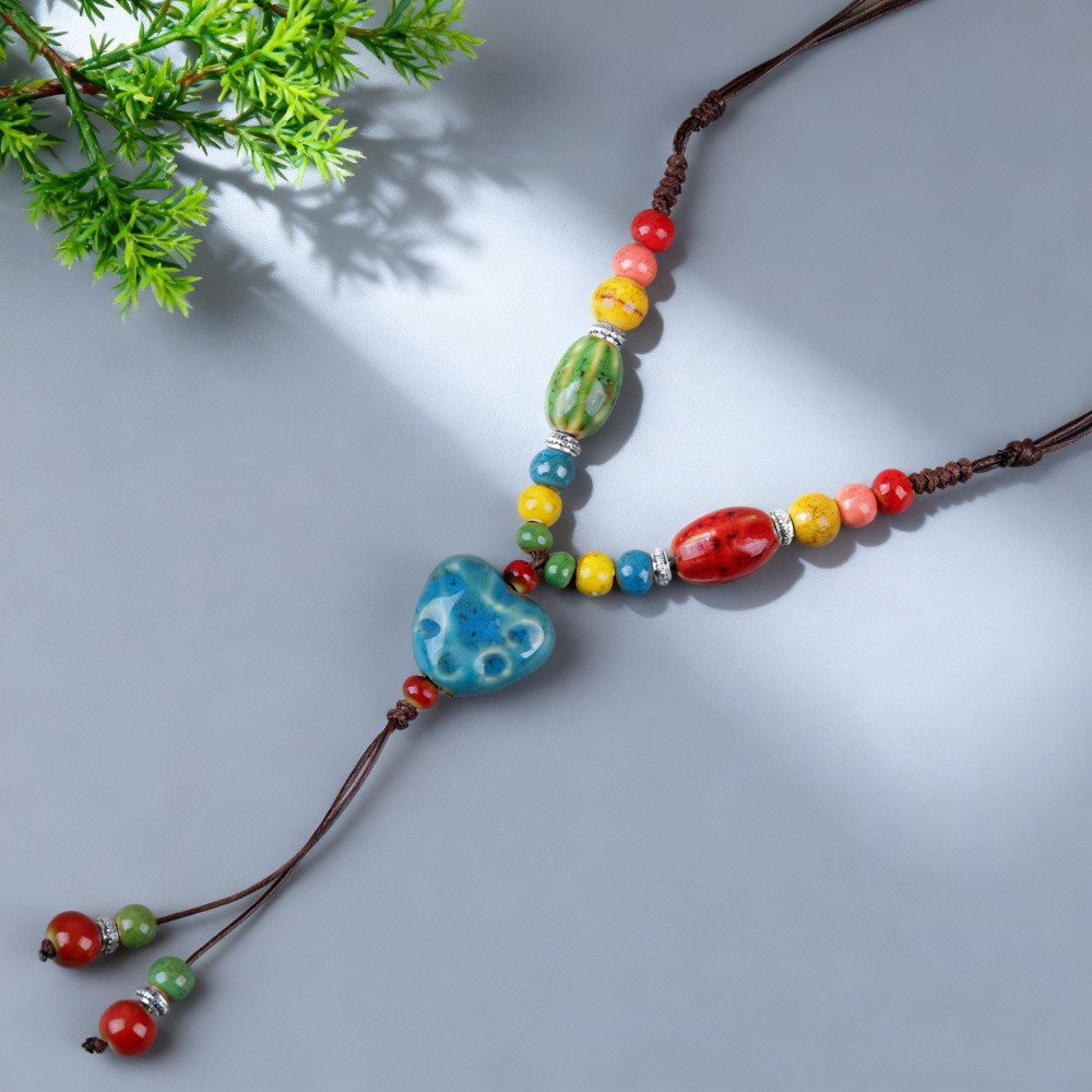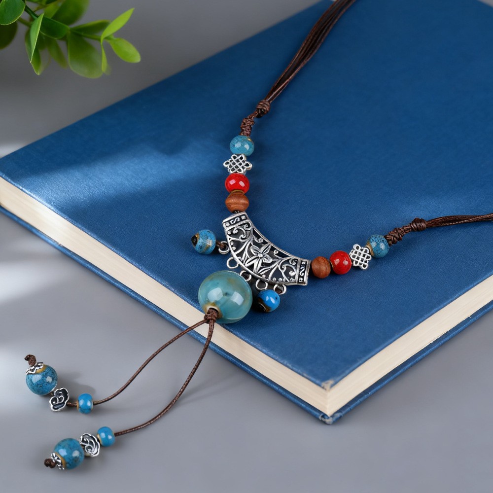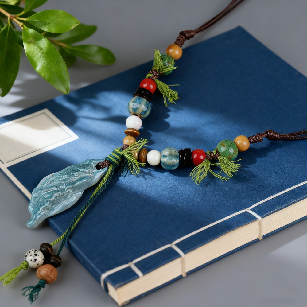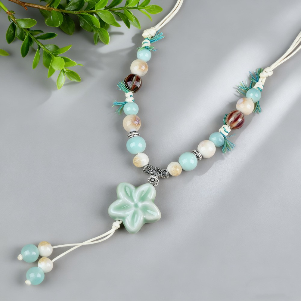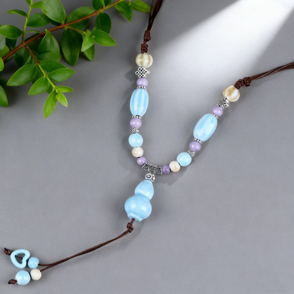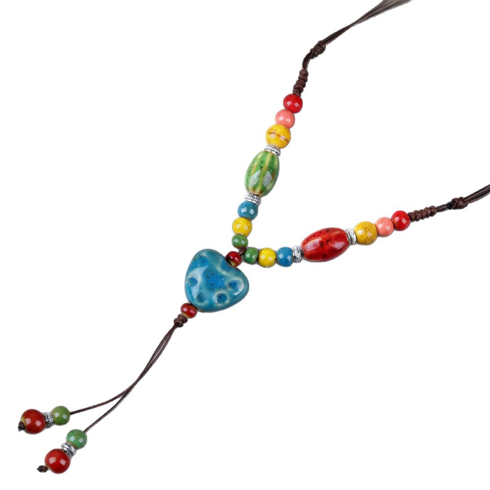 新中式长款陶瓷串珠项链女复古风禅意编织毛衣链跨境百搭锁骨链潮