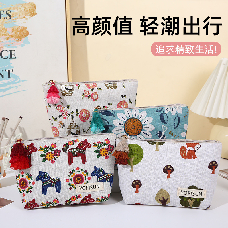 新款化妆包女大容量便捷收纳包高级感流苏印花洗漱袋布艺零钱包