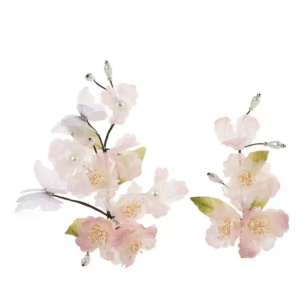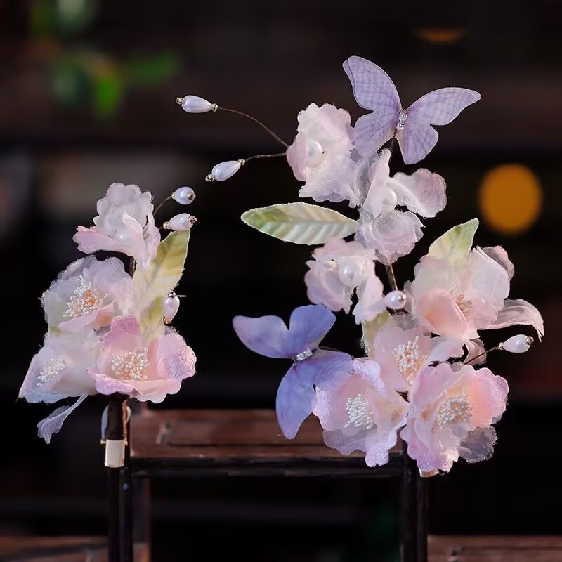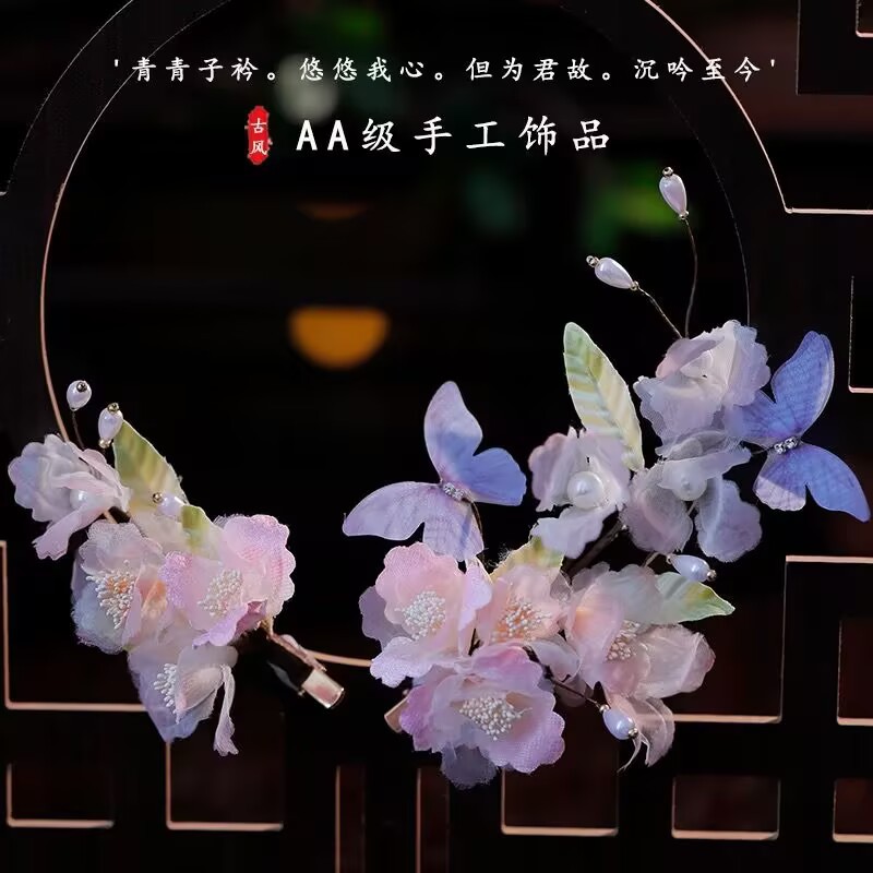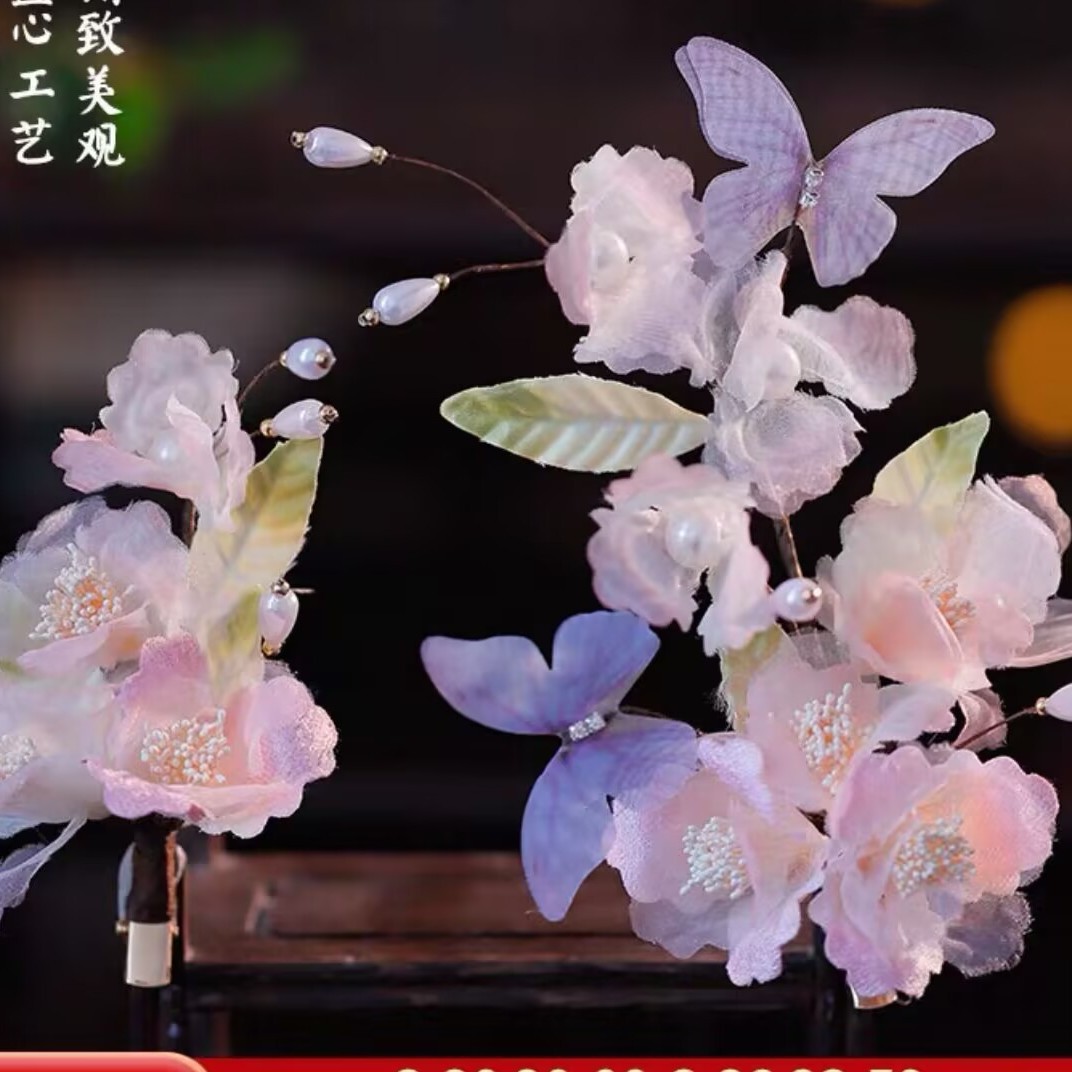 新款古风原创设计纯手工制作粉色纱花蓝色蝴蝶软杆发夹汉服头饰