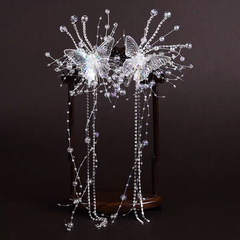 韩式新娘头饰水晶发夹蝴蝶流苏对夹主婚纱拍婚纱照旅拍发饰配饰品