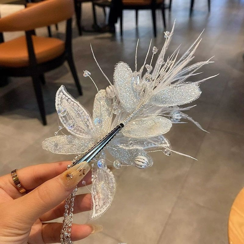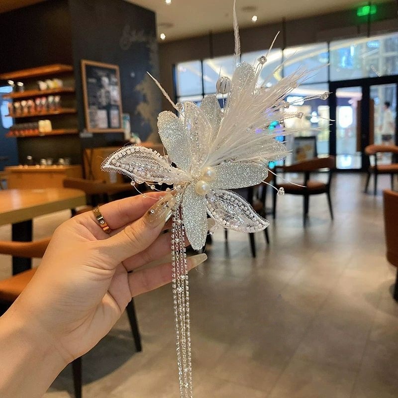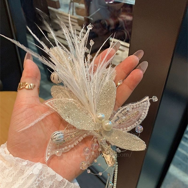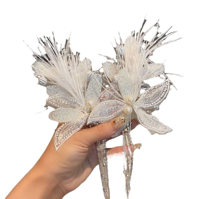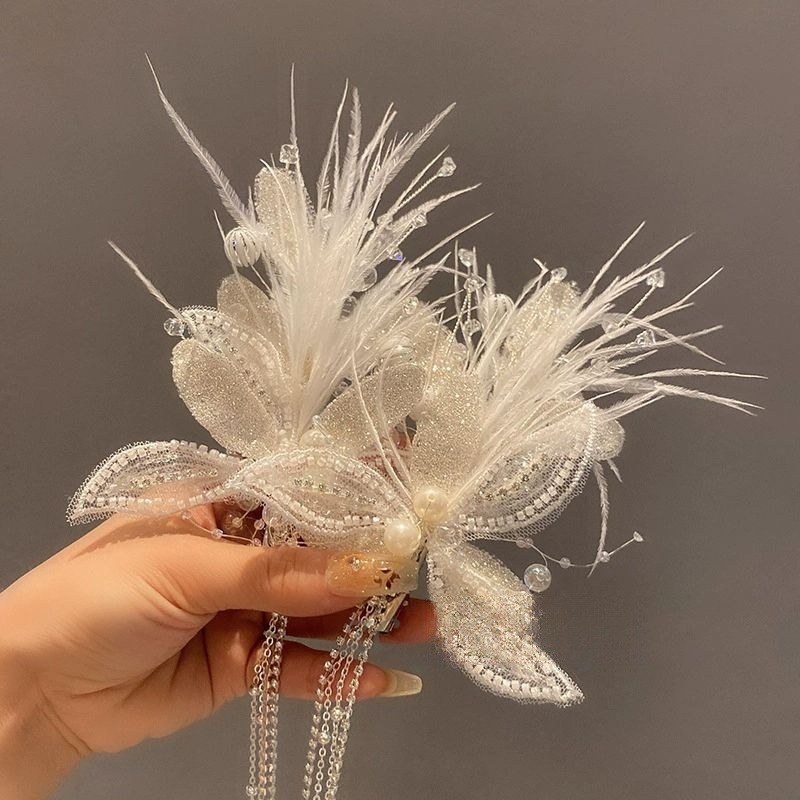 超仙羽毛水钻流苏发夹精致优雅蝴蝶侧边夹刘海夹气质新娘发饰发卡