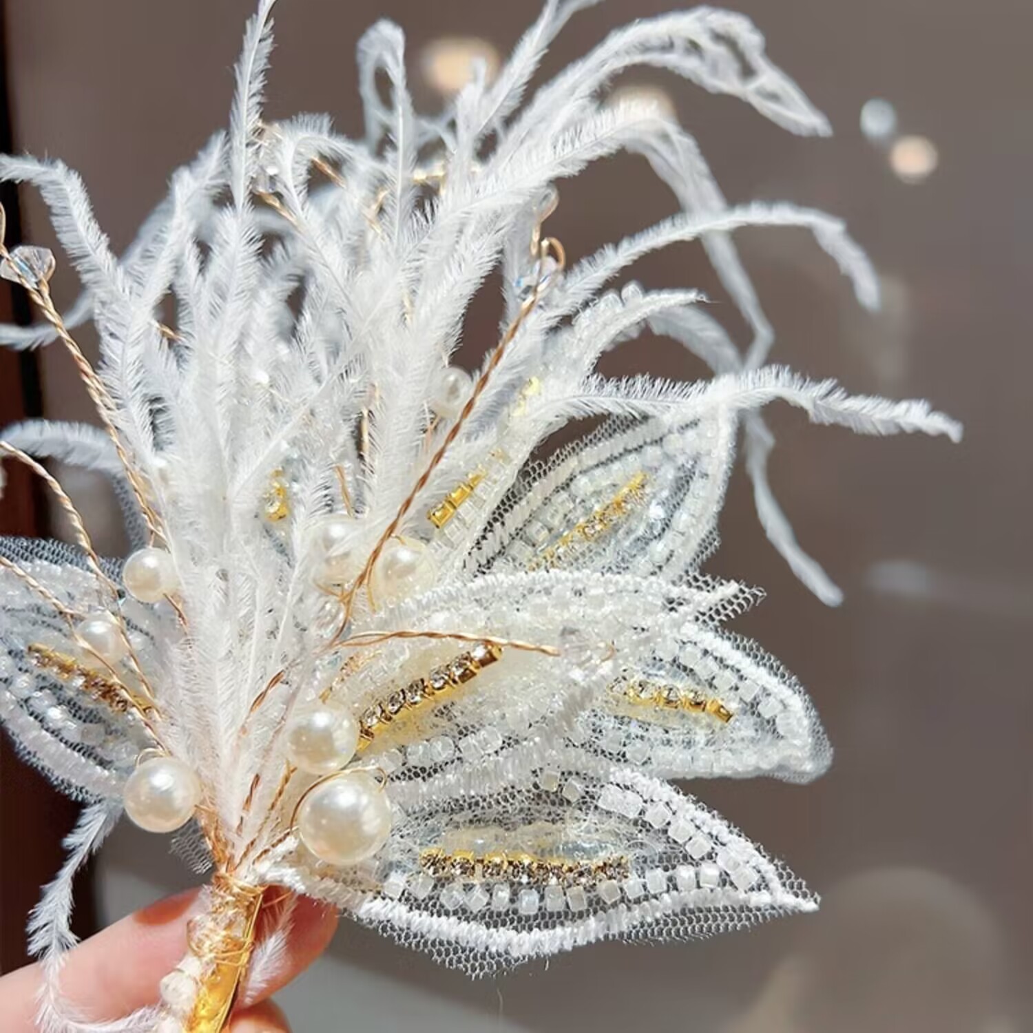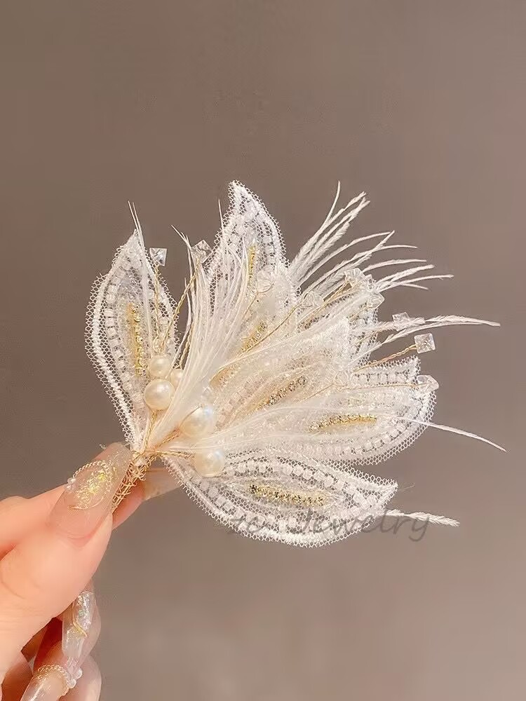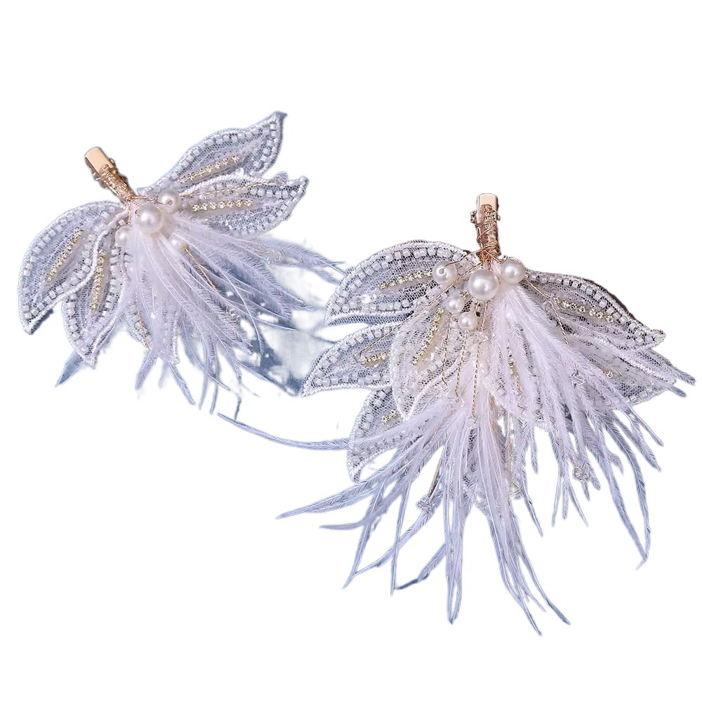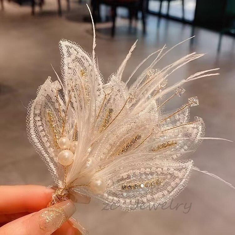 新款镶钻网纱米珠儿童发夹羽毛珍珠鸭嘴夹套装时尚新娘边夹发卡饰